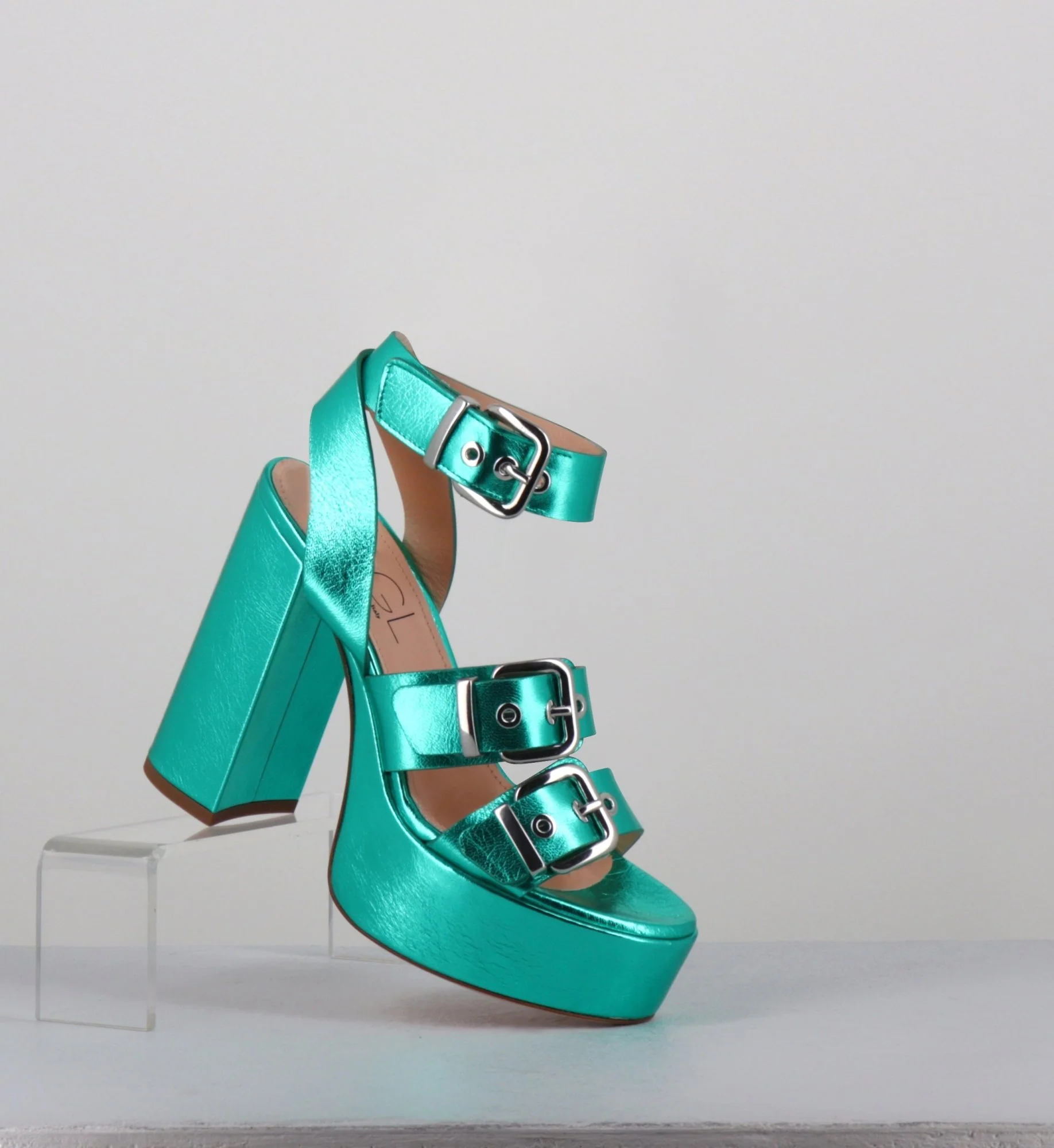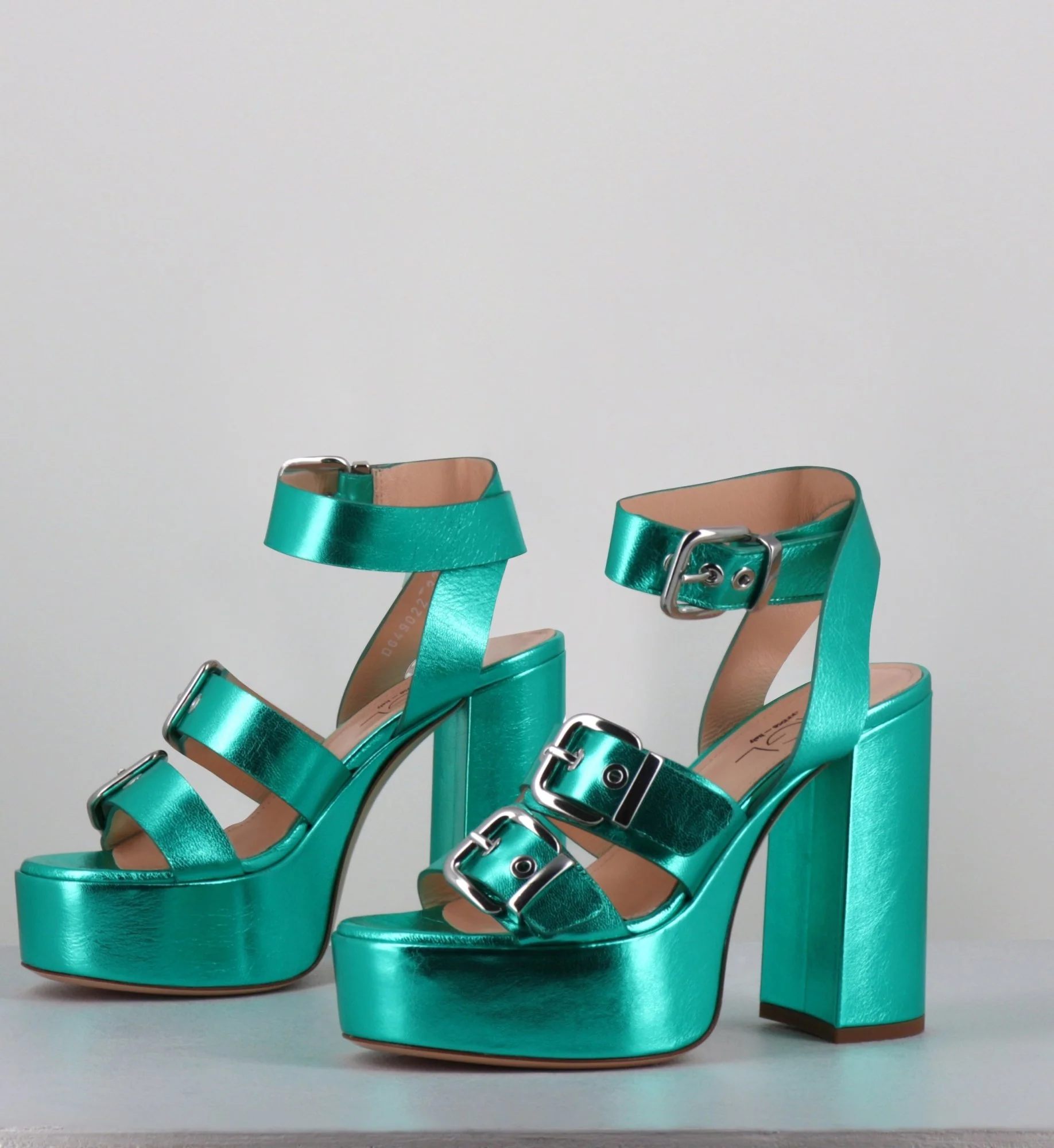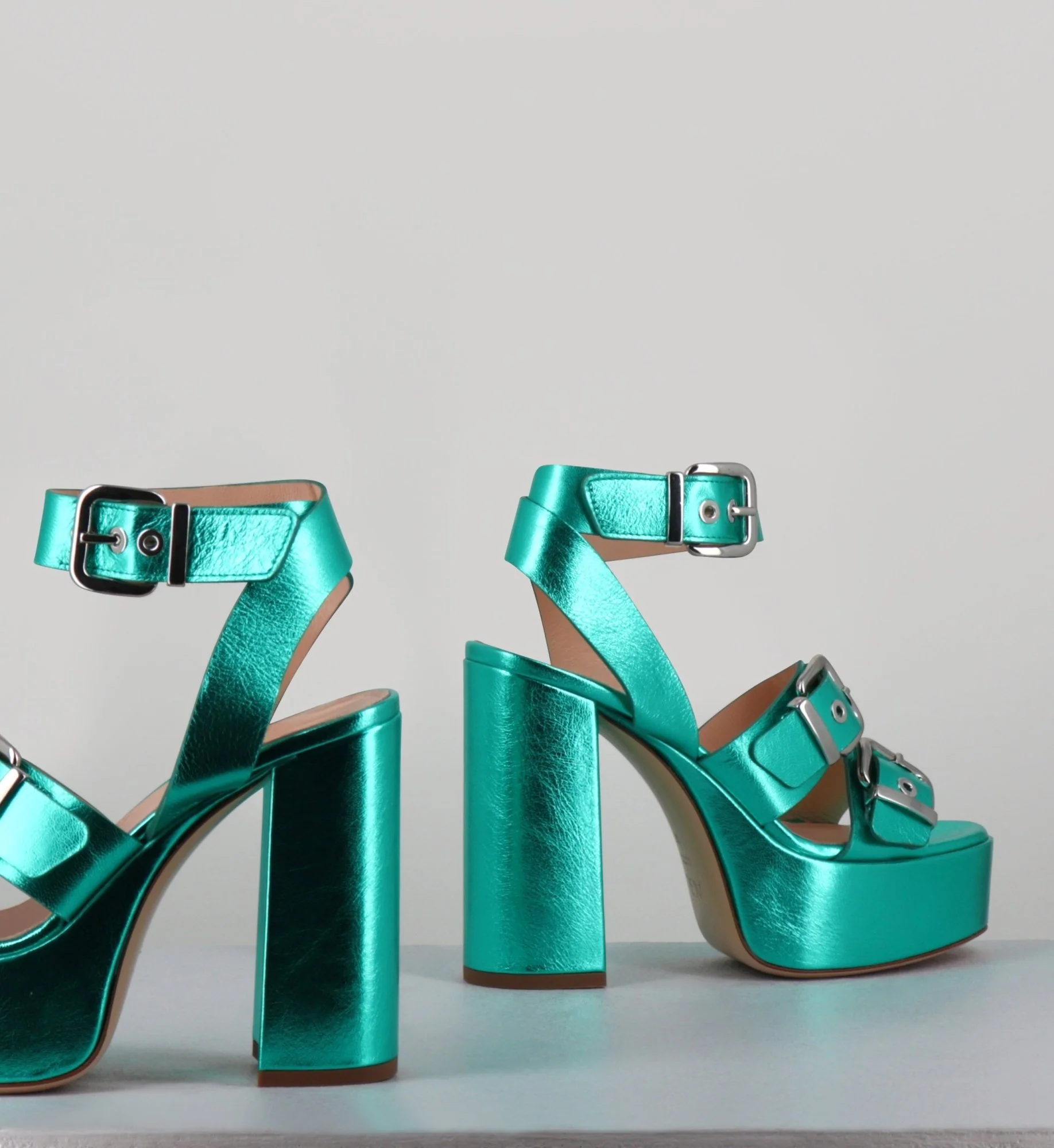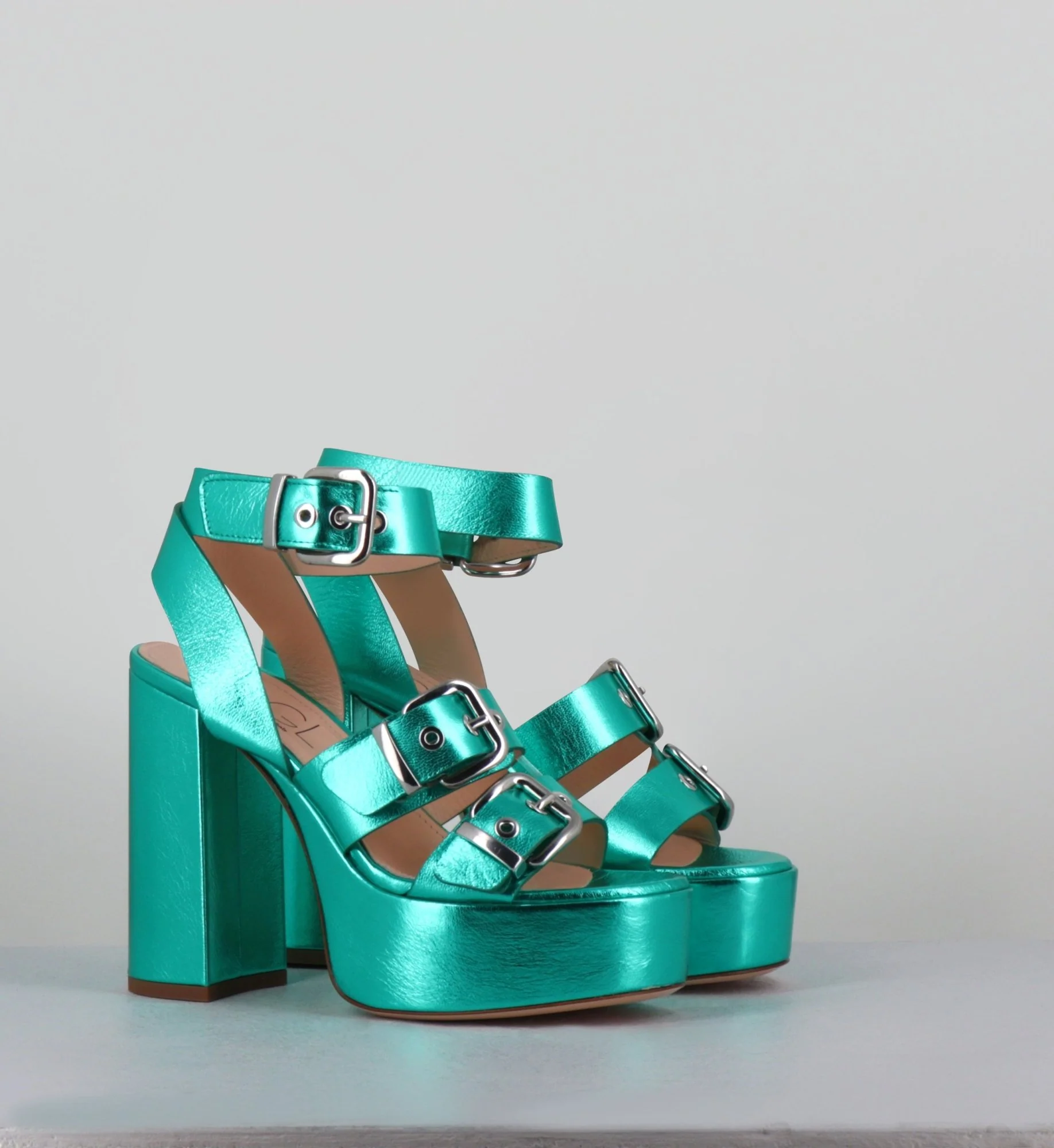 Sandales à plateforme cuir métallisé vert & boucles – PHILE CAULI