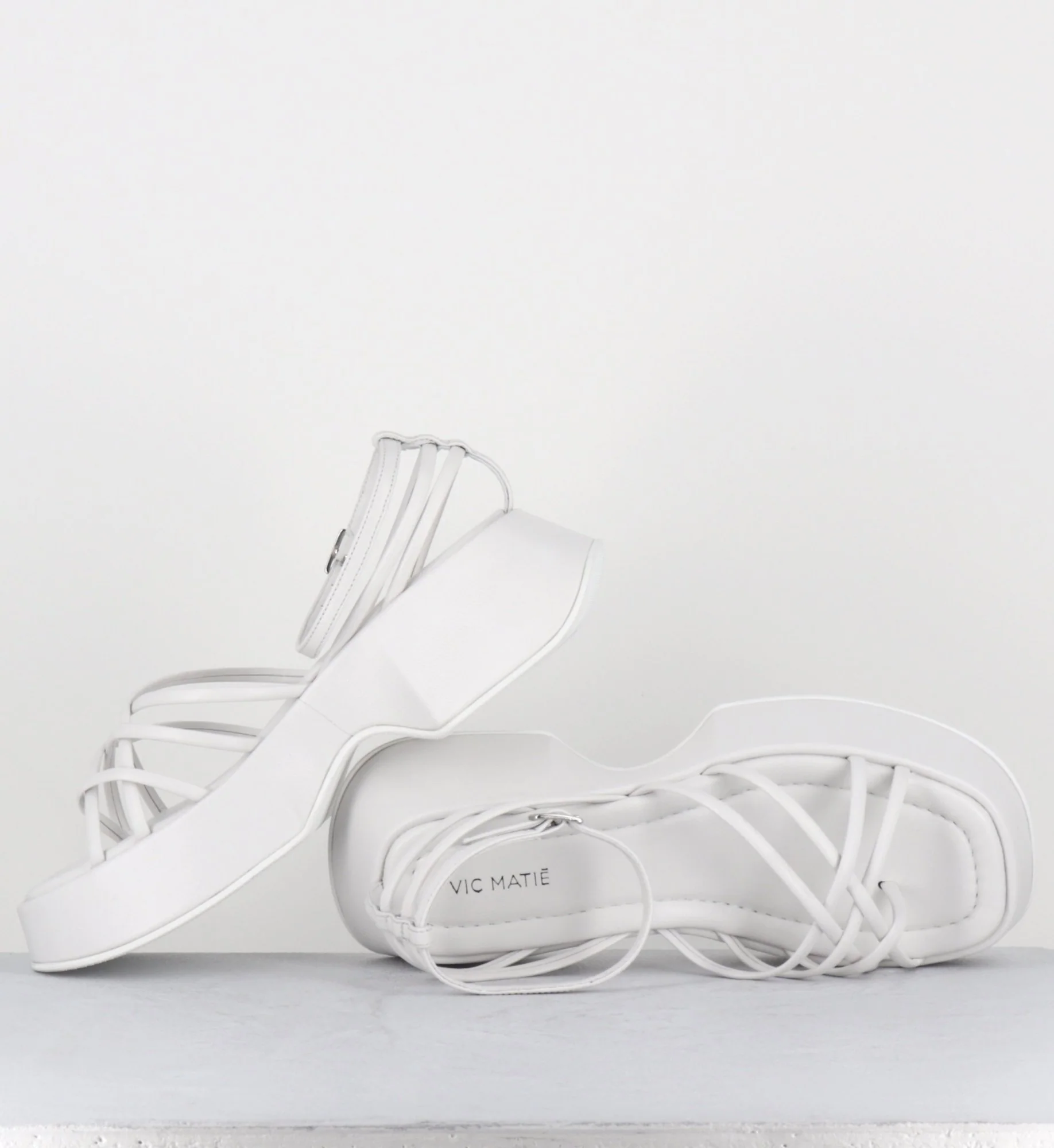 Sandales compensées en cuir blanc multi-brides & entre-doigts, montées sur une plateforme stylisée en micro fibre ultra légère recouverte Fabrication Artisanale Italienne – Ateliers Vic Matié Chausse normalement