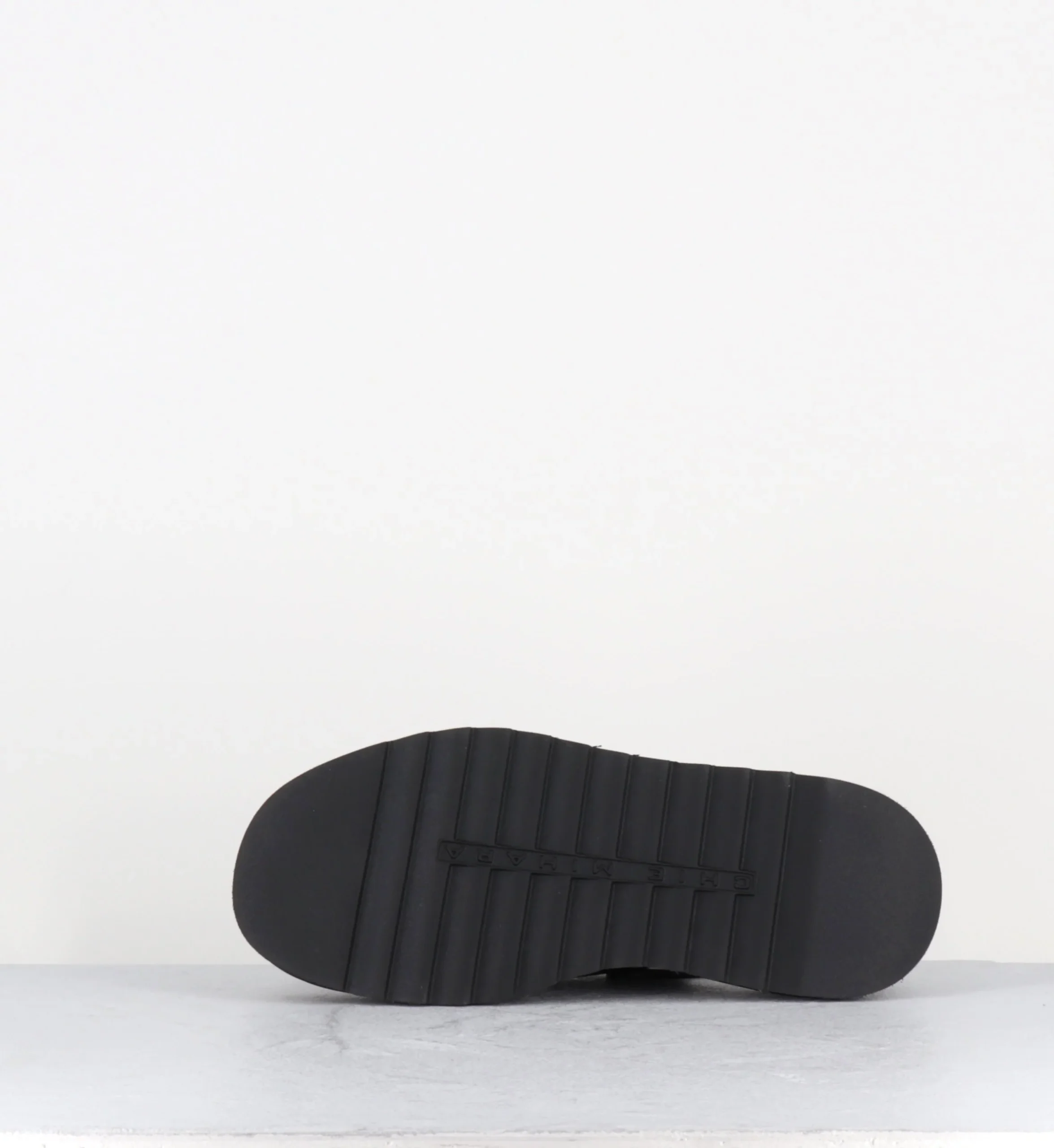 Sandales à plateforme compensée en cuir grainé noir, forme japonisante à bout carré arrondi, bride arrière réglable, semelle légère Fabrication Artisanale Espagnole – Ateliers Chie Mihara Chausse légèrement grand