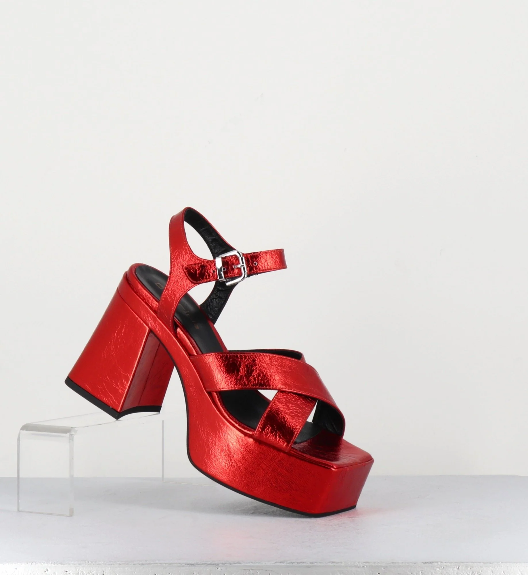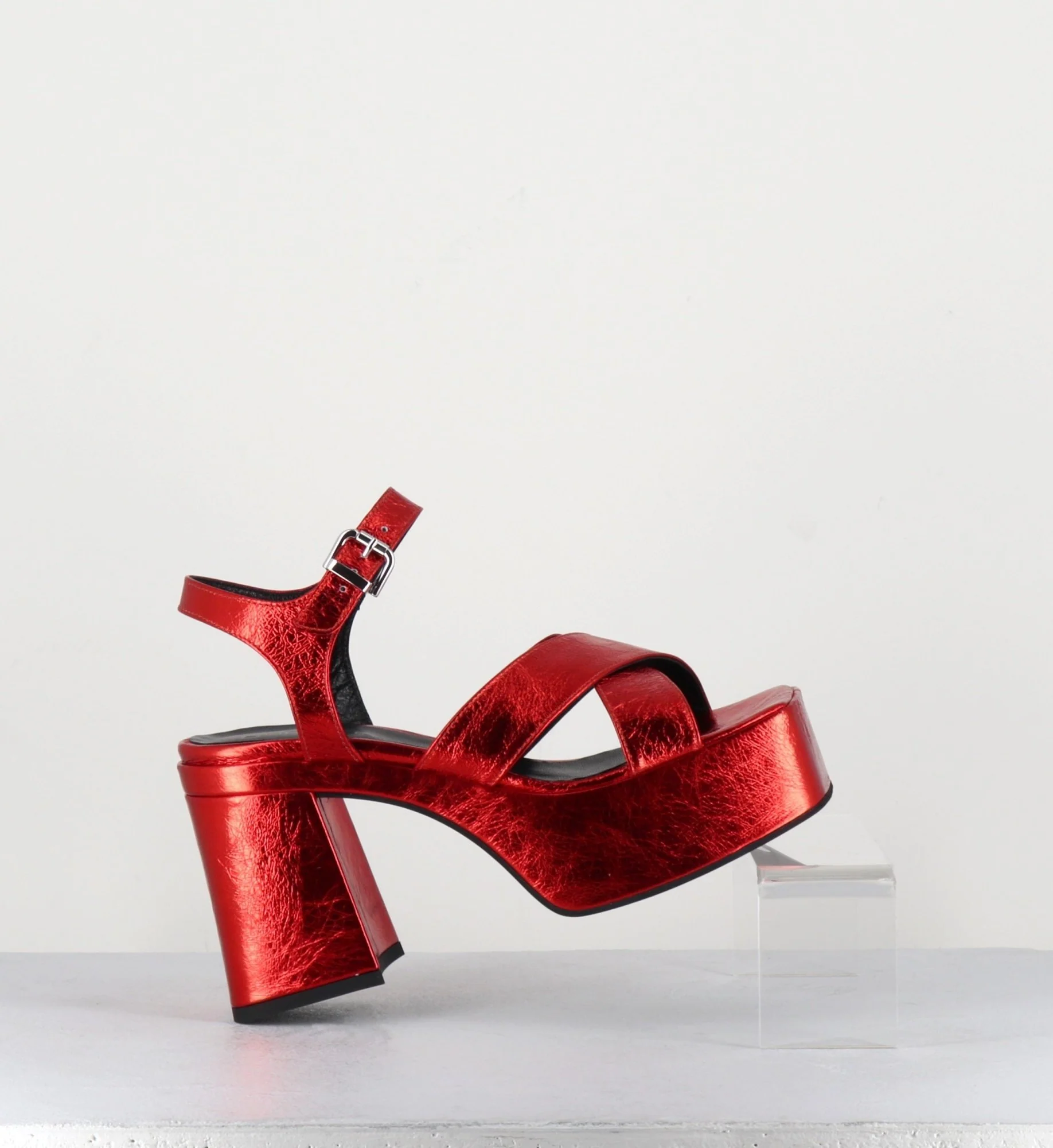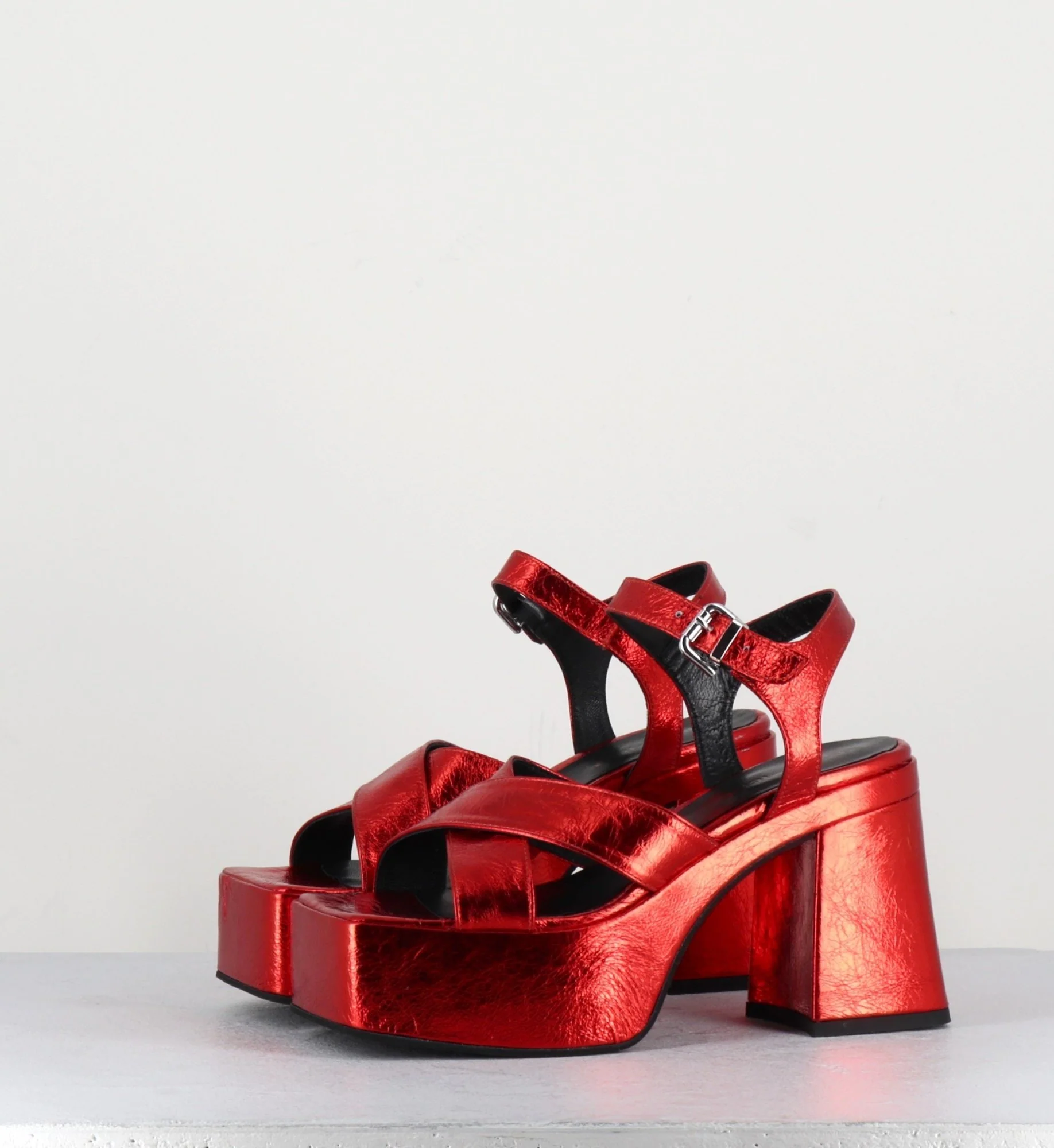 Sandales en cuir métallisé froissé rouge très souple, à brides croisées et bride cheville réglable, bout carré, montées sur une épaisse plateforme et un talon bloc légèrement évasé recouverts, esprit 70s. Fabrication Artisanale Italienne – Ateliers GarriceLab Chausse légèrement grand.
