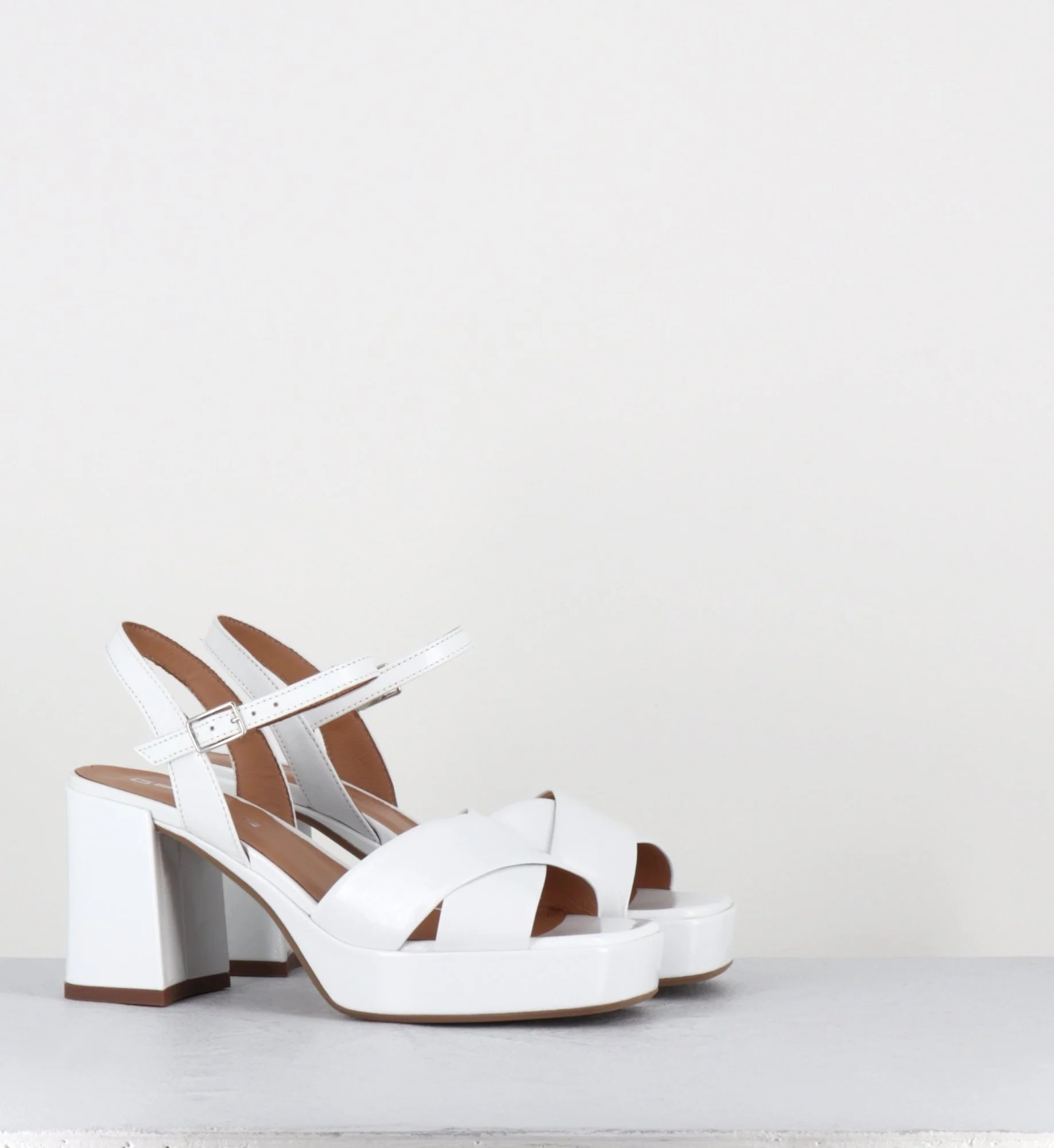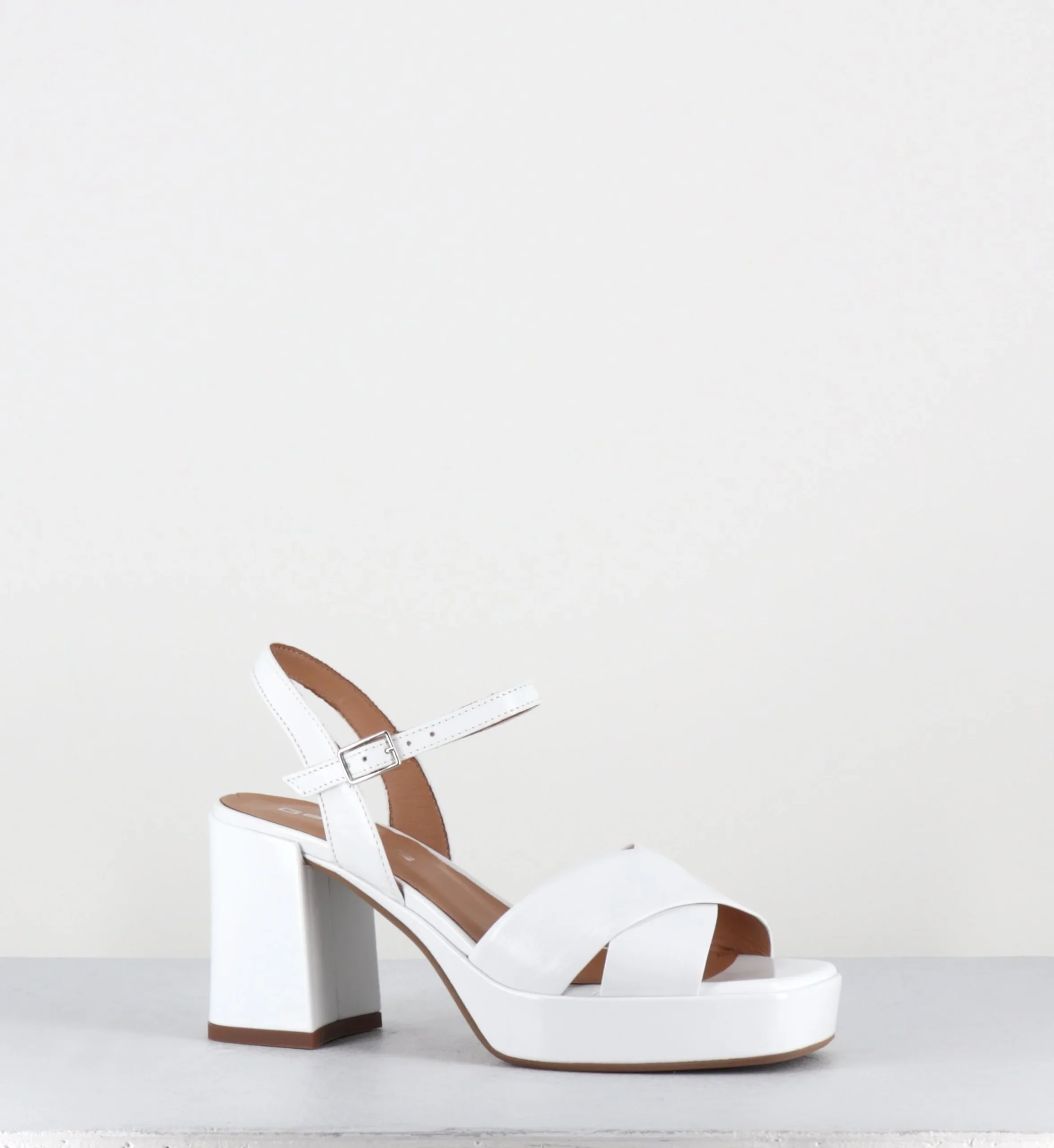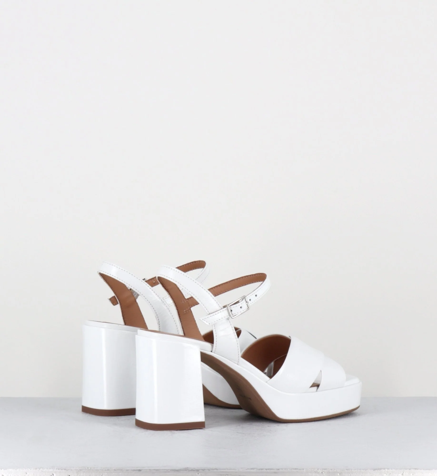 Sandales en cuir vernis blanc, bout carré, brides croisées, fine bride à boucle réglable sur la cheville, montées sur un talon bloc et une plateforme recouverts.