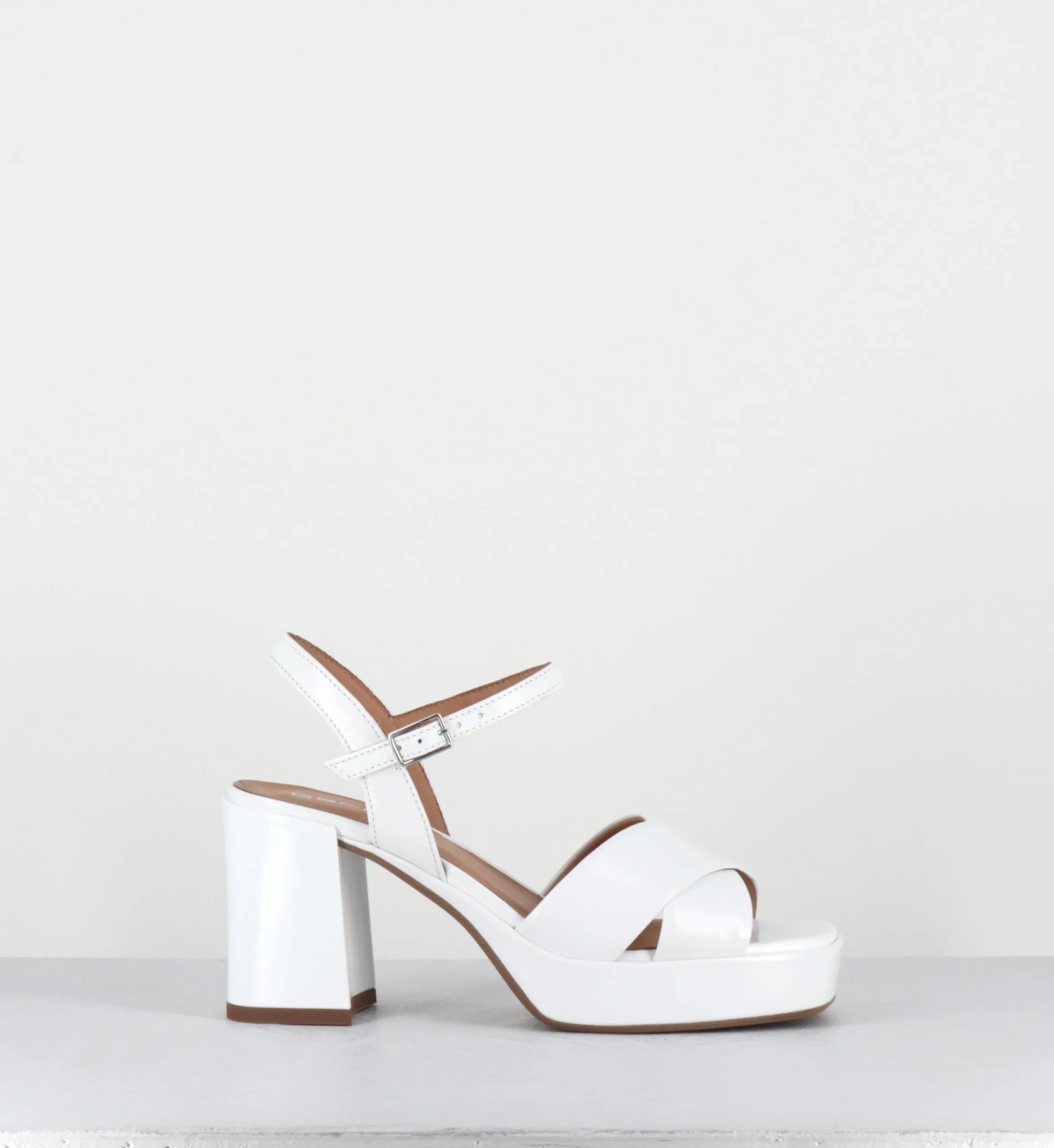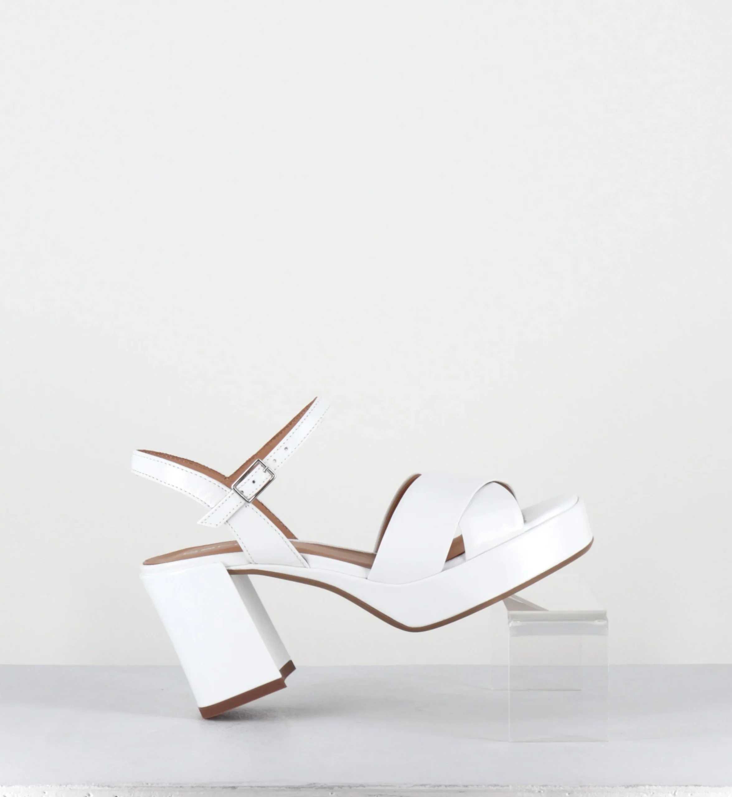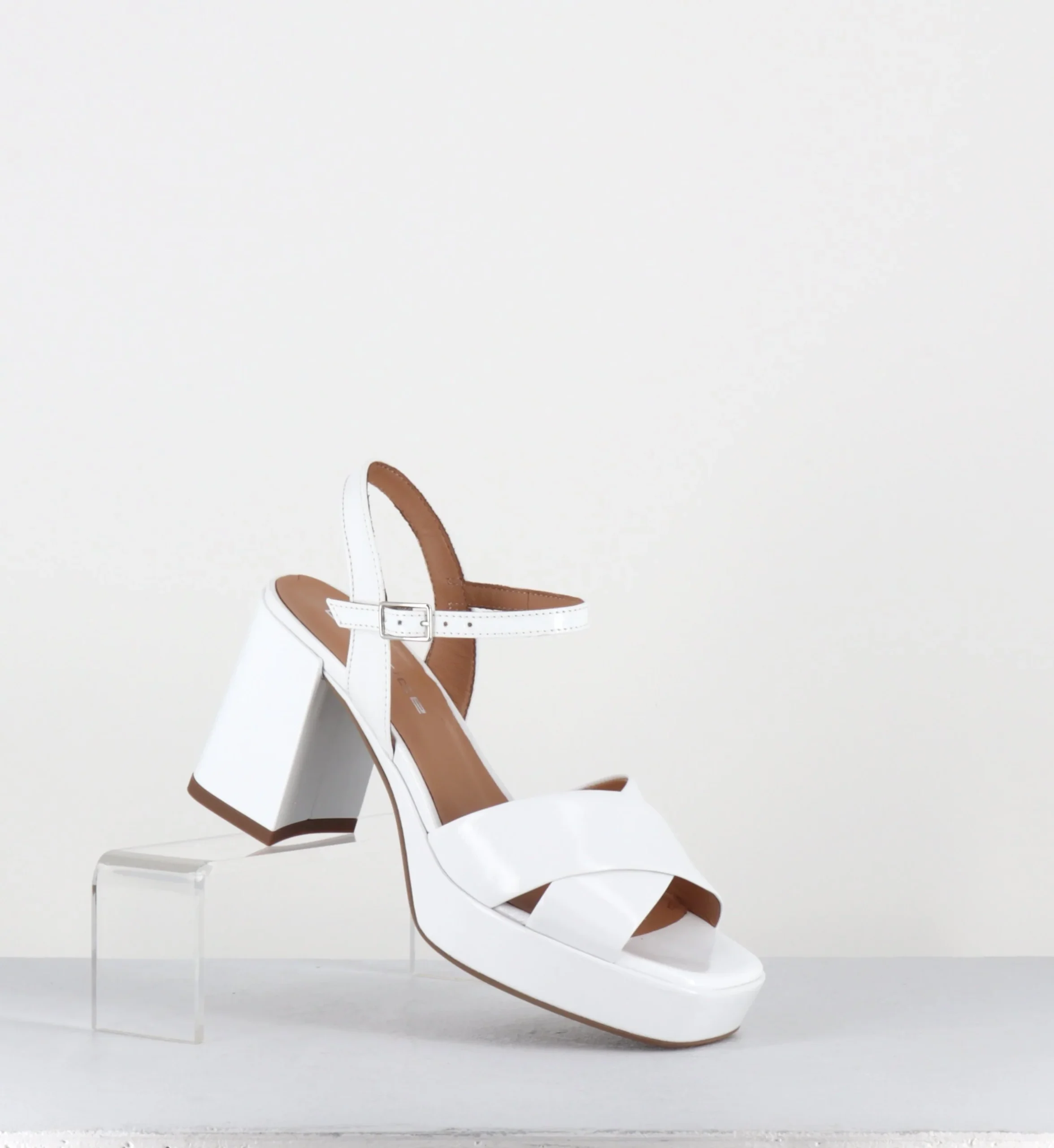 Sandales en cuir vernis blanc, bout carré, brides croisées, fine bride à boucle réglable sur la cheville, montées sur un talon bloc et une plateforme recouverts.