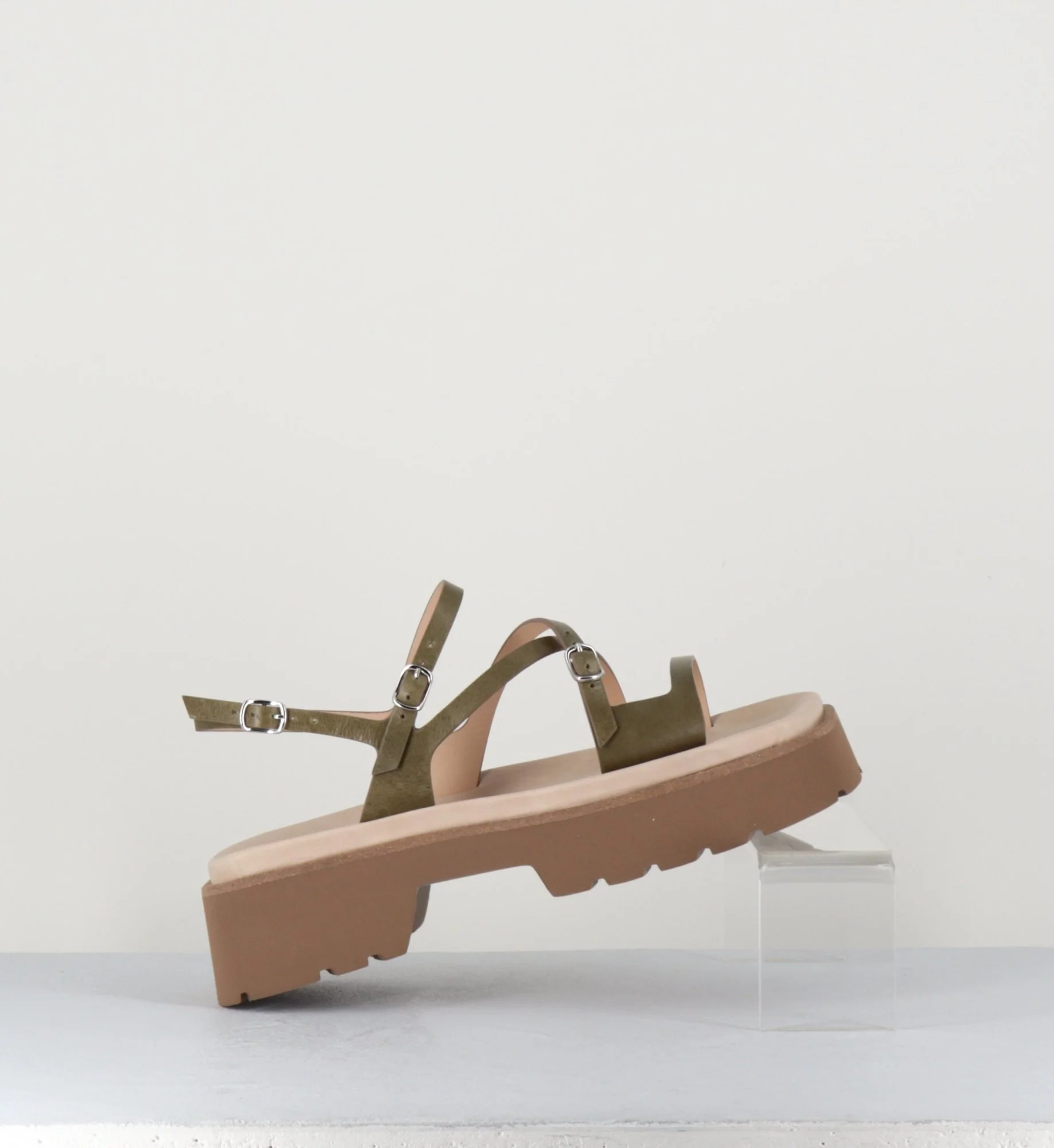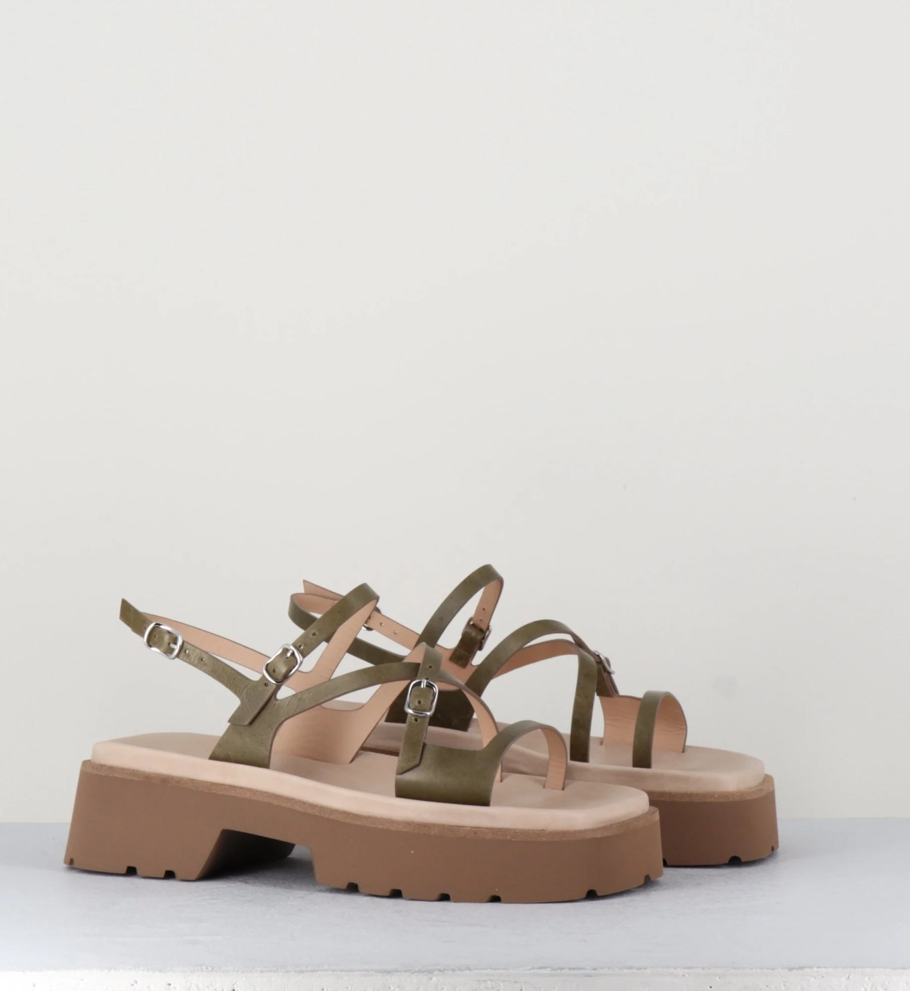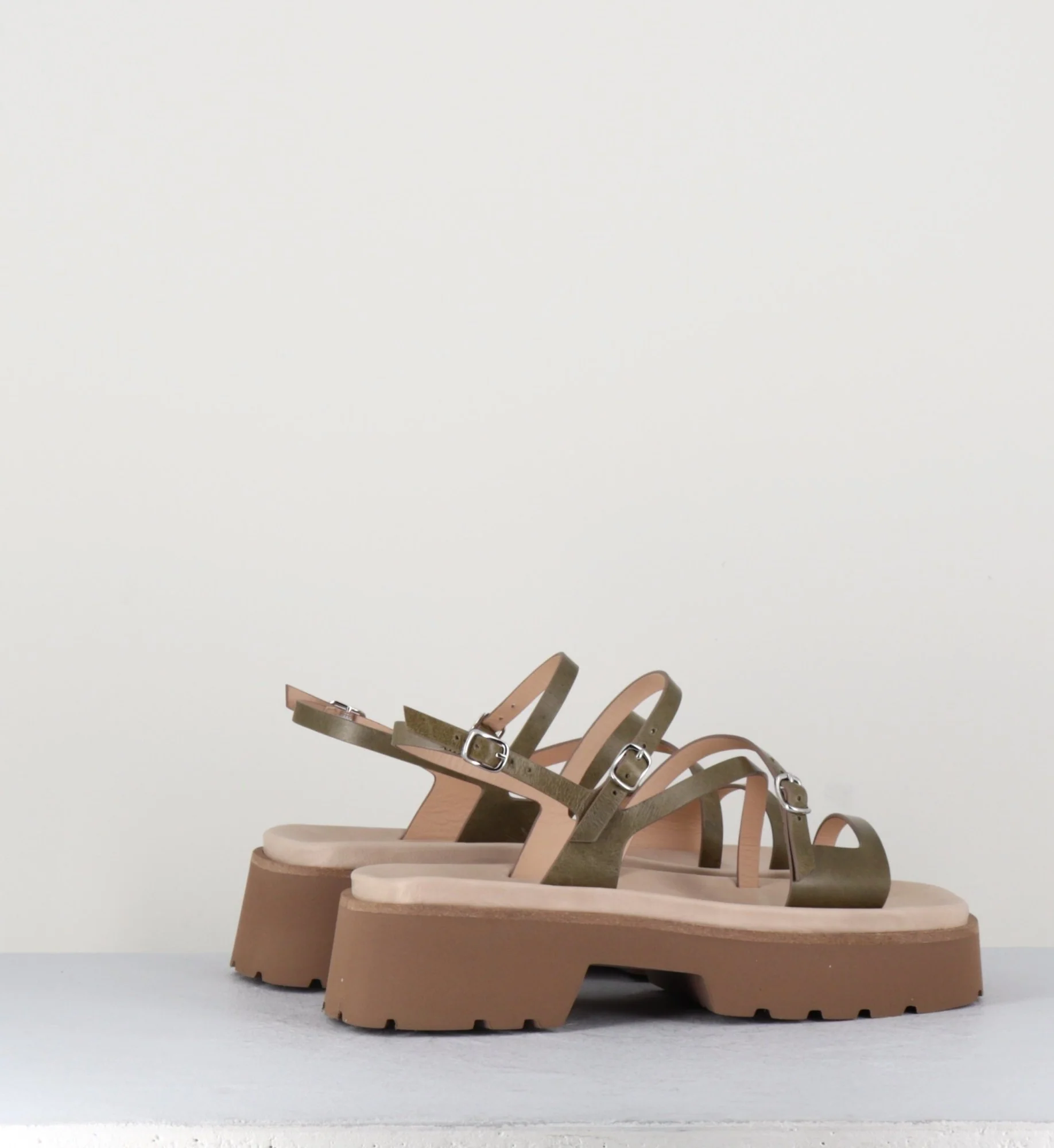 Sandales en cuir lisse khaki, multi-brides fines à boucles réglables, look 90s, bout carré, montées sur une plateforme à deux blocs ultra légère en micro-fibre à semelle légèrement crantée.