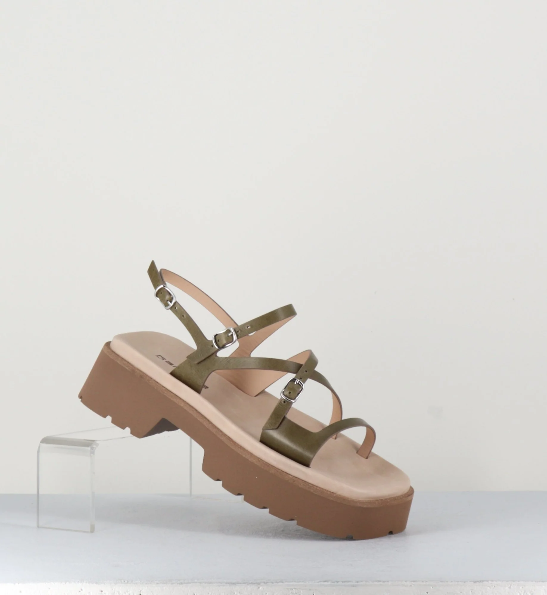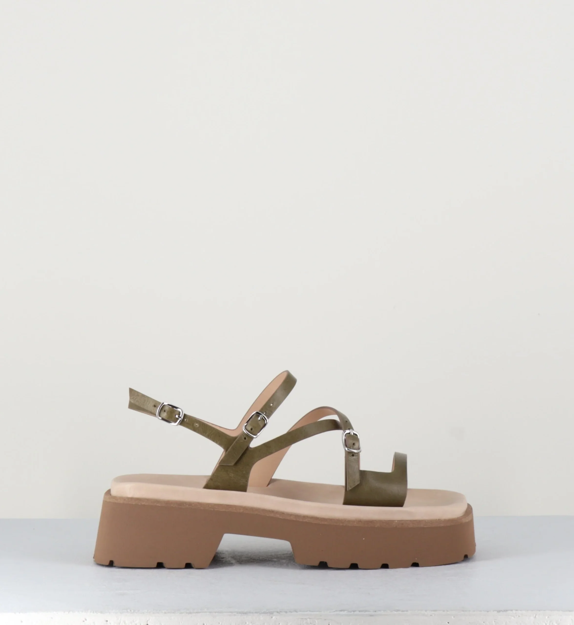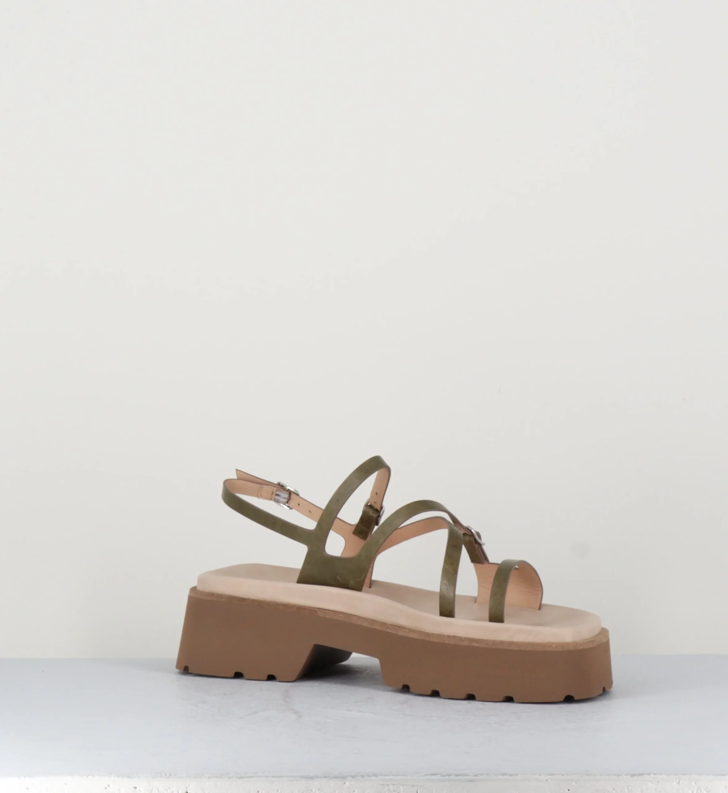 Sandales en cuir lisse khaki, multi-brides fines à boucles réglables, look 90s, bout carré, montées sur une plateforme à deux blocs ultra légère en micro-fibre à semelle légèrement crantée.