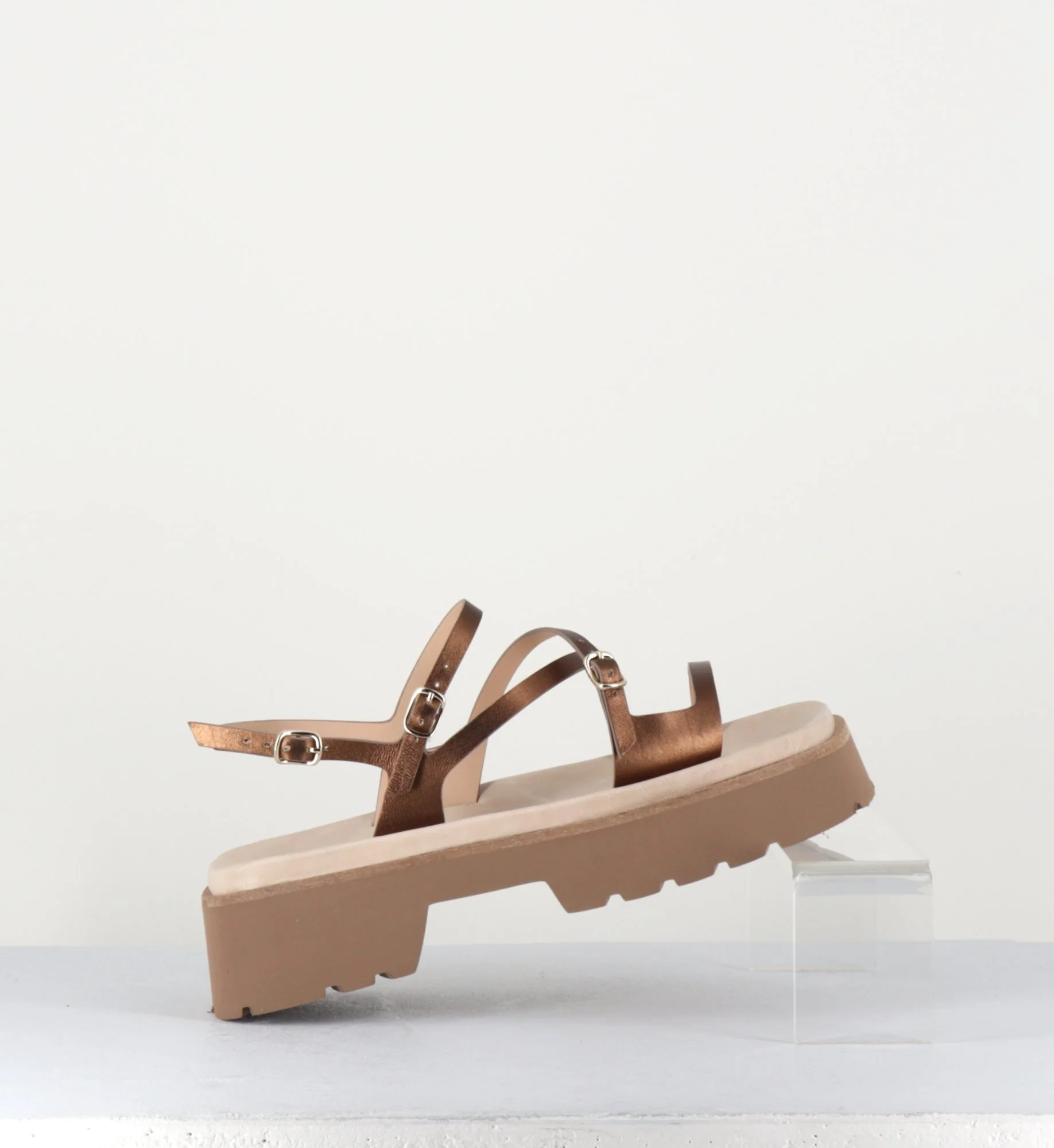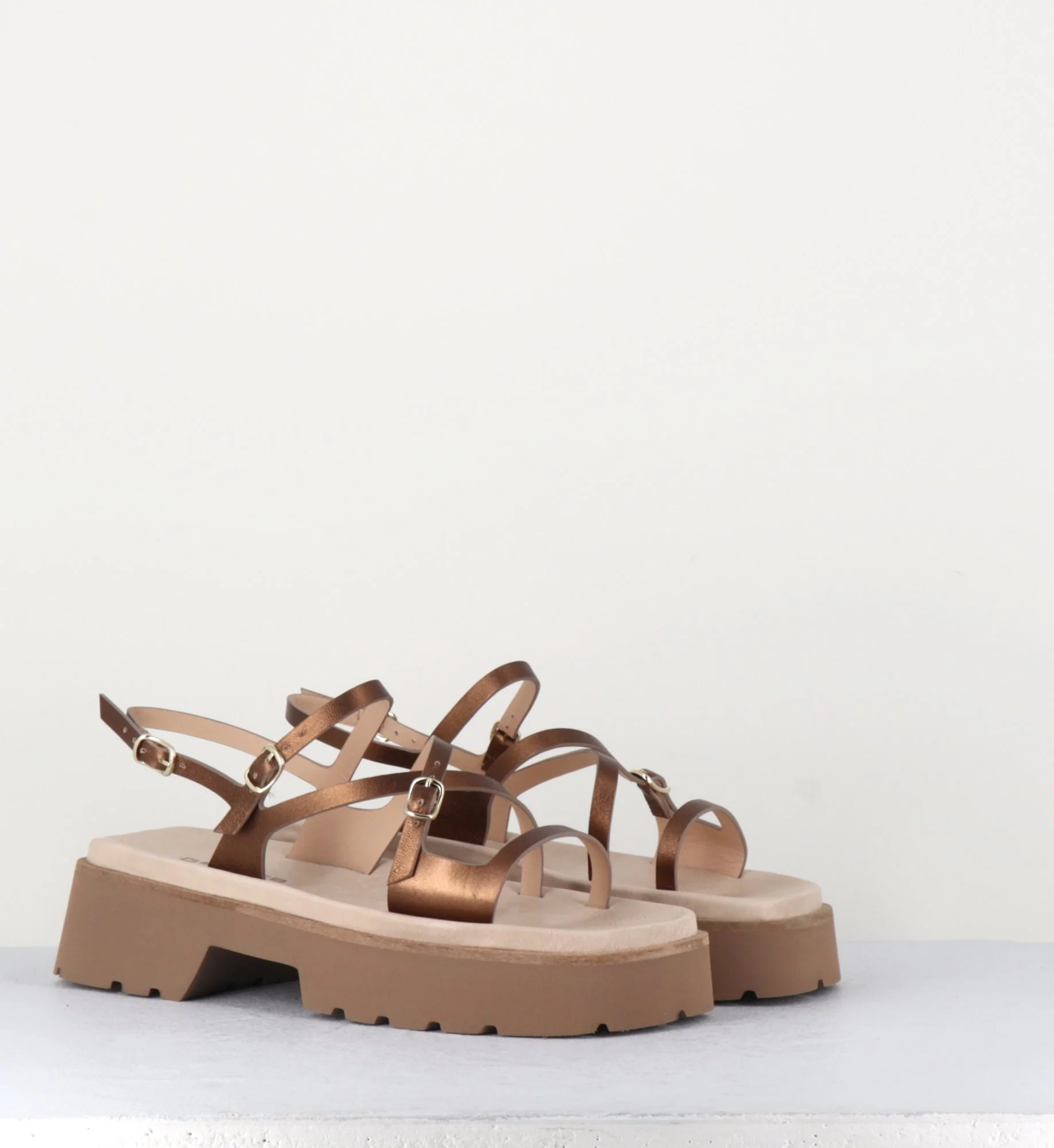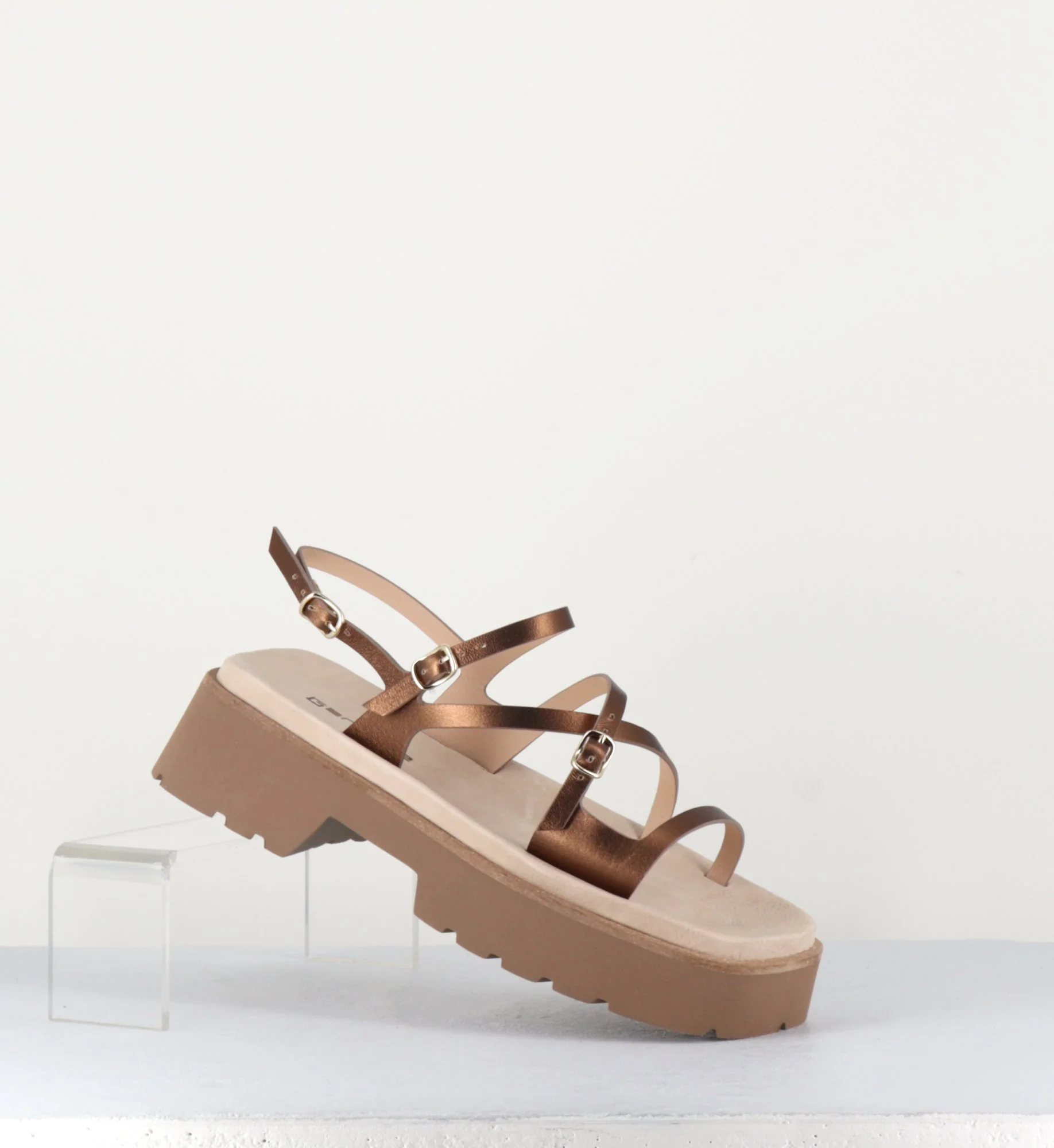 Sandales en cuir métallisé bronze, multi-brides fines à boucles réglables, look 90s, bout carré, montées sur une plateforme à deux blocs ultra légère en micro-fibre à semelle légèrement crantée.