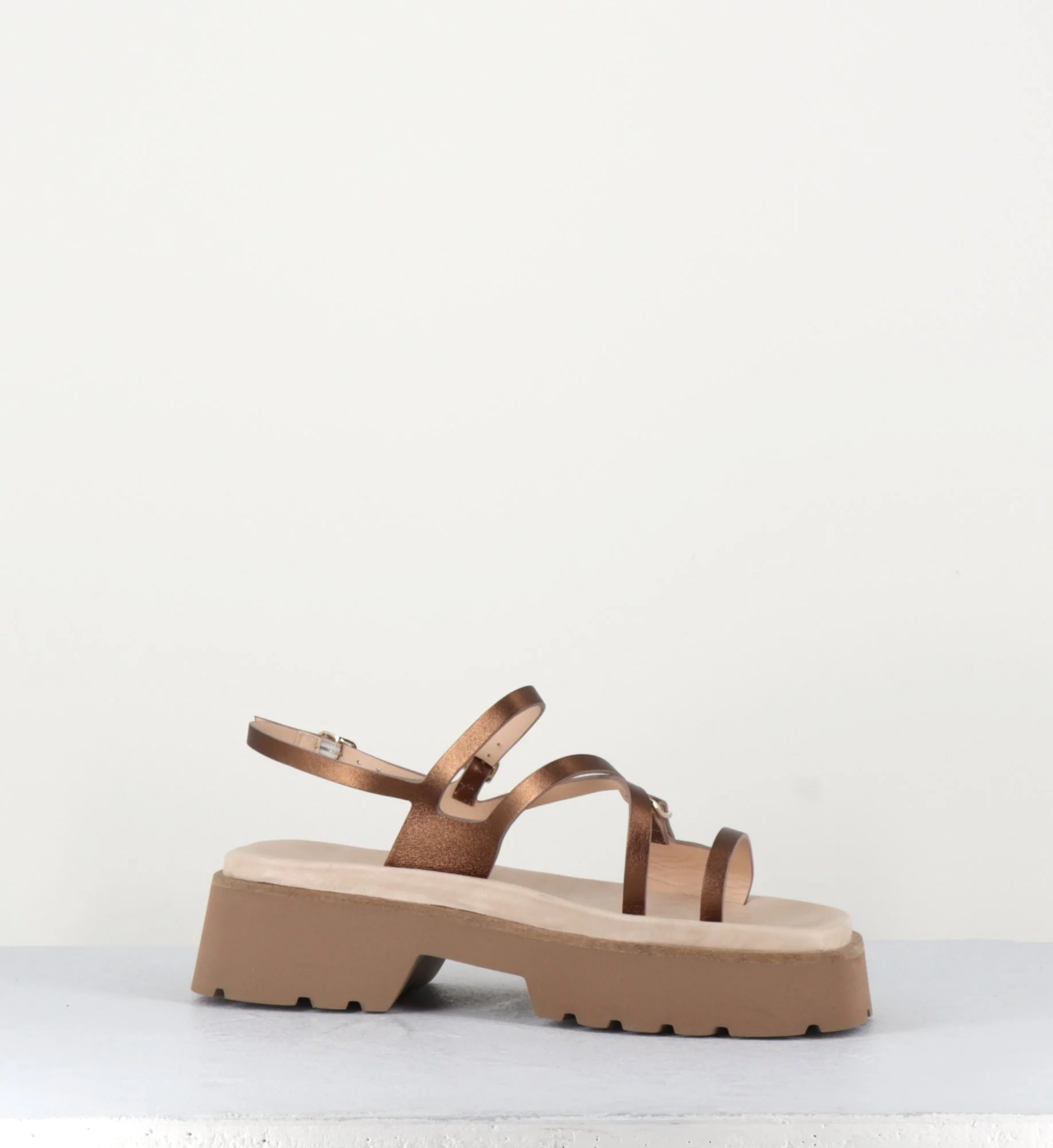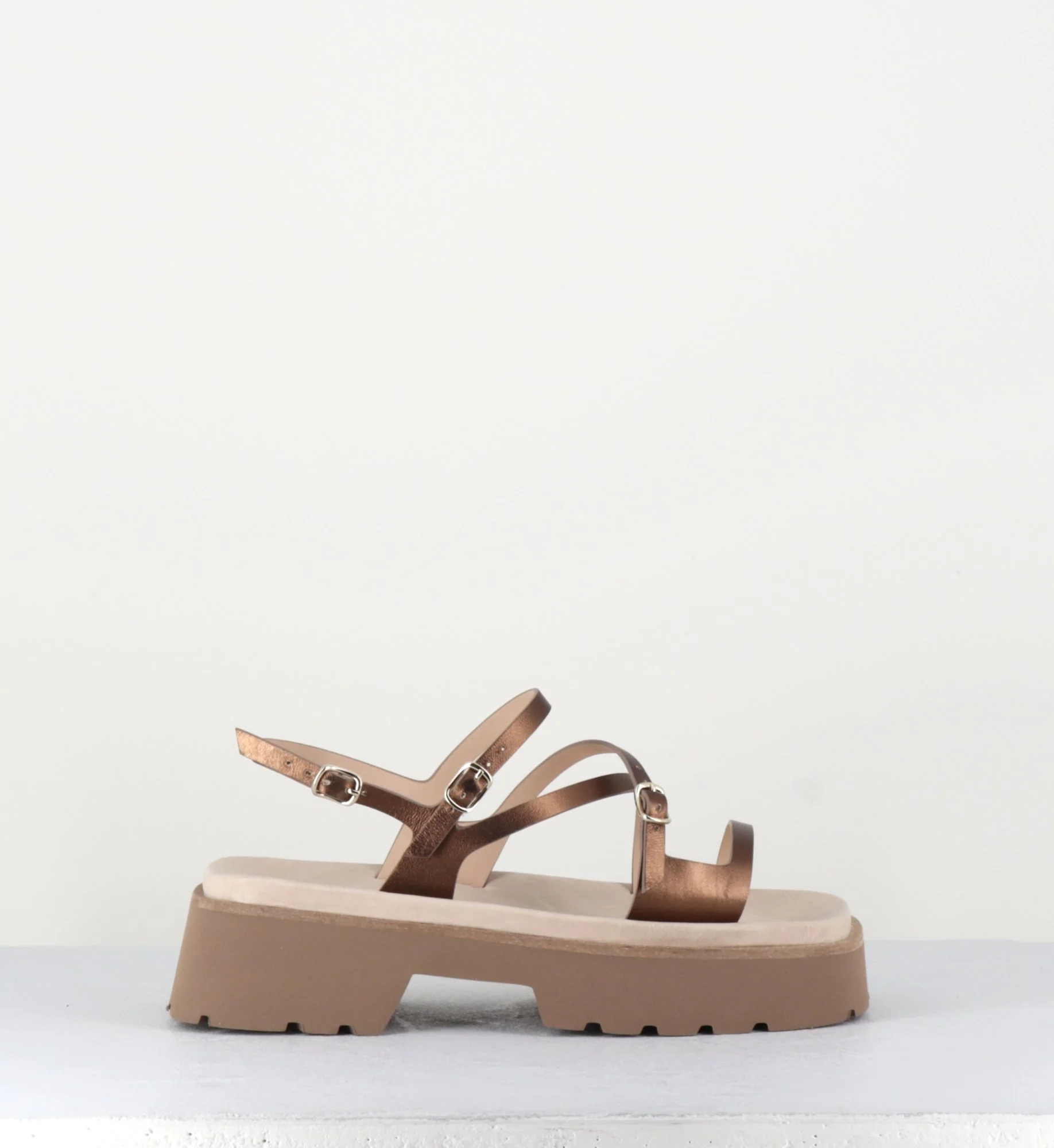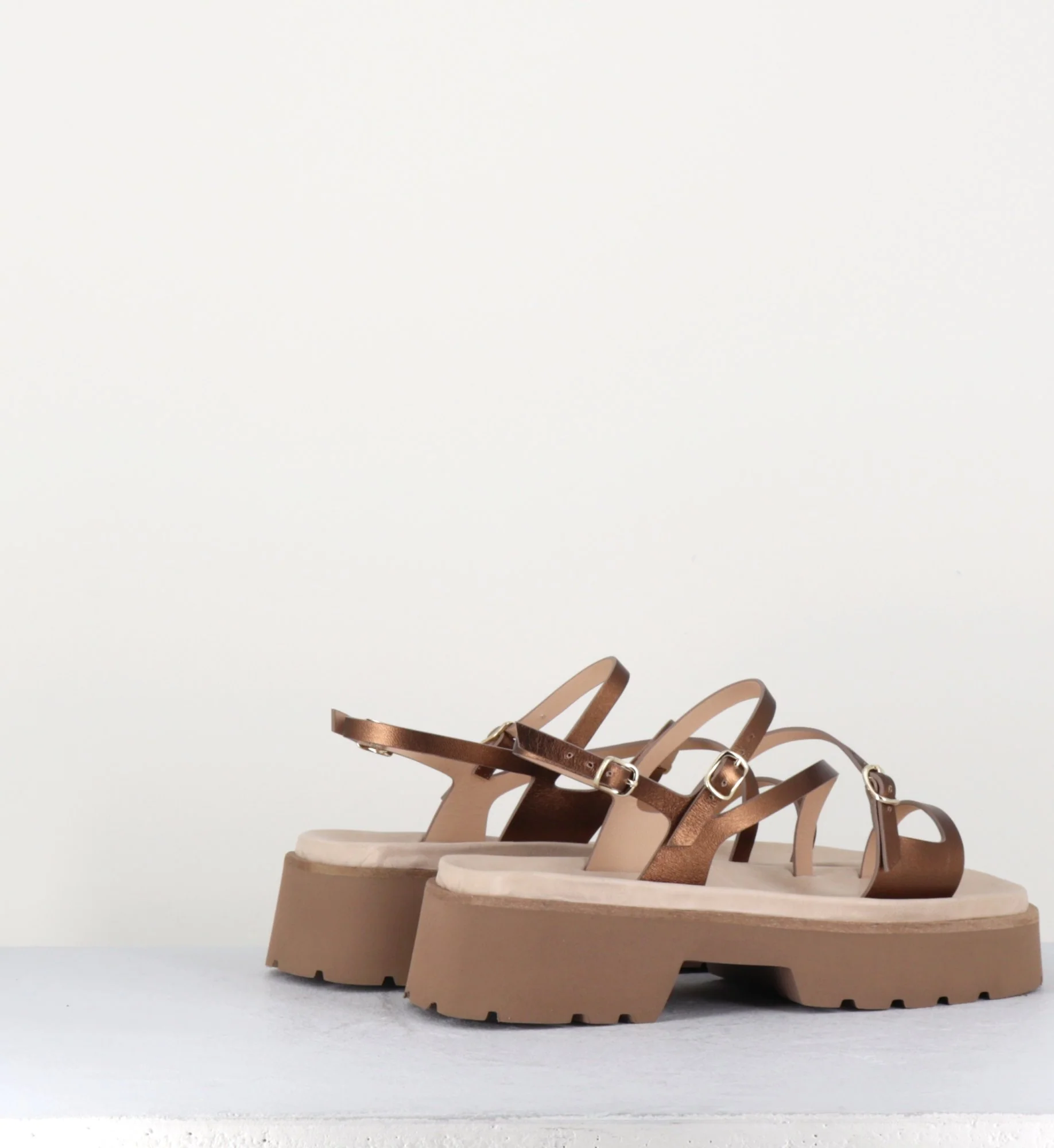 Sandales en cuir métallisé bronze, multi-brides fines à boucles réglables, look 90s, bout carré, montées sur une plateforme à deux blocs ultra légère en micro-fibre à semelle légèrement crantée.