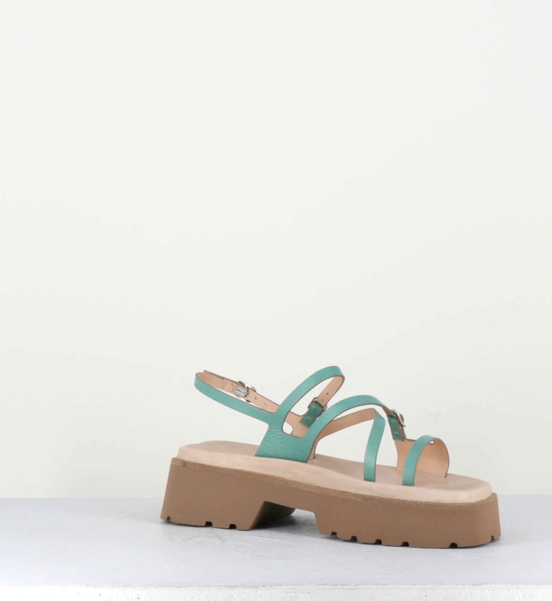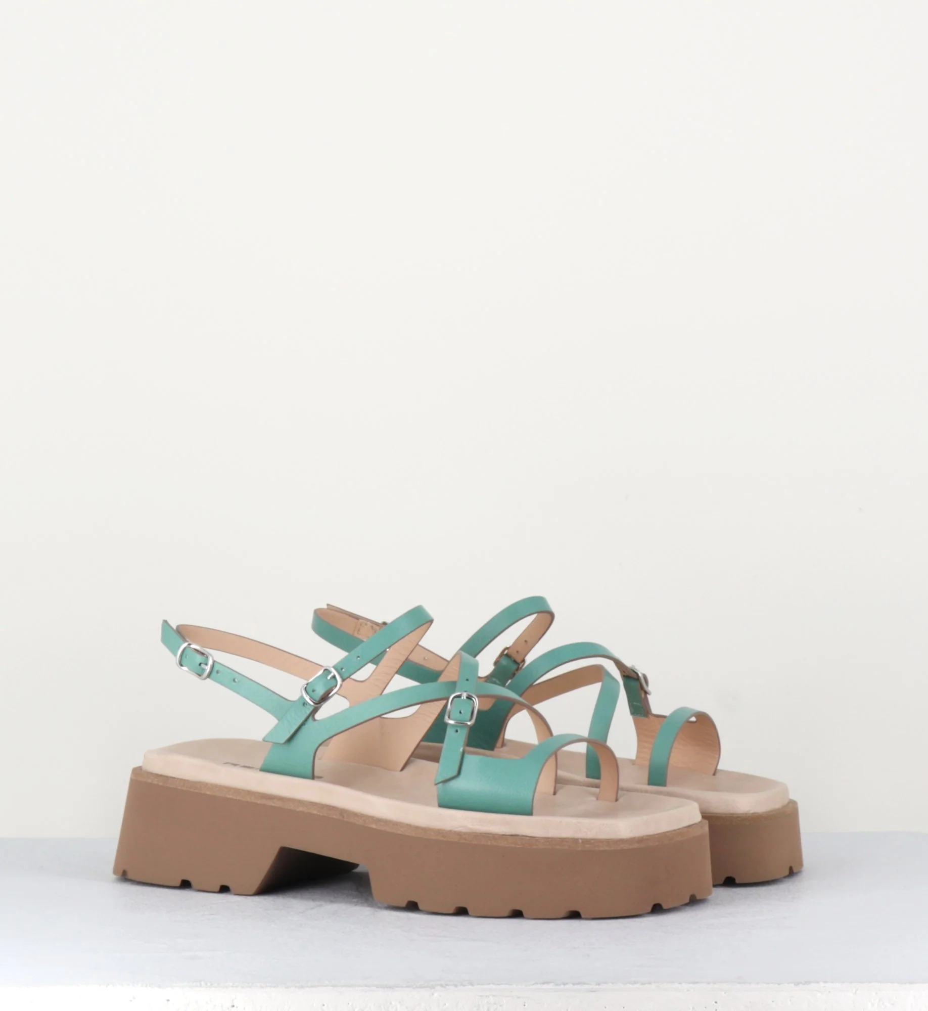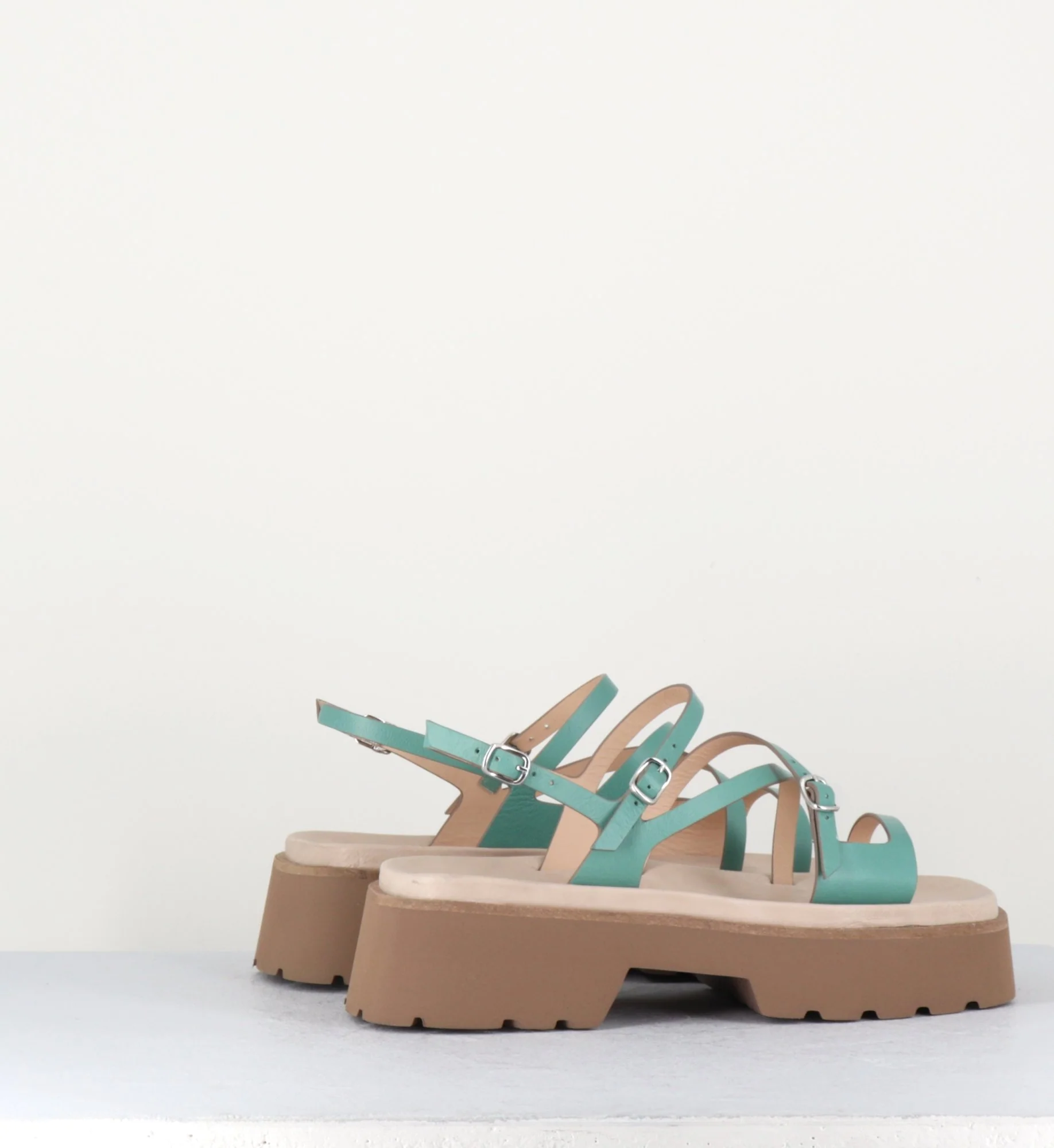 Sandales en cuir lisse vert d’eau, multi-brides fines à boucles réglables, look 90s, bout carré, montées sur une plateforme à deux blocs ultra légère en micro-fibre à semelle légèrement crantée.