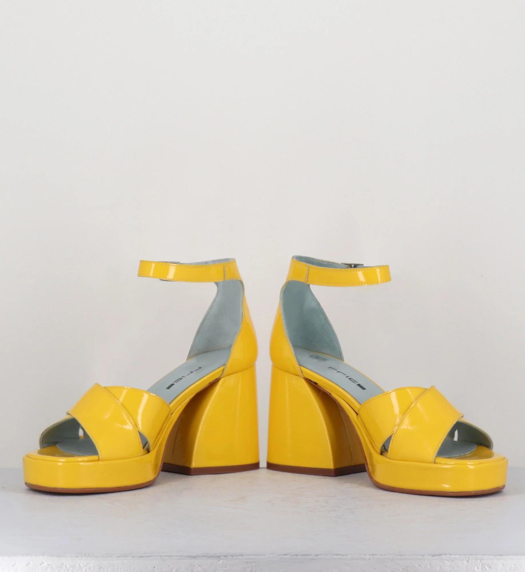 Sandales à plateformes bout carré en cuir vernis jaune, bride cheville réglable, montées sur un talon large au design rétro.