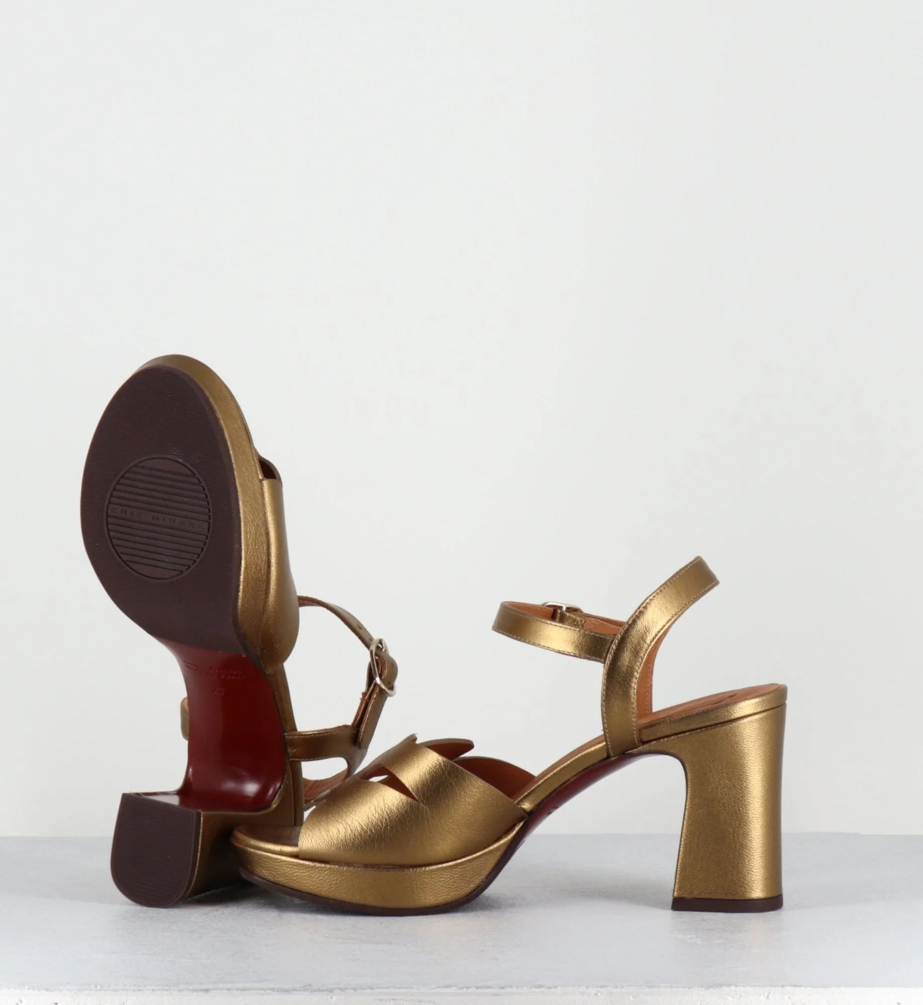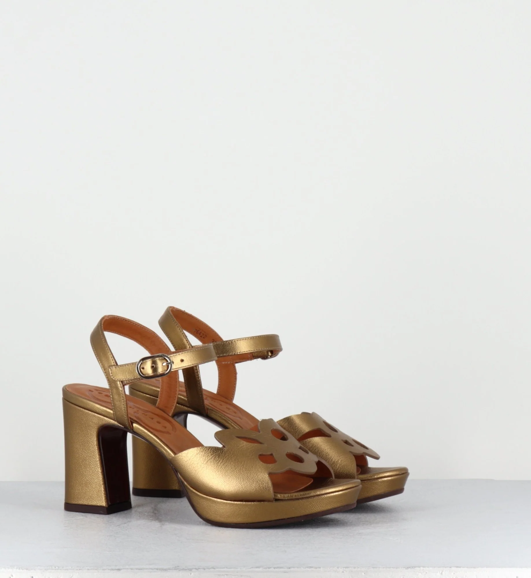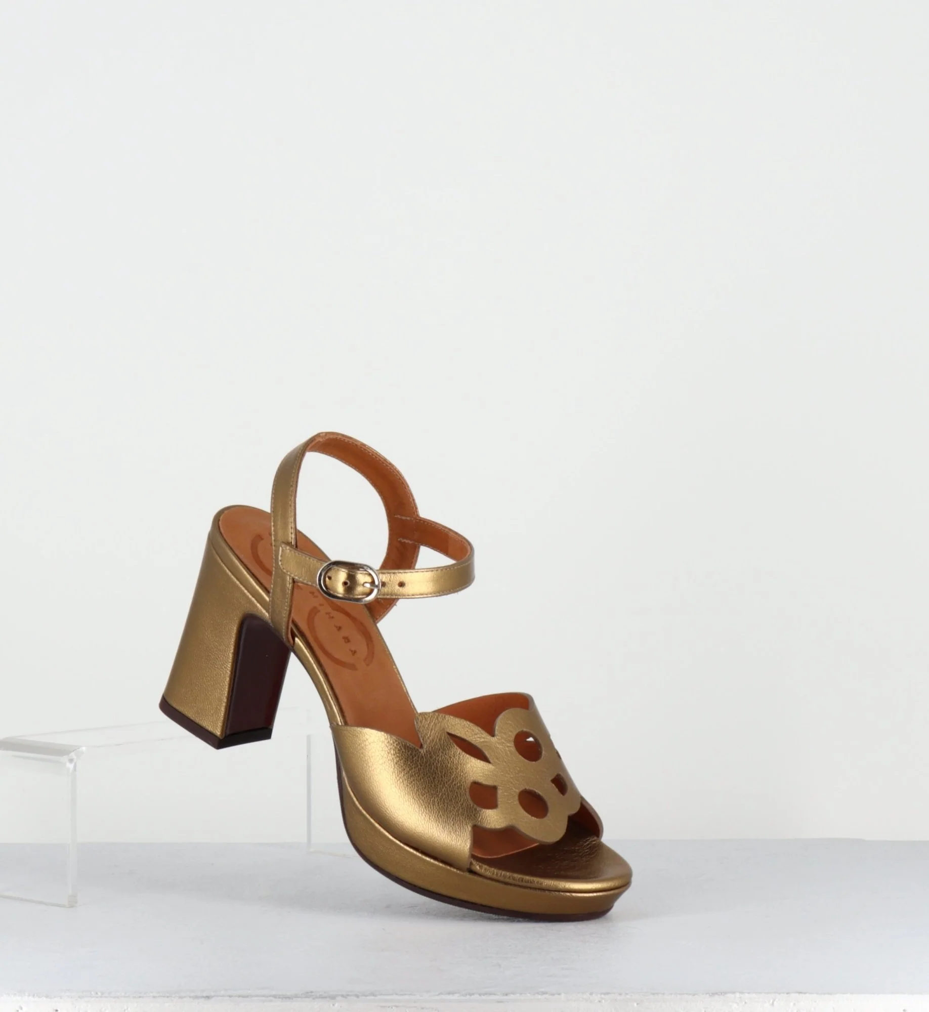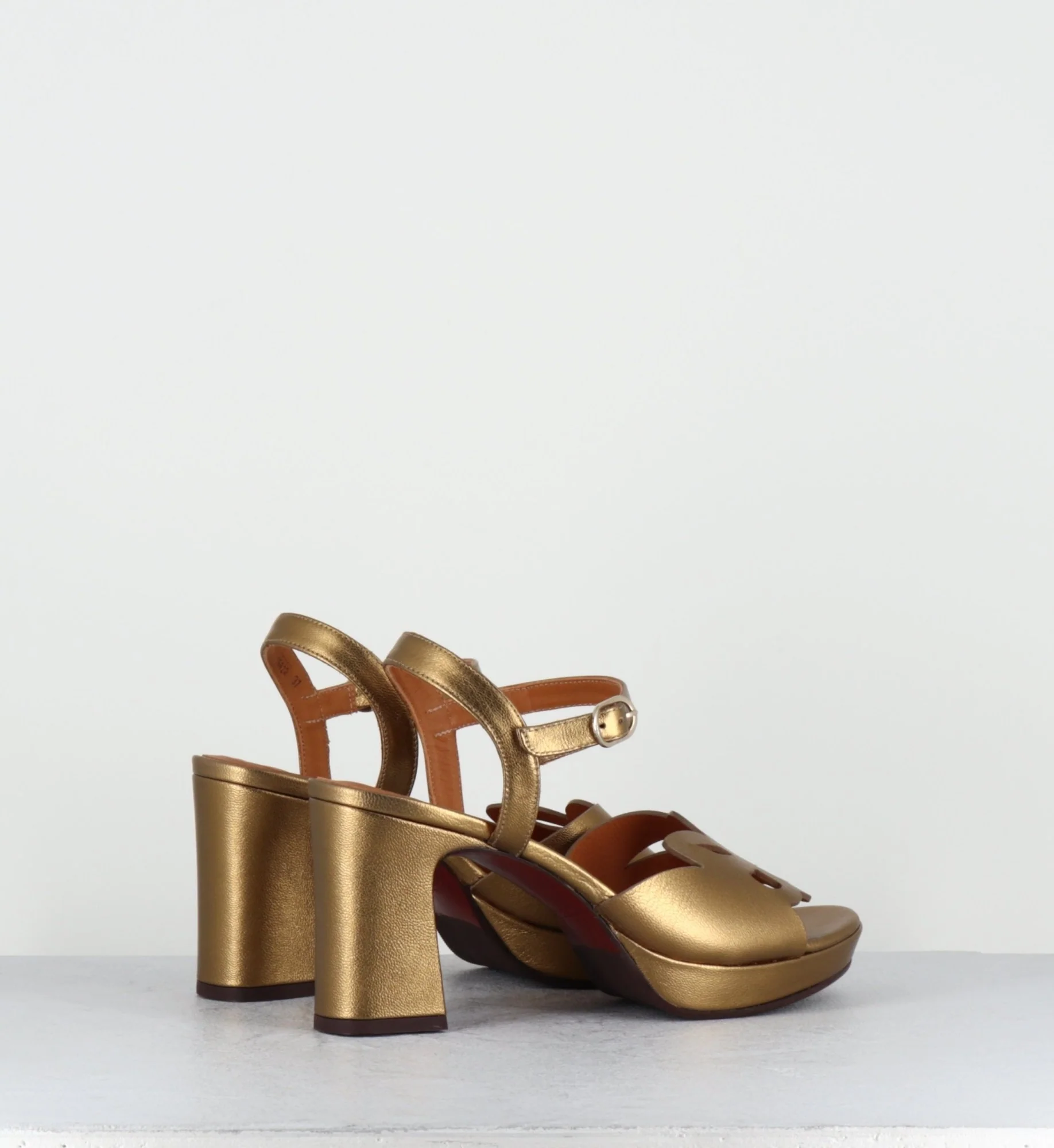 Sandales en cuir métallisé bronze, design ajouré géométrique à l’avant, bride à boucle réglable, bout en amande, montées sur une plateforme et un talon recouvert légèrement évasé. Fabrication Artisanale Espagnole – Ateliers Chie Mihara Chausse légèrement grand