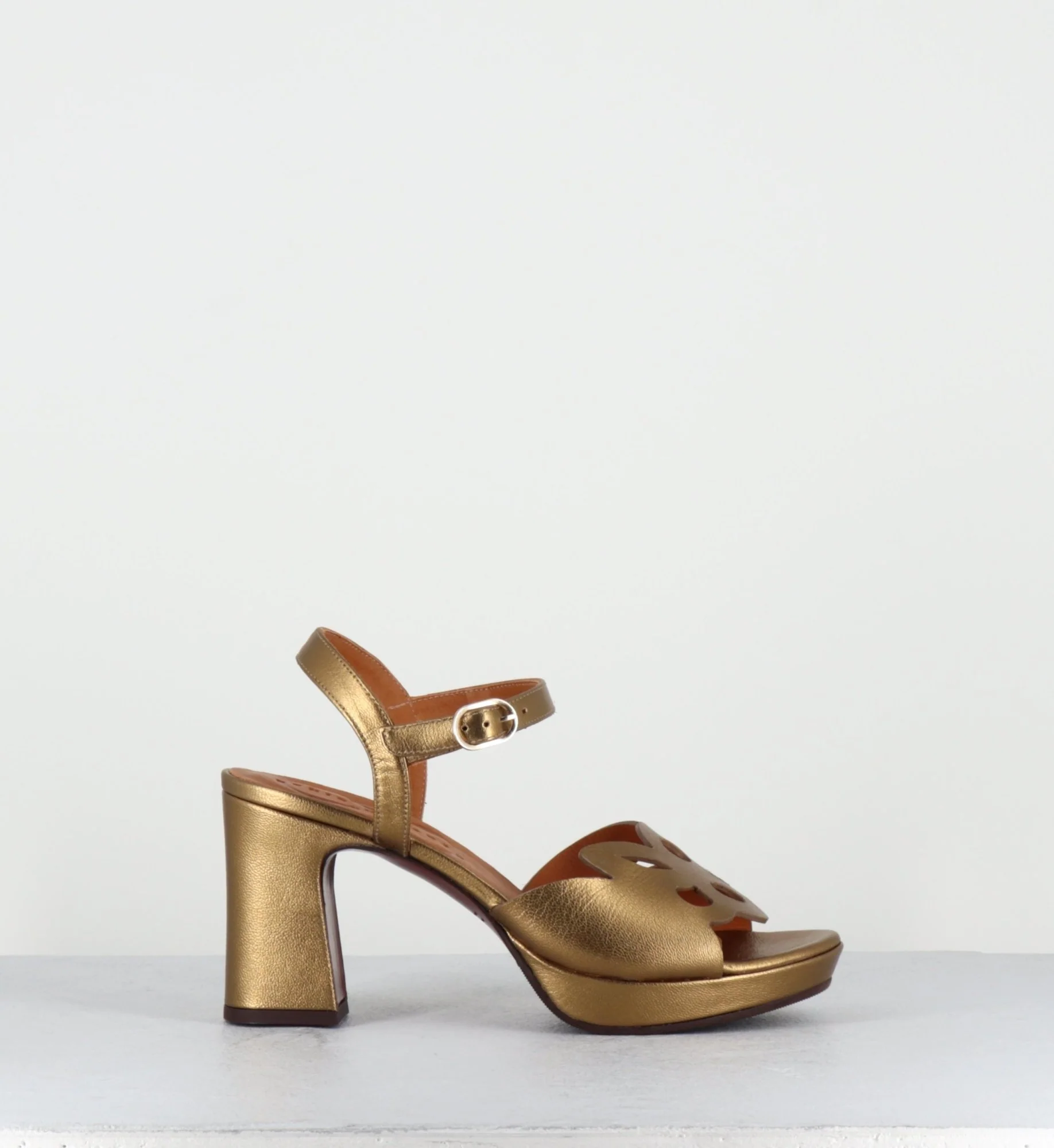 Sandales en cuir métallisé bronze, design ajouré géométrique à l’avant, bride à boucle réglable, bout en amande, montées sur une plateforme et un talon recouvert légèrement évasé.