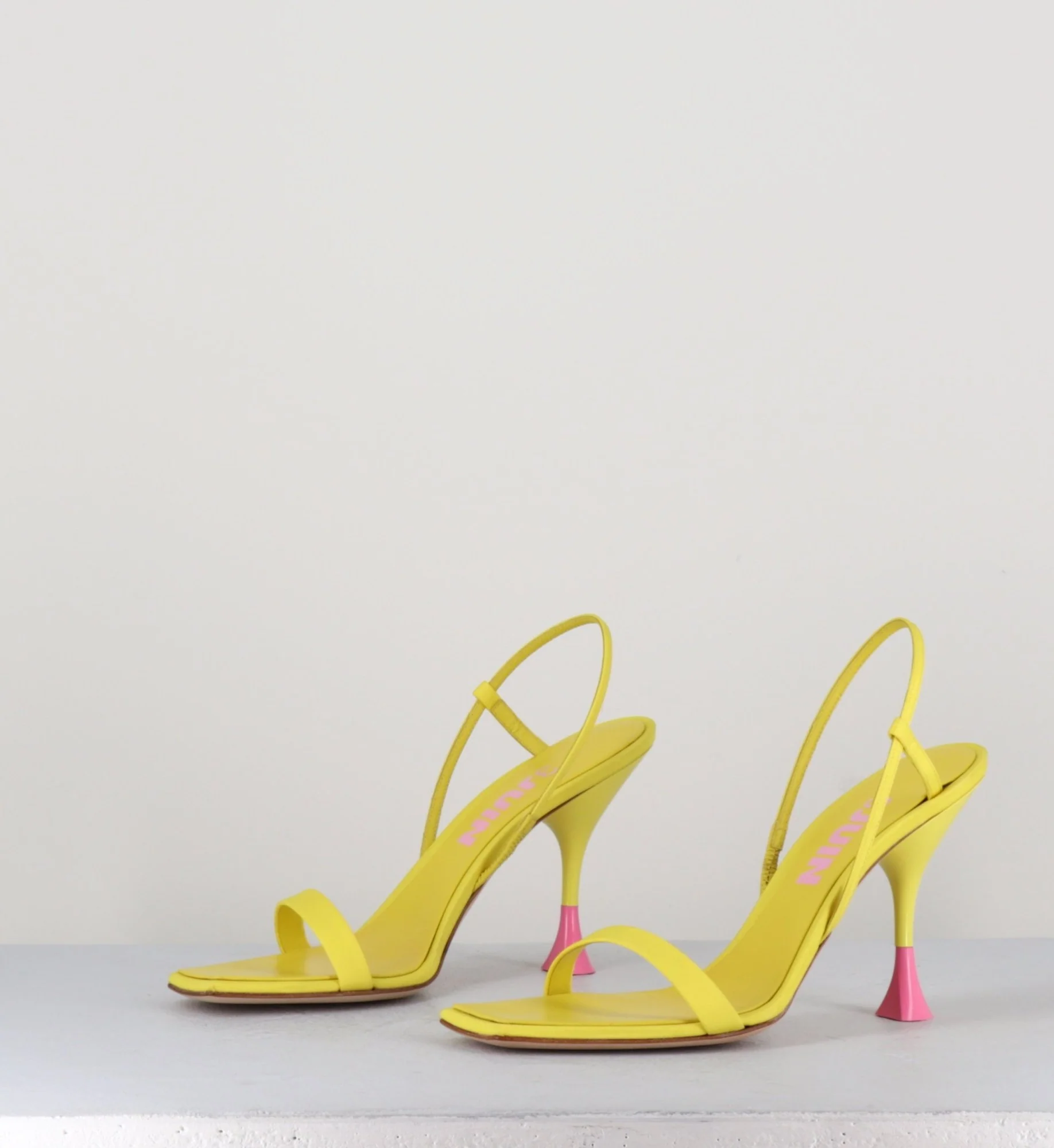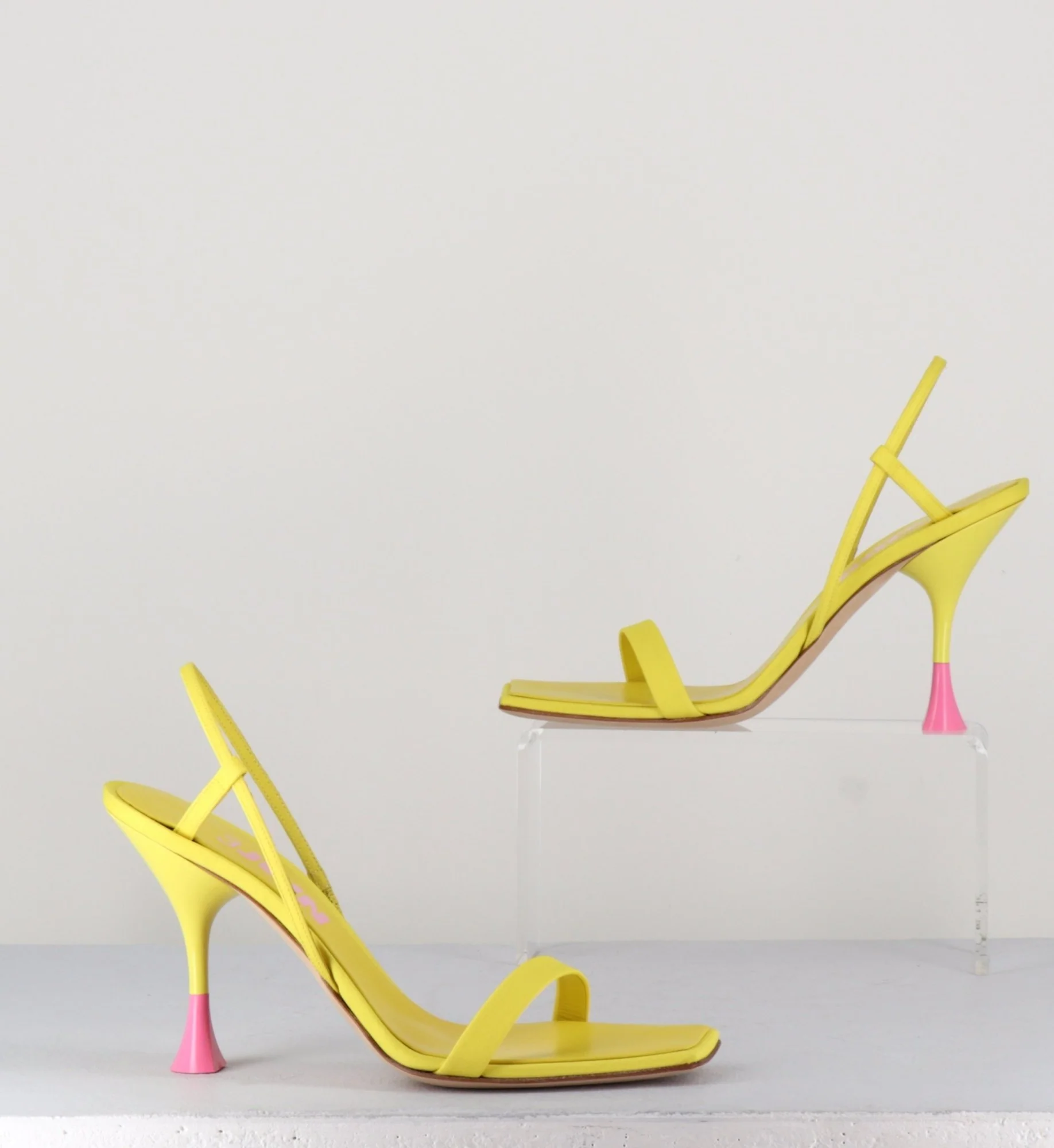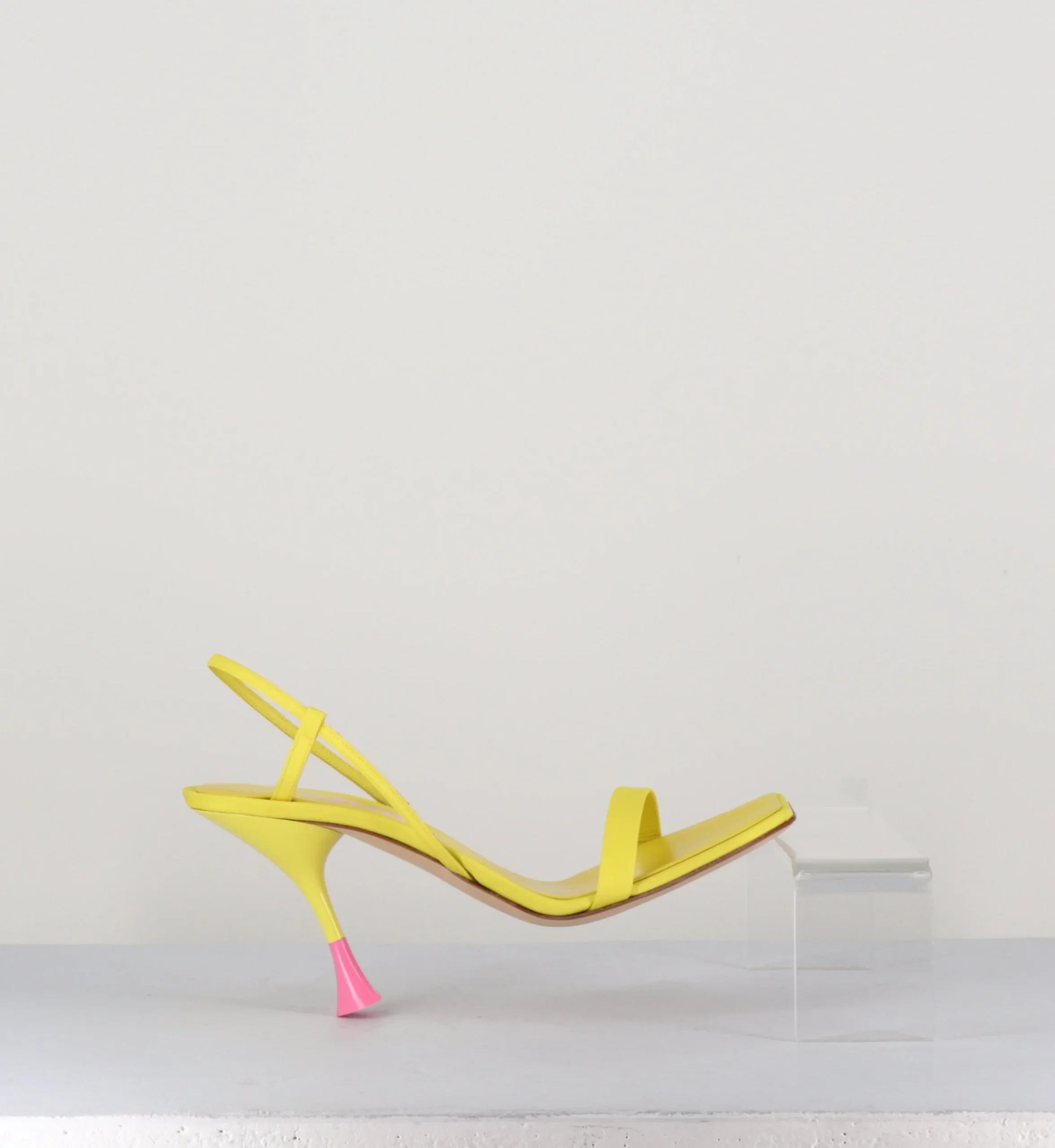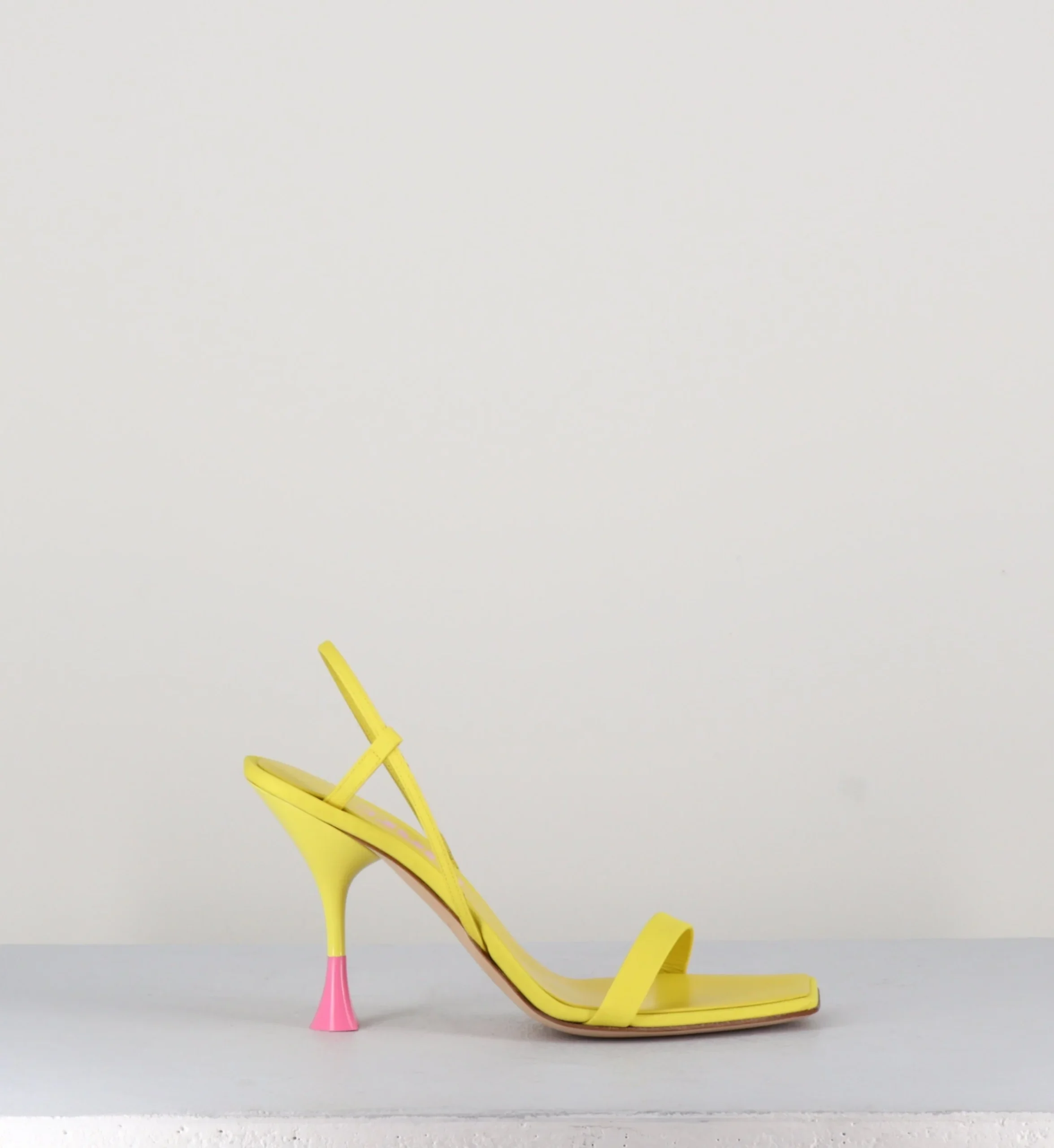 Sandales en cuir & textile jaune, bout carré légèrement asymétrique, bride arrière slingback avec élastique intérieur pour plus d’aisance, montées sur un talon structurée avec détails PVC rose.