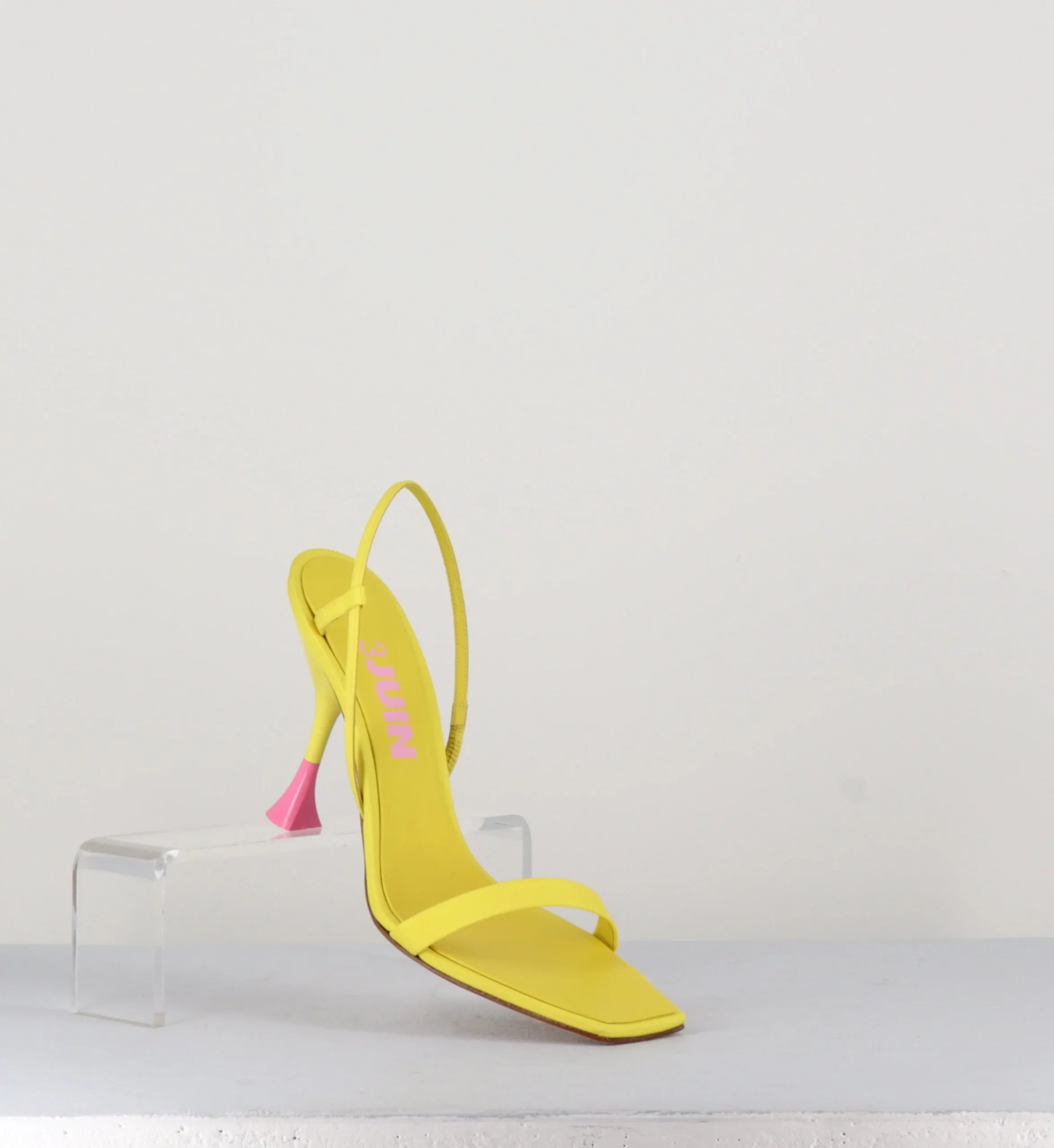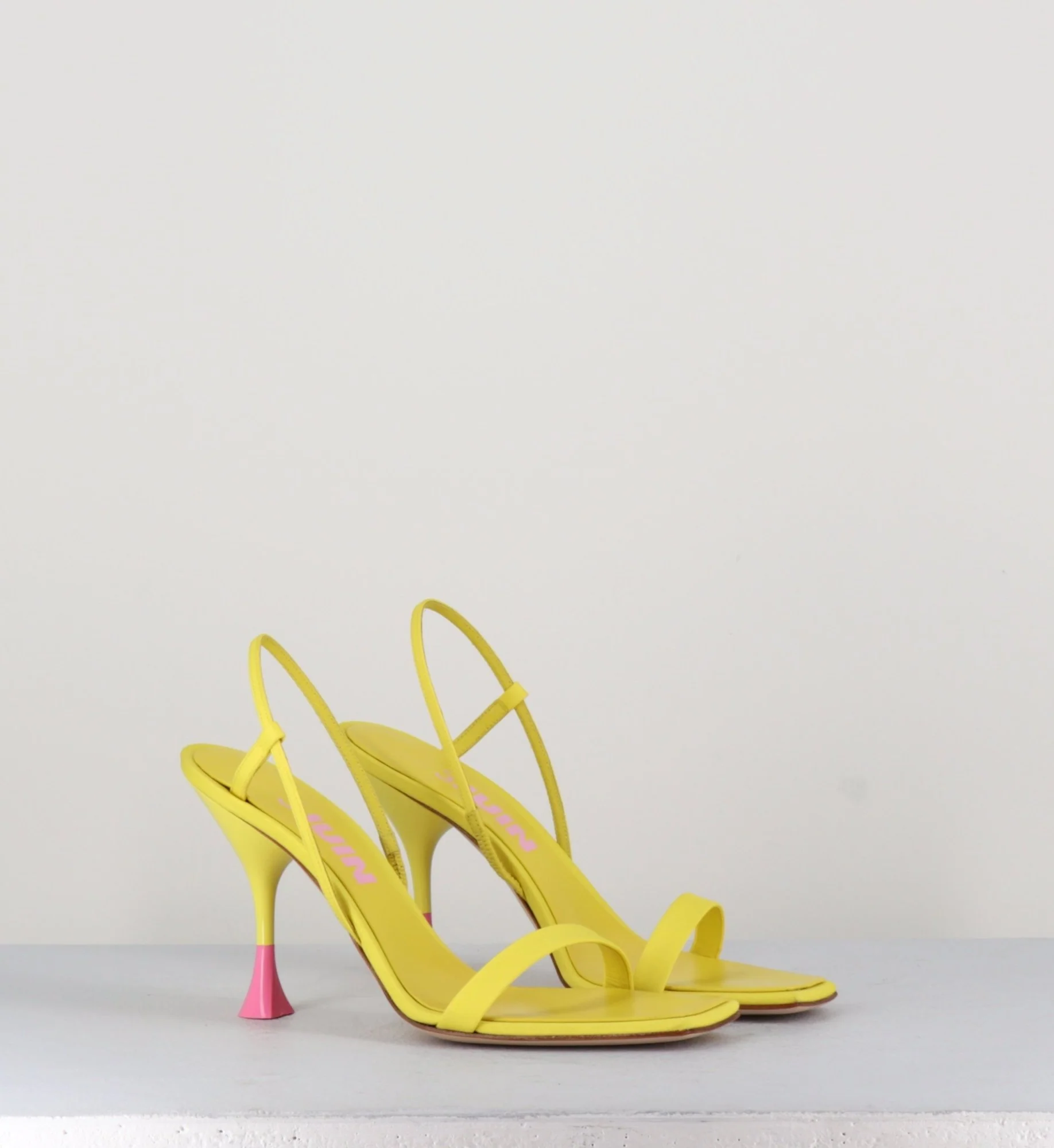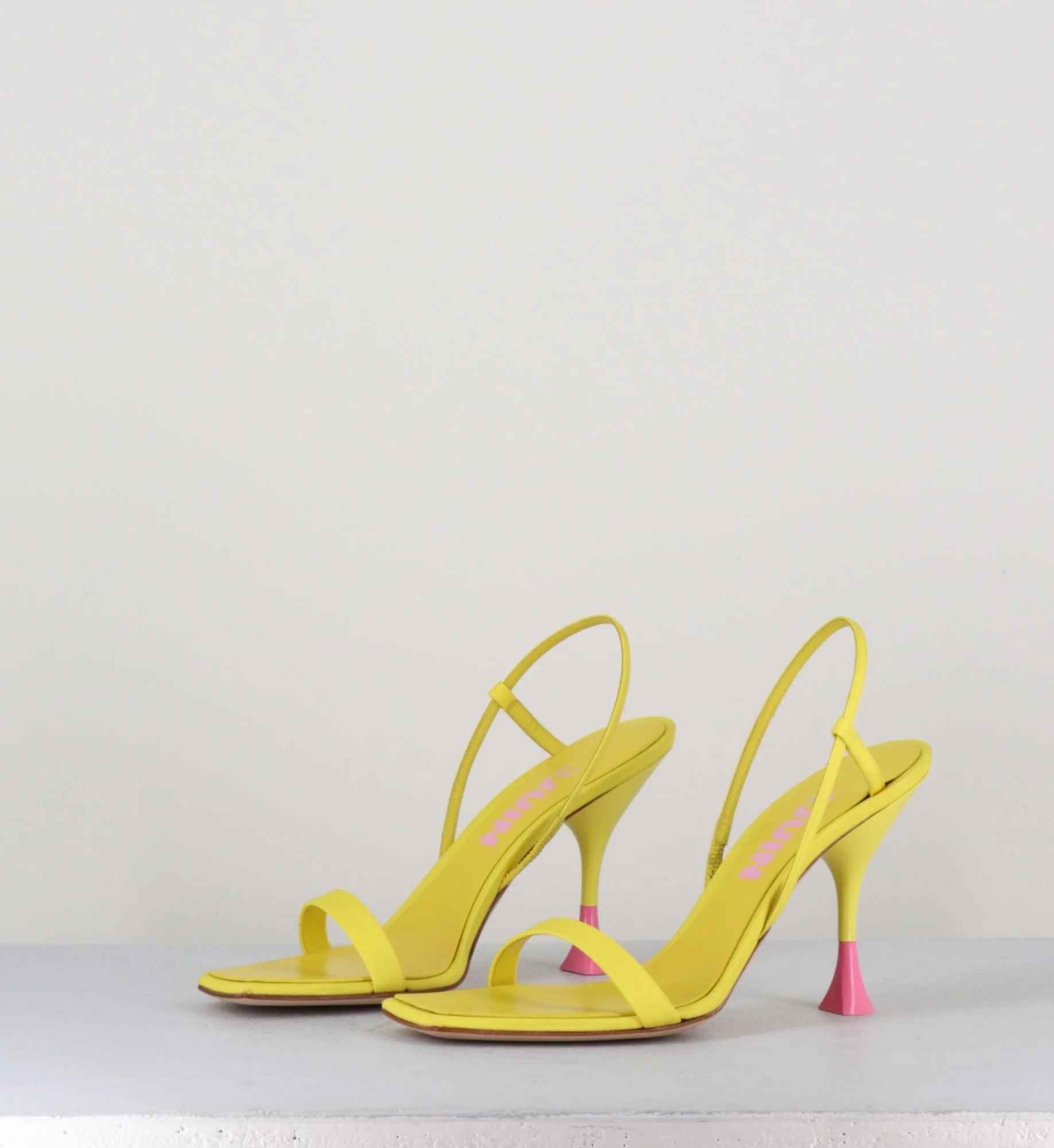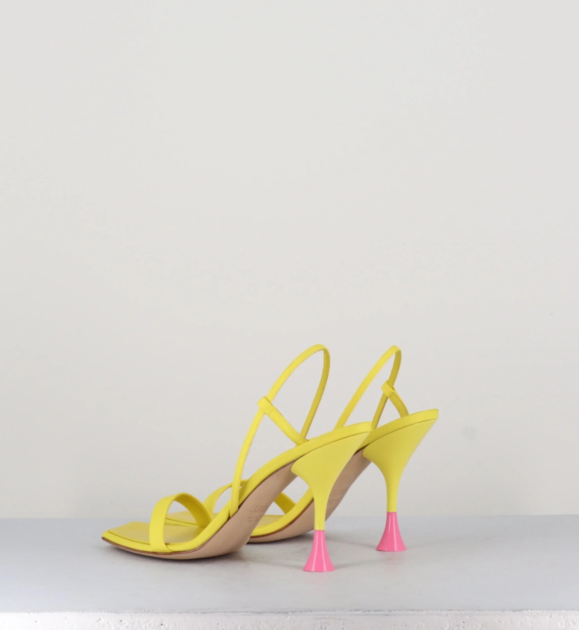 Sandales en cuir & textile jaune, bout carré légèrement asymétrique, bride arrière slingback avec élastique intérieur pour plus d’aisance, montées sur un talon structurée avec détails PVC rose.