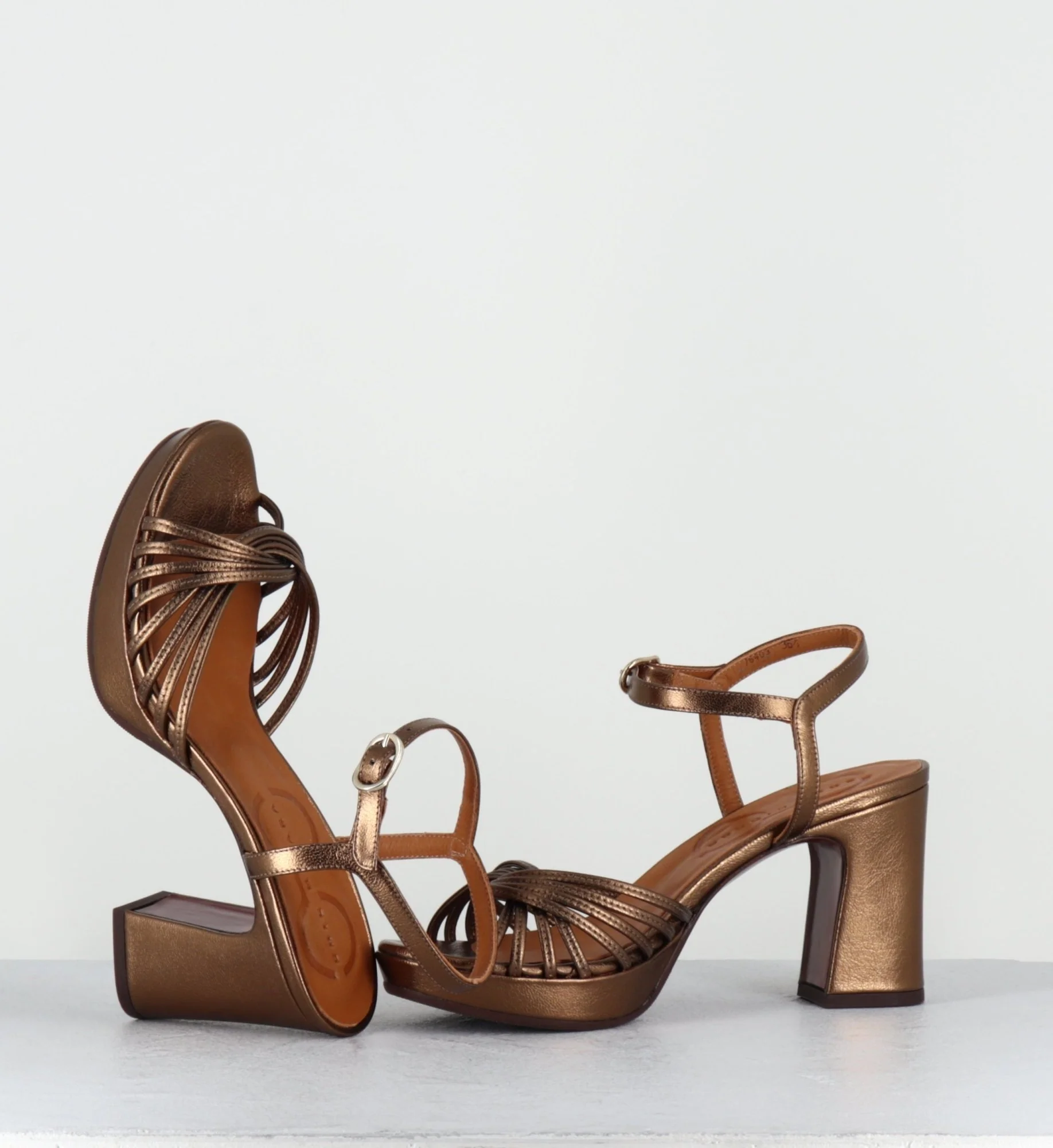 Sandales en cuir métallisé bronze multi-brides entrelacées à l’avant, bout en amande, bride cheville réglable, montées sur une plateforme et un talon recouvert légèrement évasé confortable