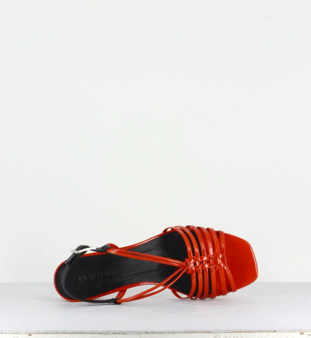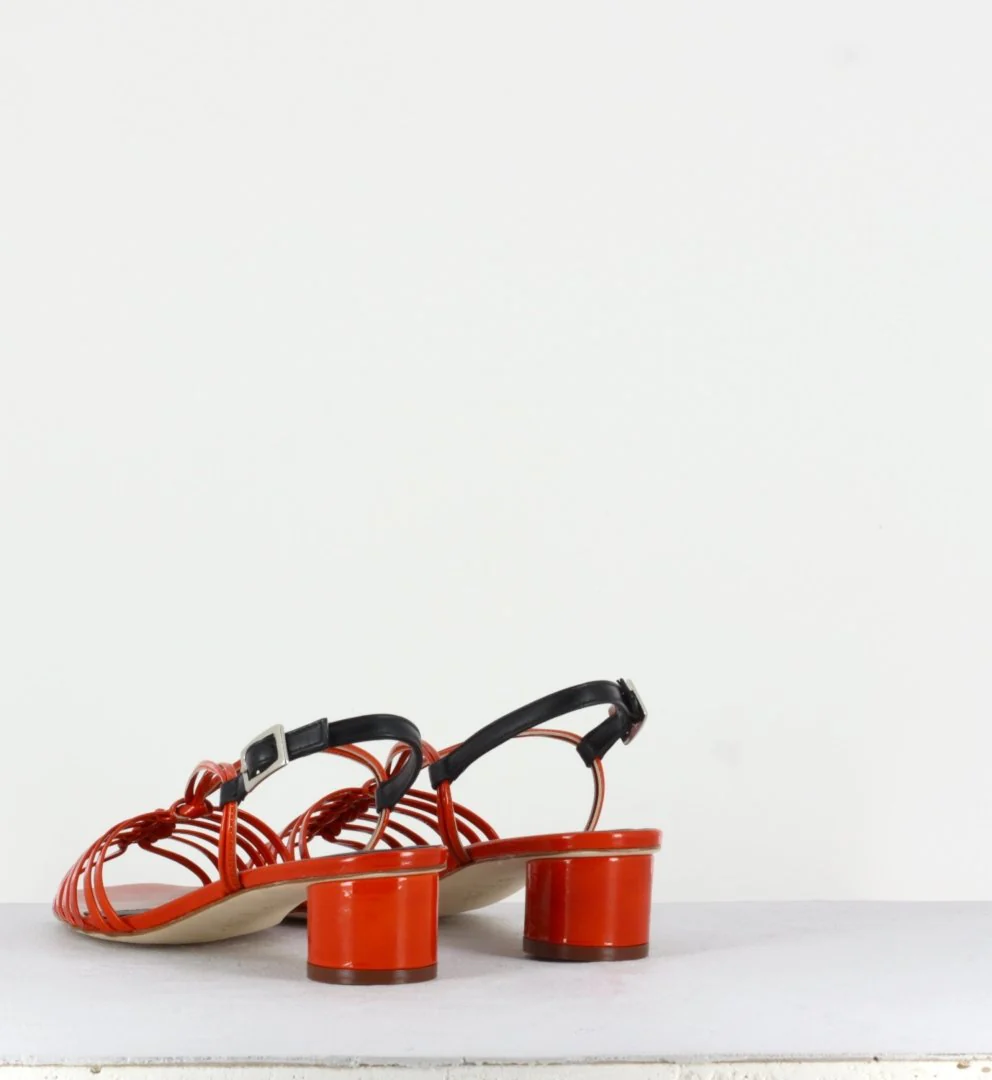 Sandales à brides réalisé dans en cuir d’Italie vernis souple brique orangé et montées sur un petit talon cylindrique.