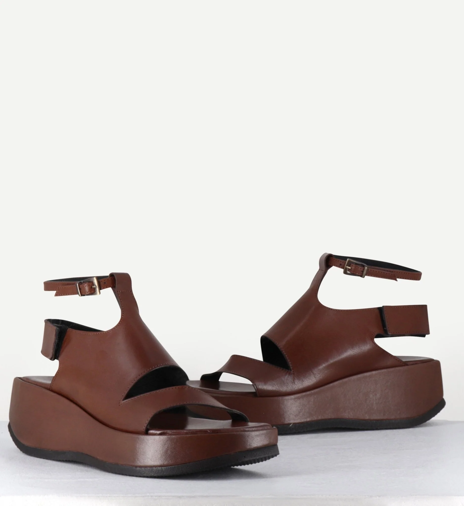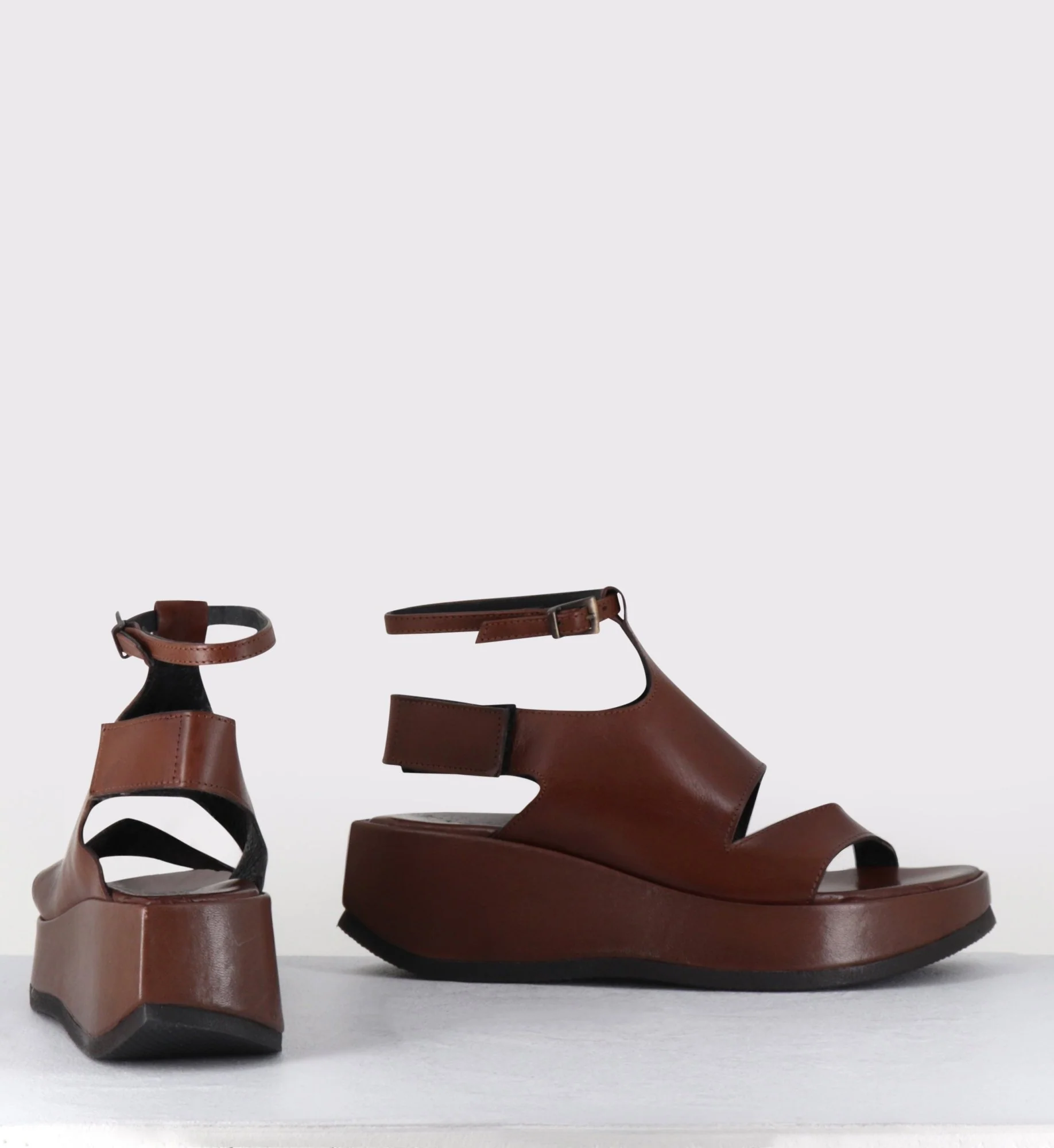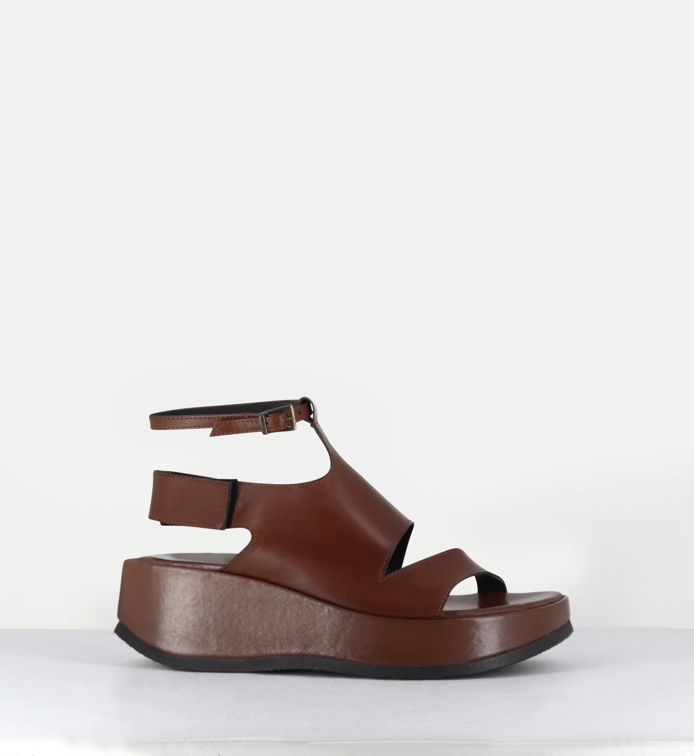 Sandales en cuir lisse marron chocolat, élégante découpe asymétrique, bride arrière velcro réglable + fine bride cheville à boucle, montées sur une semelle légère au design déstructuré Fabrication Artisanale Italienne – Ateliers GarriceLab Chausse légèrement grand