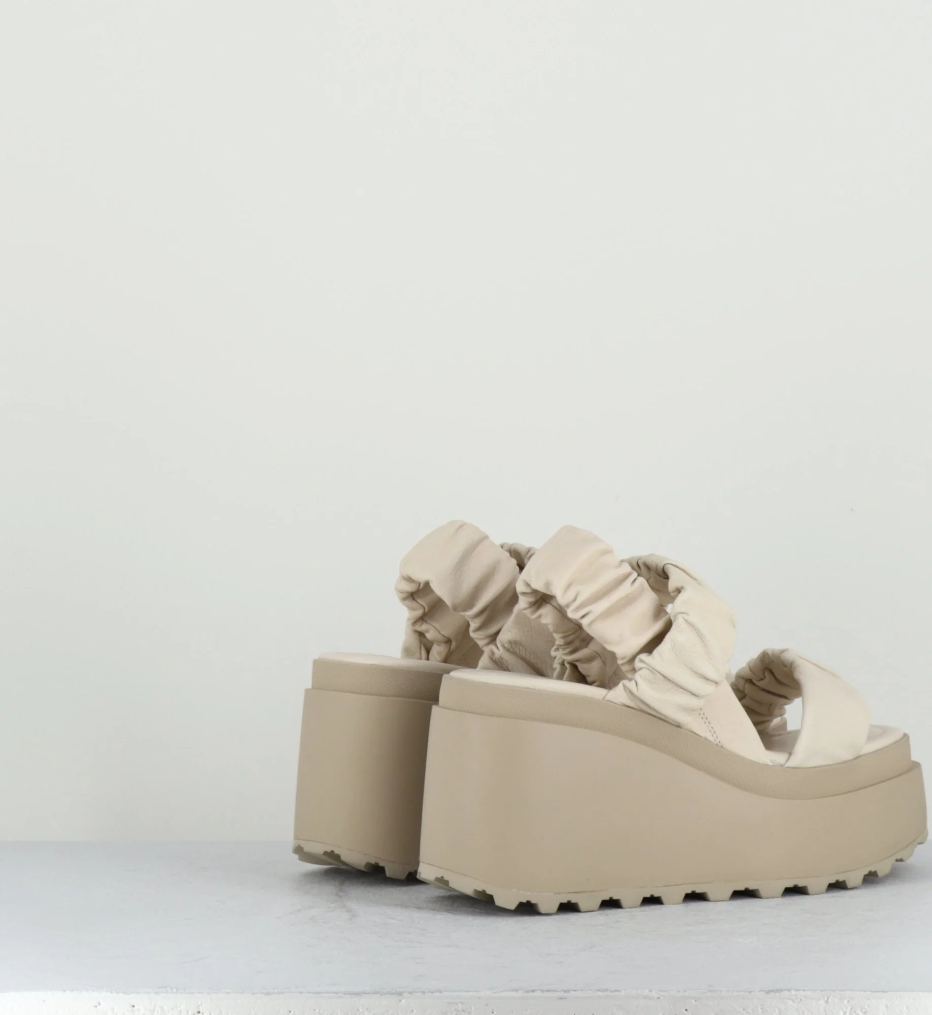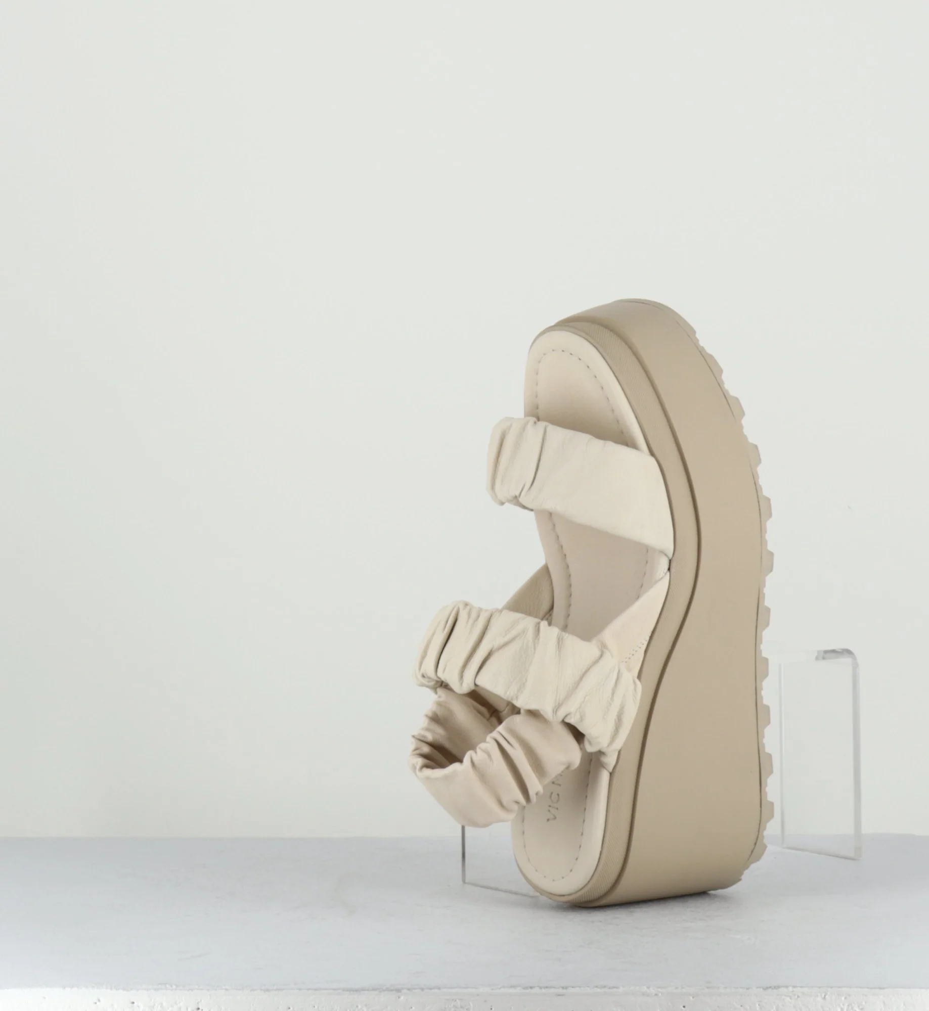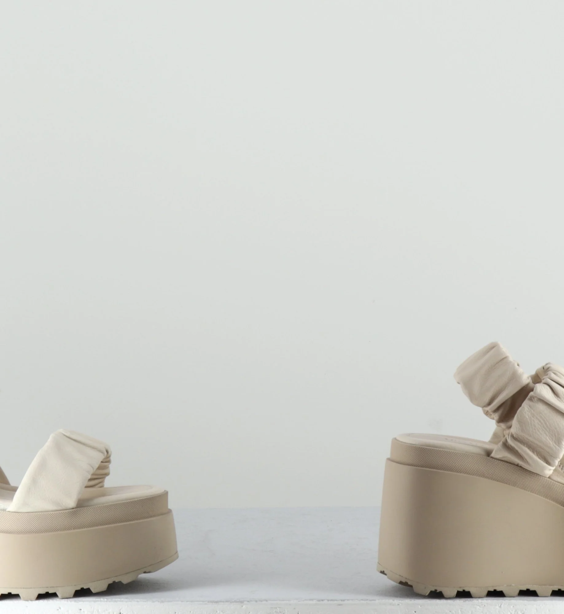 Sandales en cuir grège élastiqué, bout carré arrondi, montées sur une épaisse plateforme compensée à semelle en gomme crantée. Fabrication Artisanale Italienne – Ateliers Vic Matié