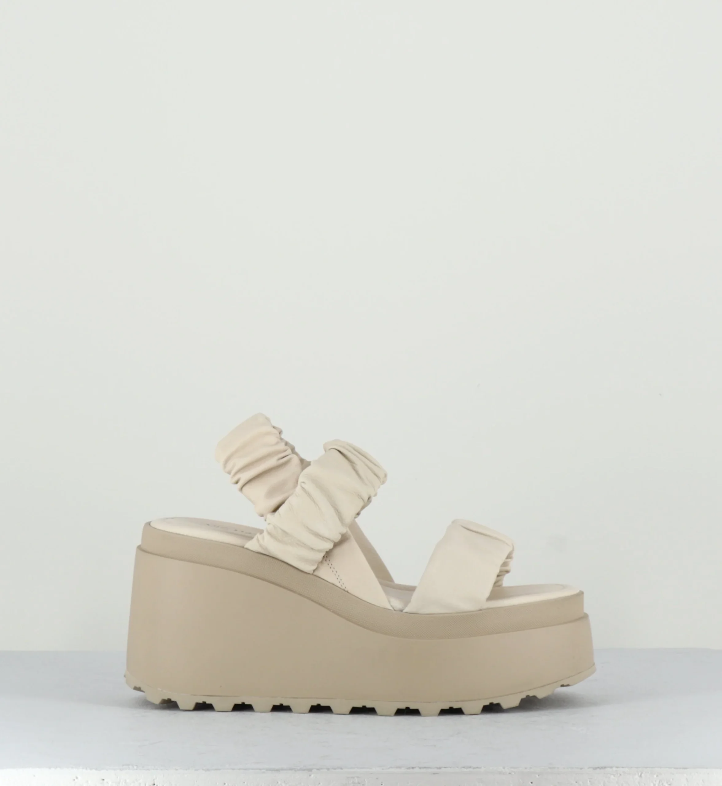 Sandales en cuir grège élastiqué, bout carré arrondi, montées sur une épaisse plateforme compensée à semelle en gomme crantée.