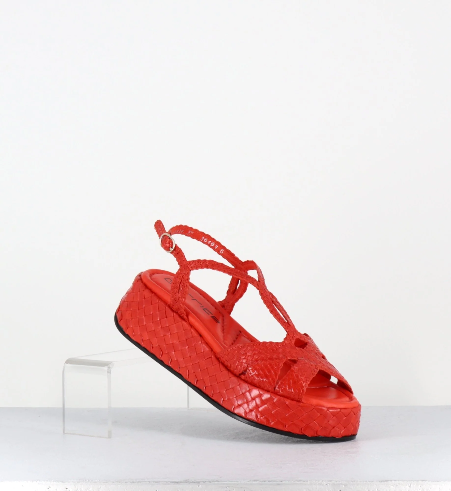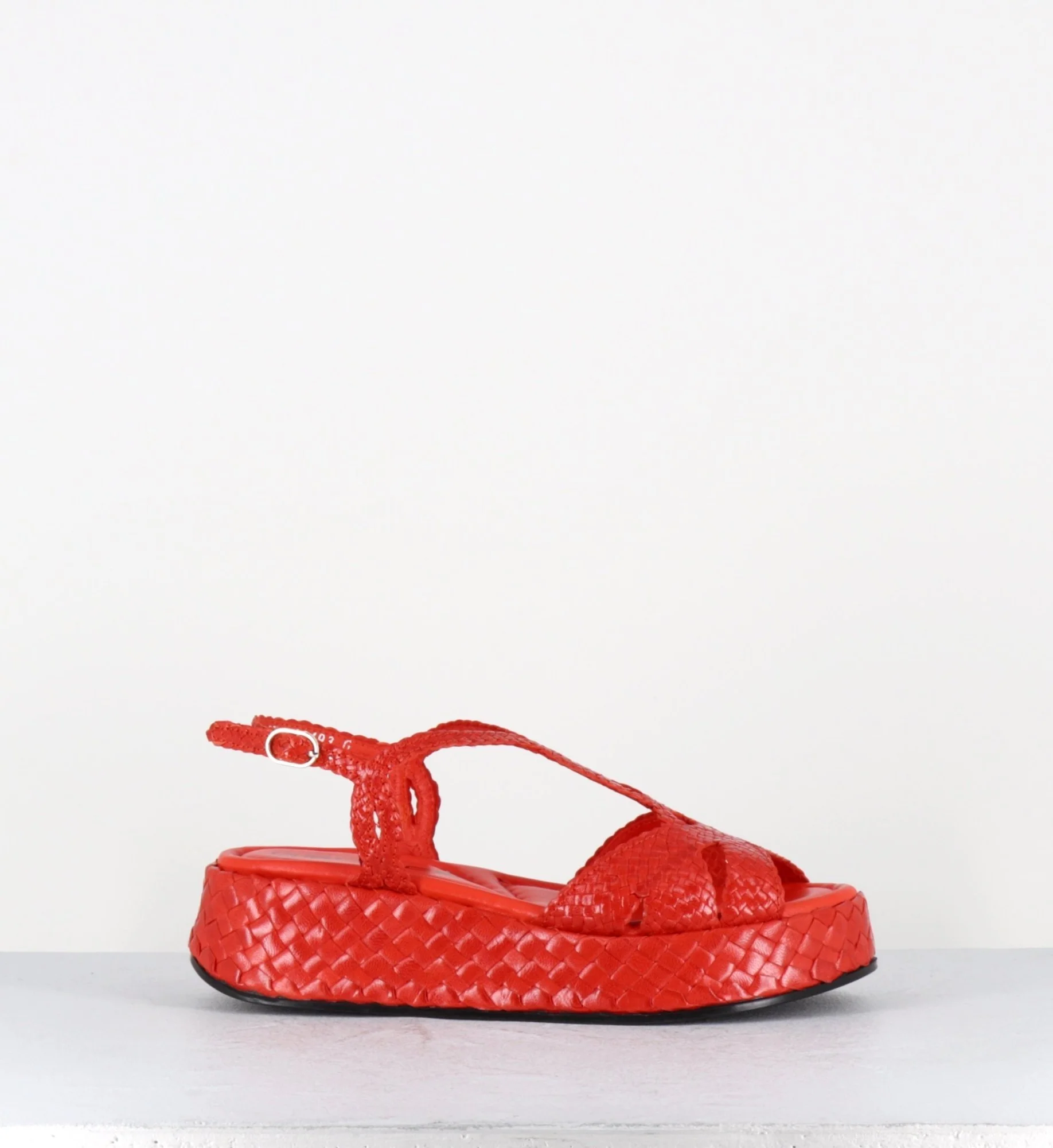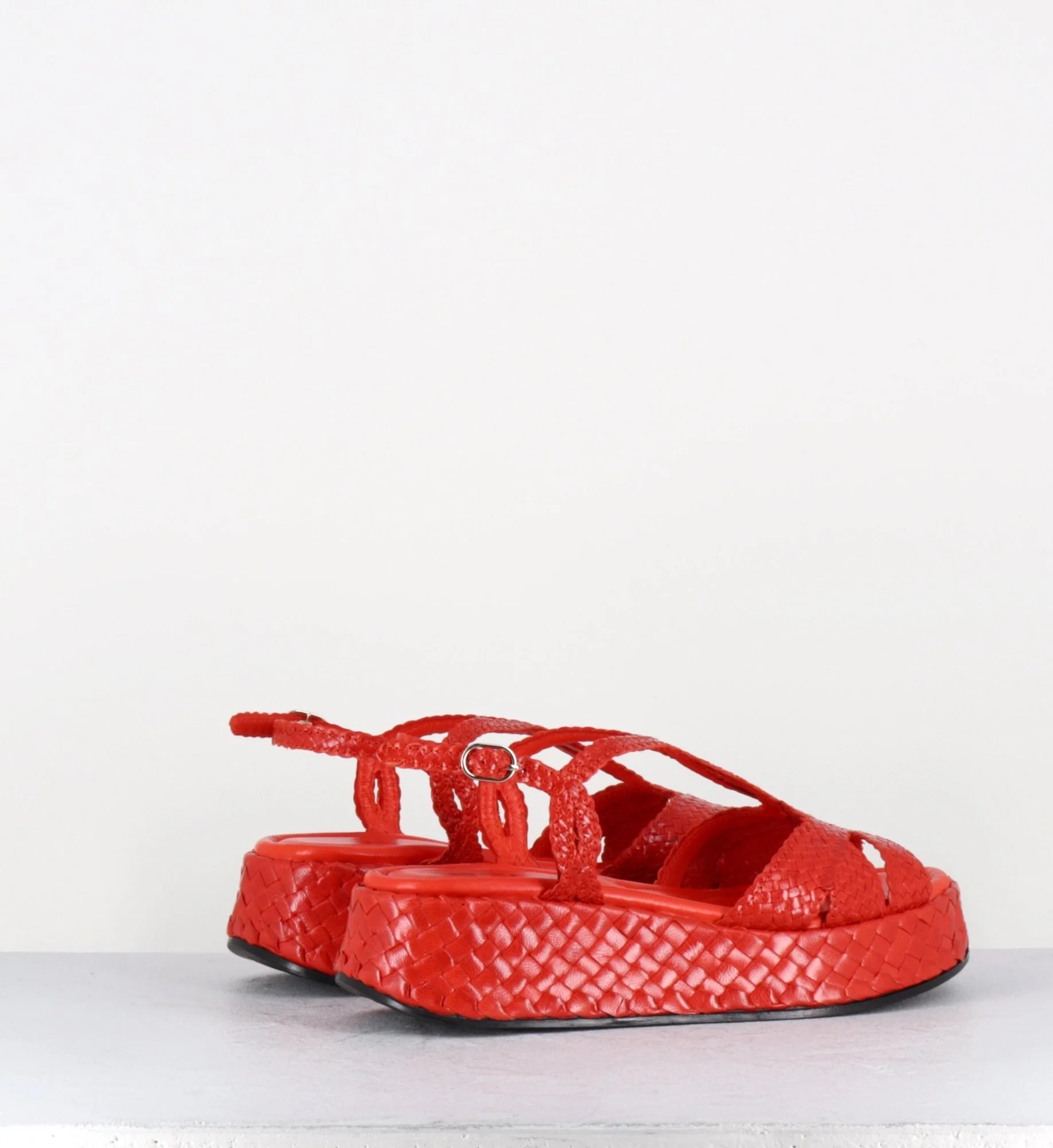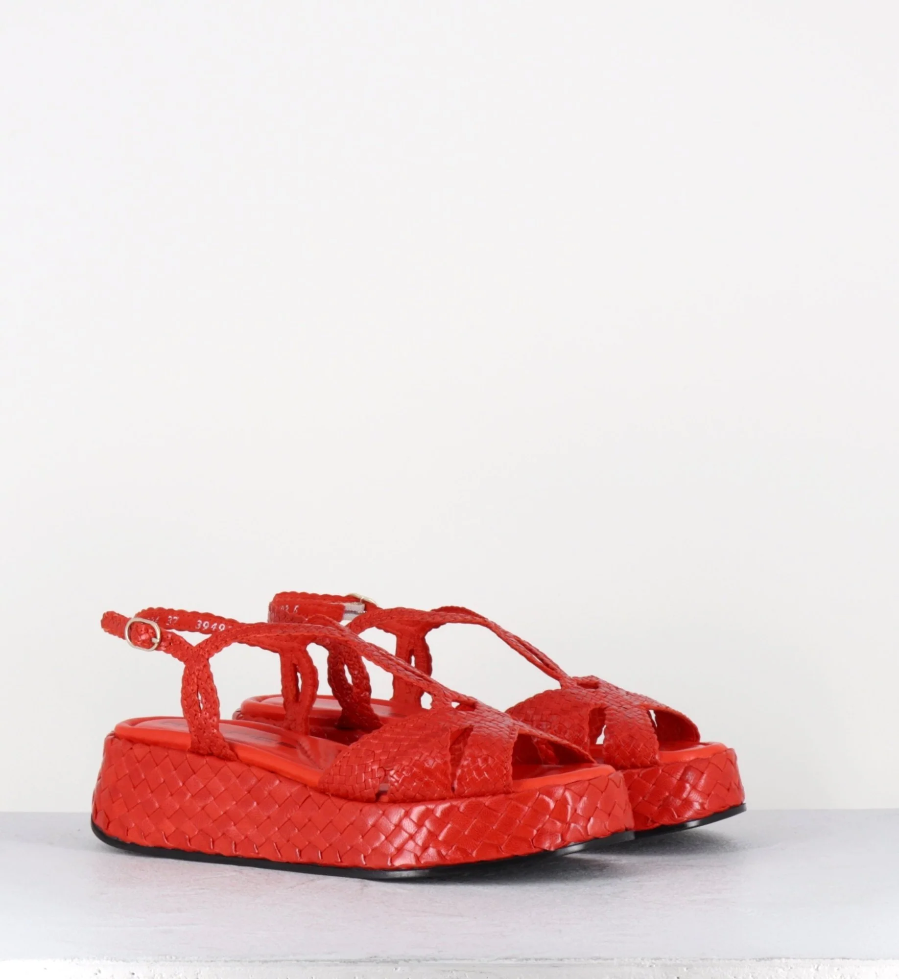 Sandales en cuir tressé rouge corail souple, bride réglable, montées sur une semelle épaisse ultra légère & recouverte