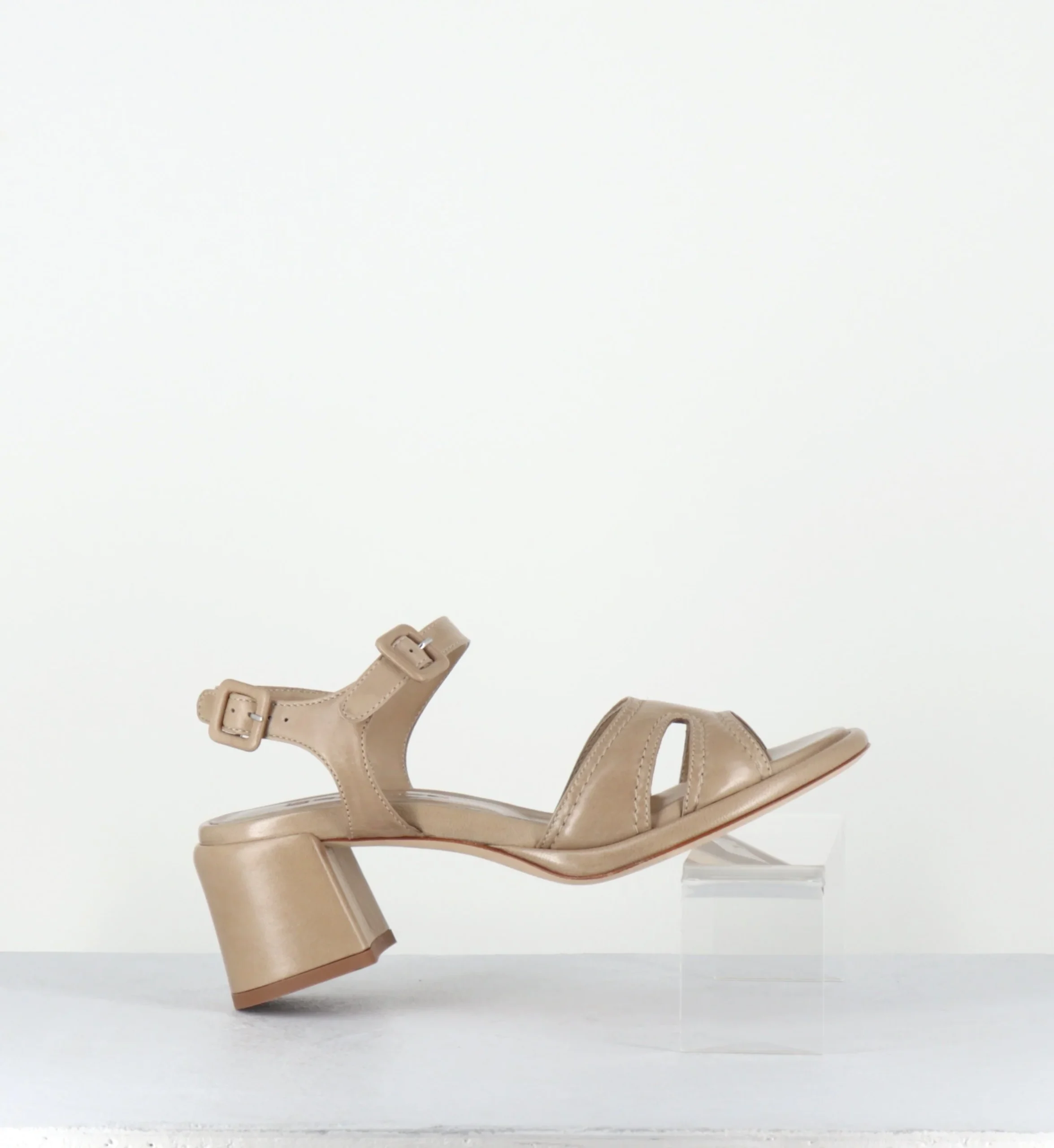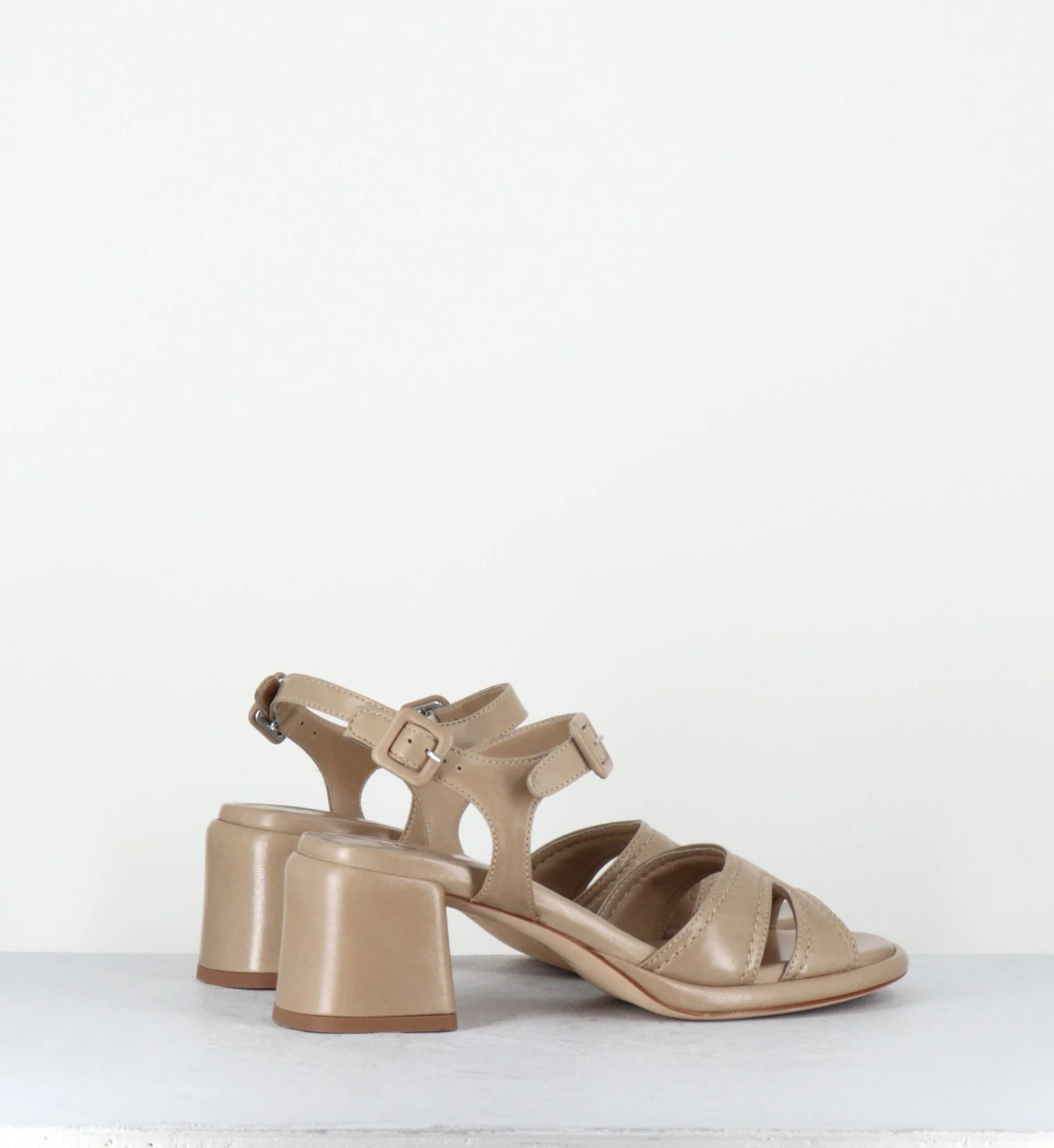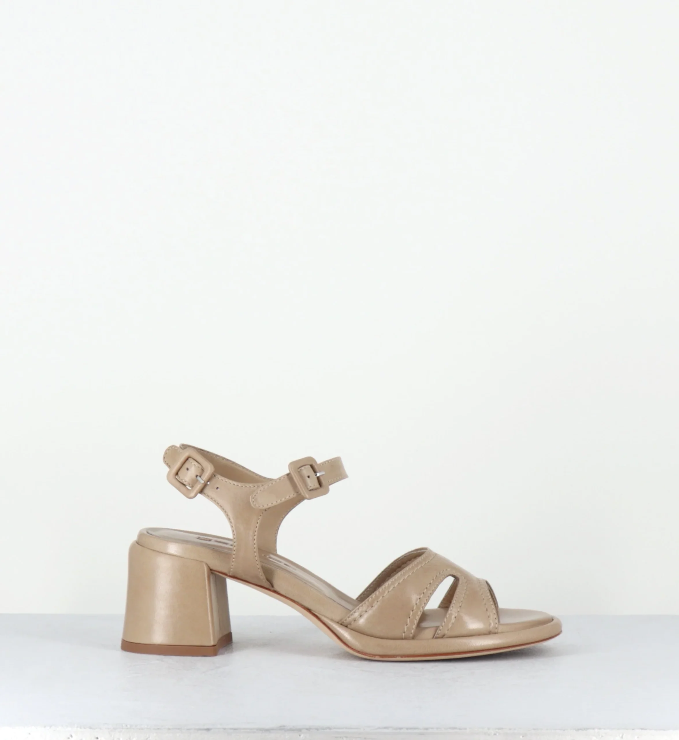 Sandales en agneau plongé beige ‘malte’ extrêmement souple, double brides à petites boucles géométriques réglables, ligne pure avec bout arrondi, montées sur une double semelle & un talon bloc confortable