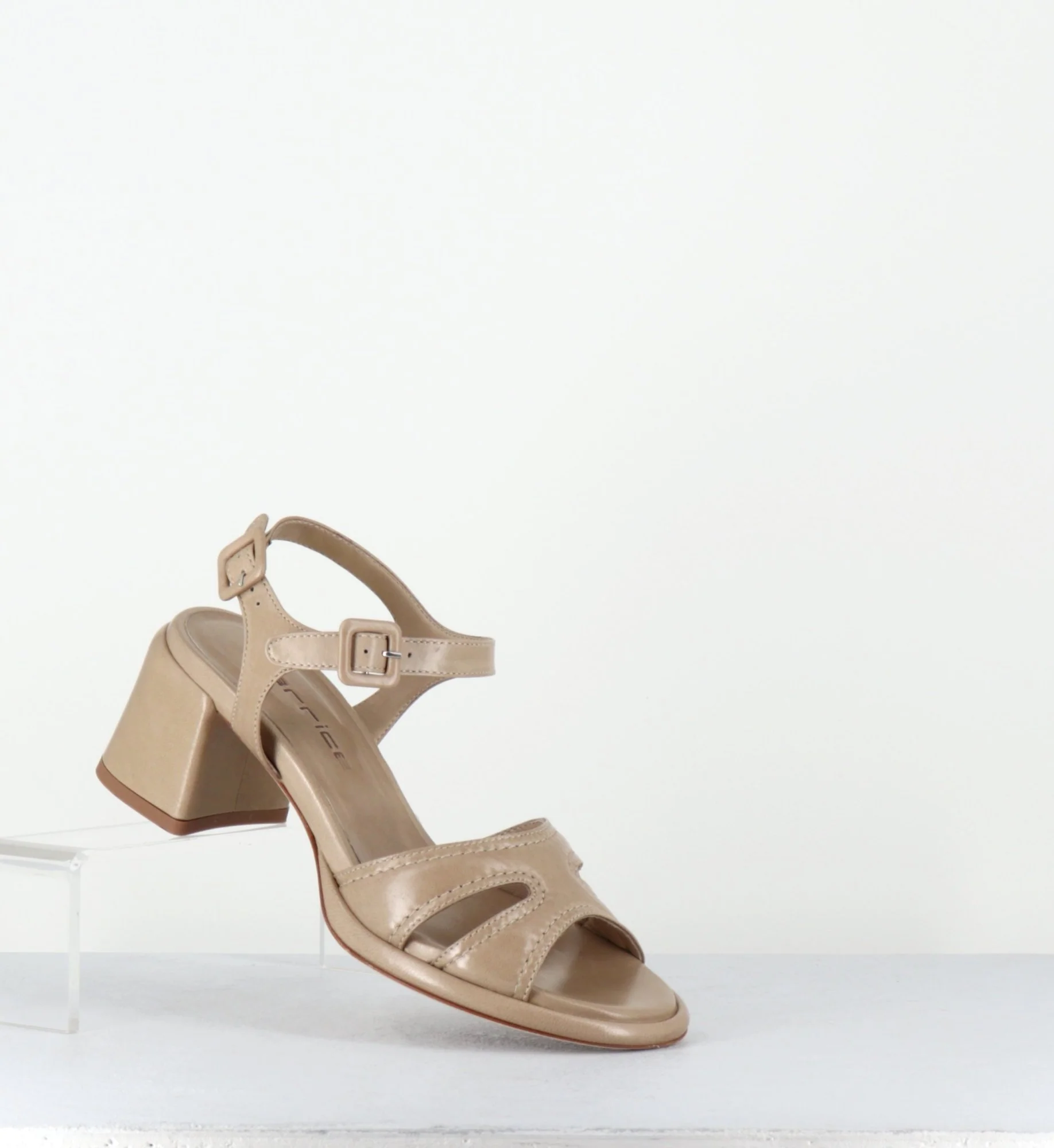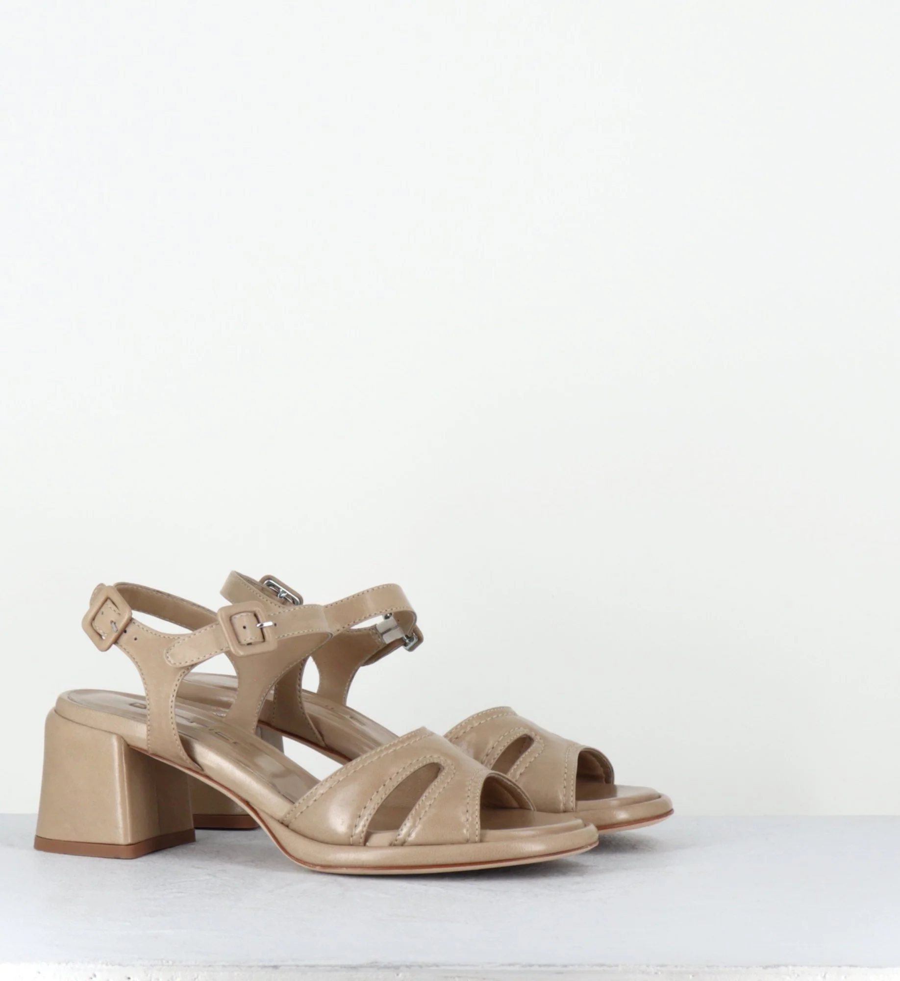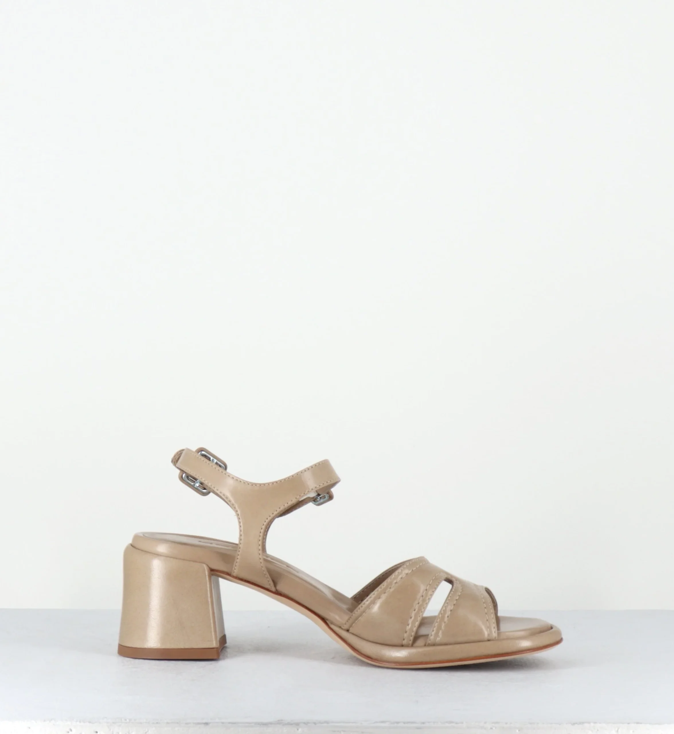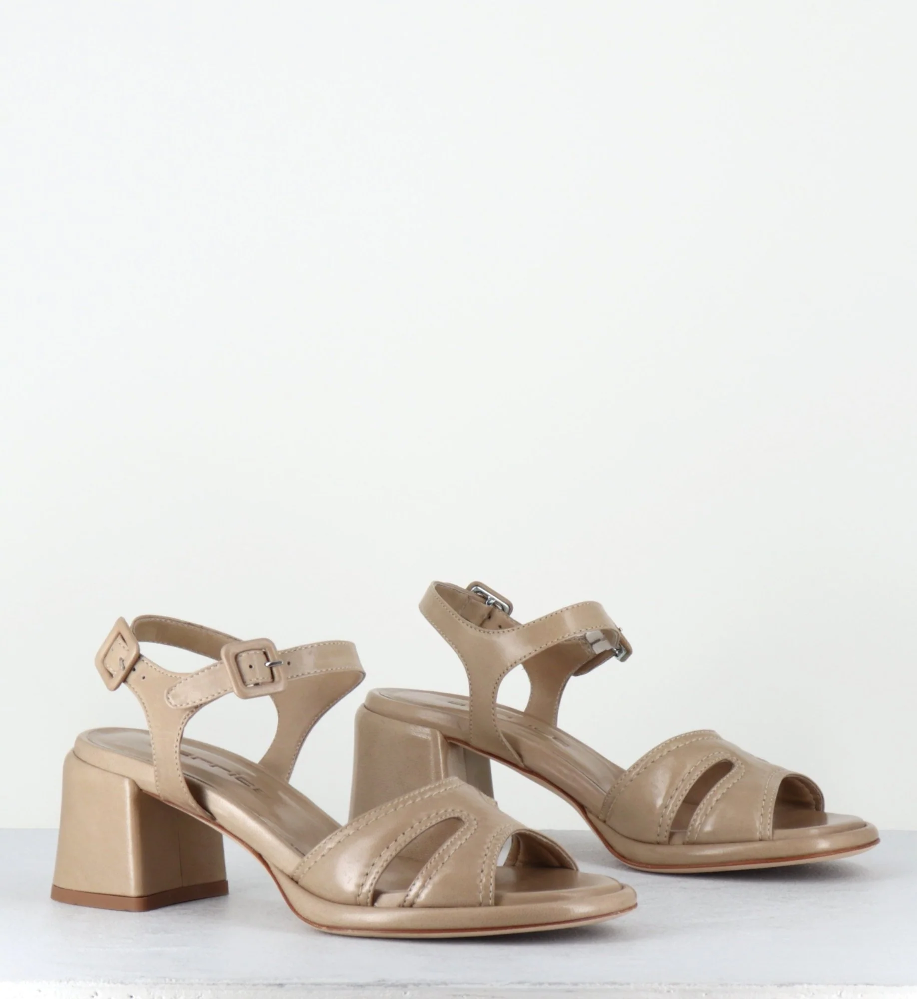 Sandales en agneau plongé beige ‘malte’ extrêmement souple, double brides à petites boucles géométriques réglables, ligne pure avec bout arrondi, montées sur une double semelle & un talon bloc confortable