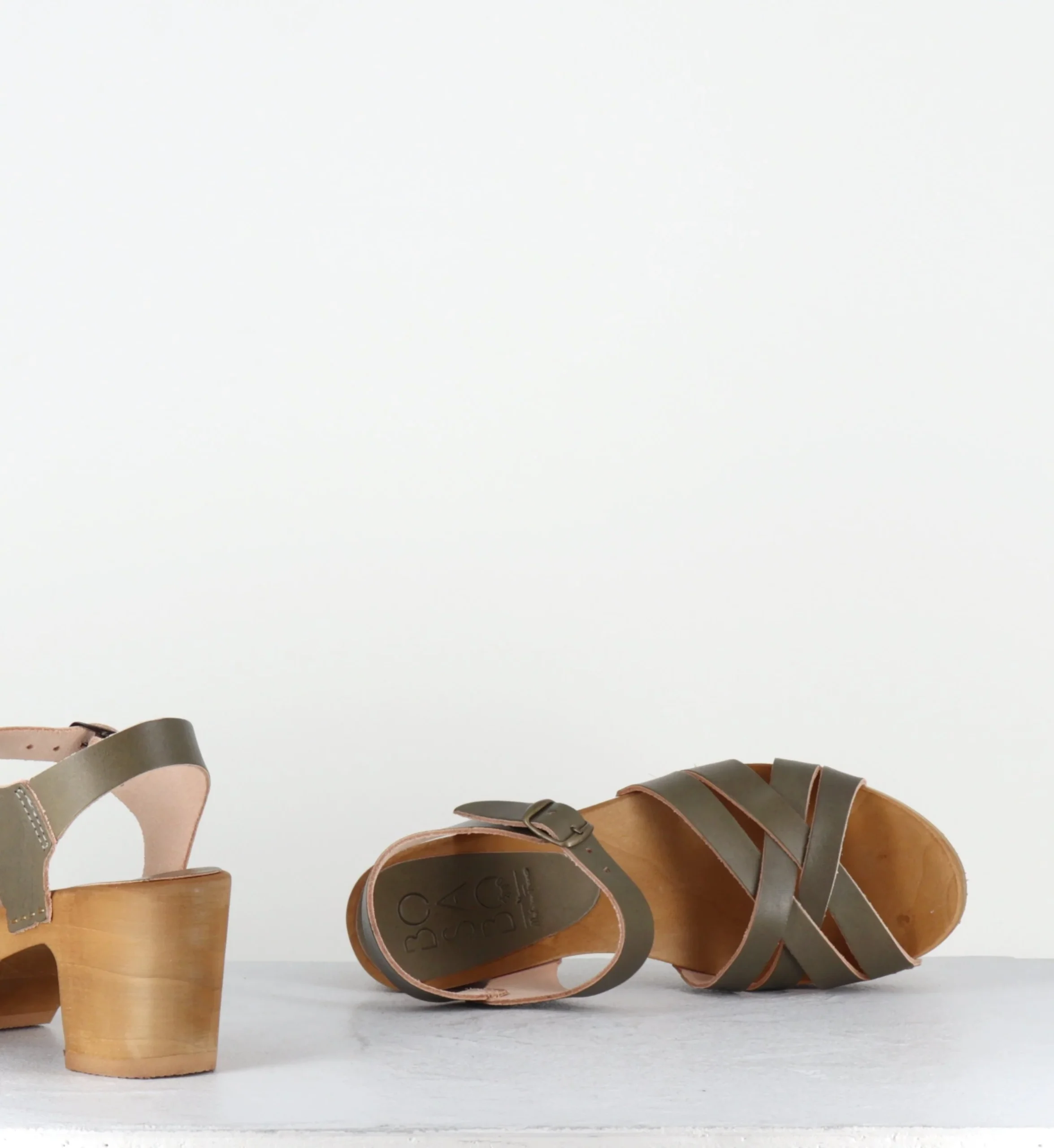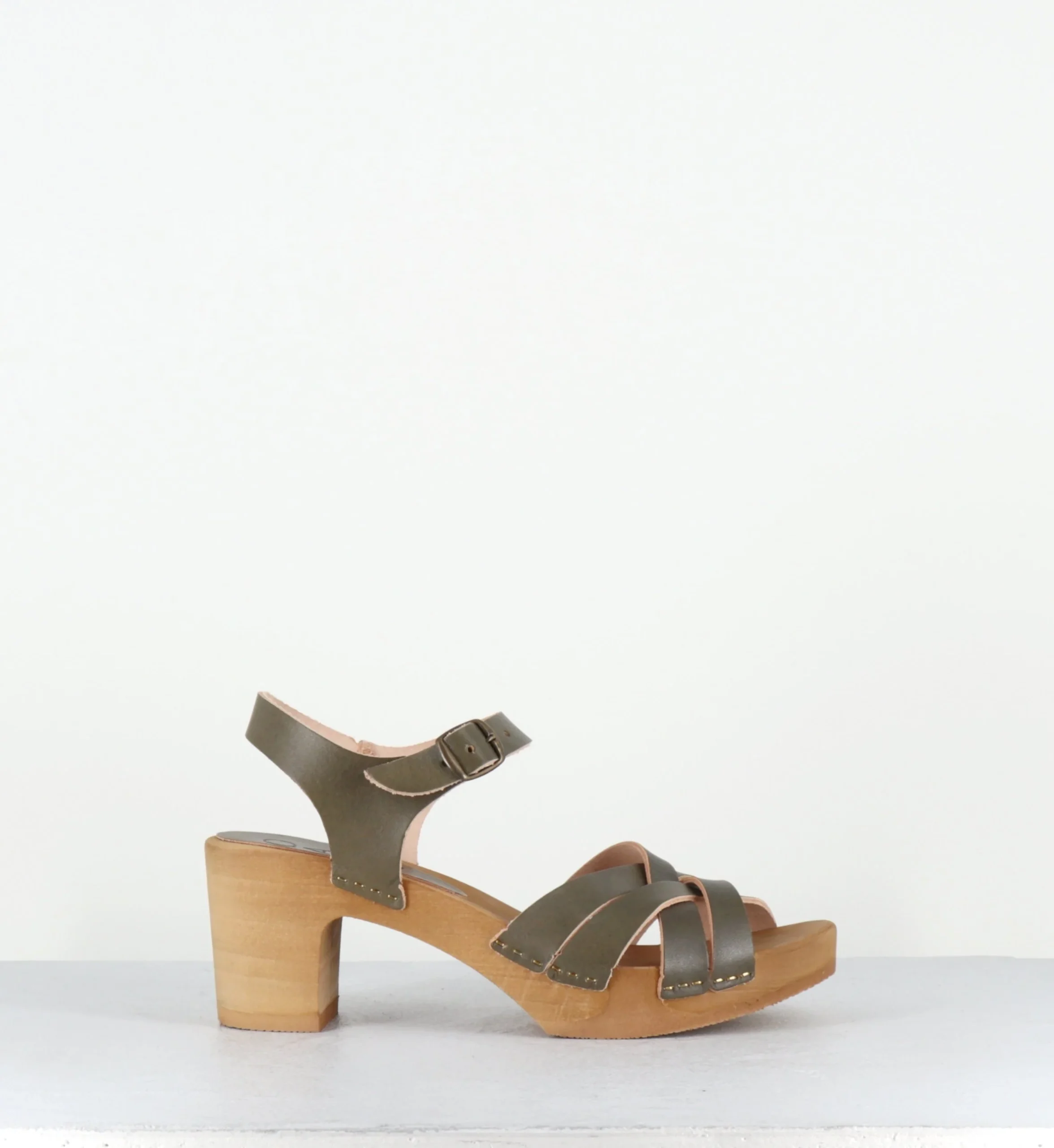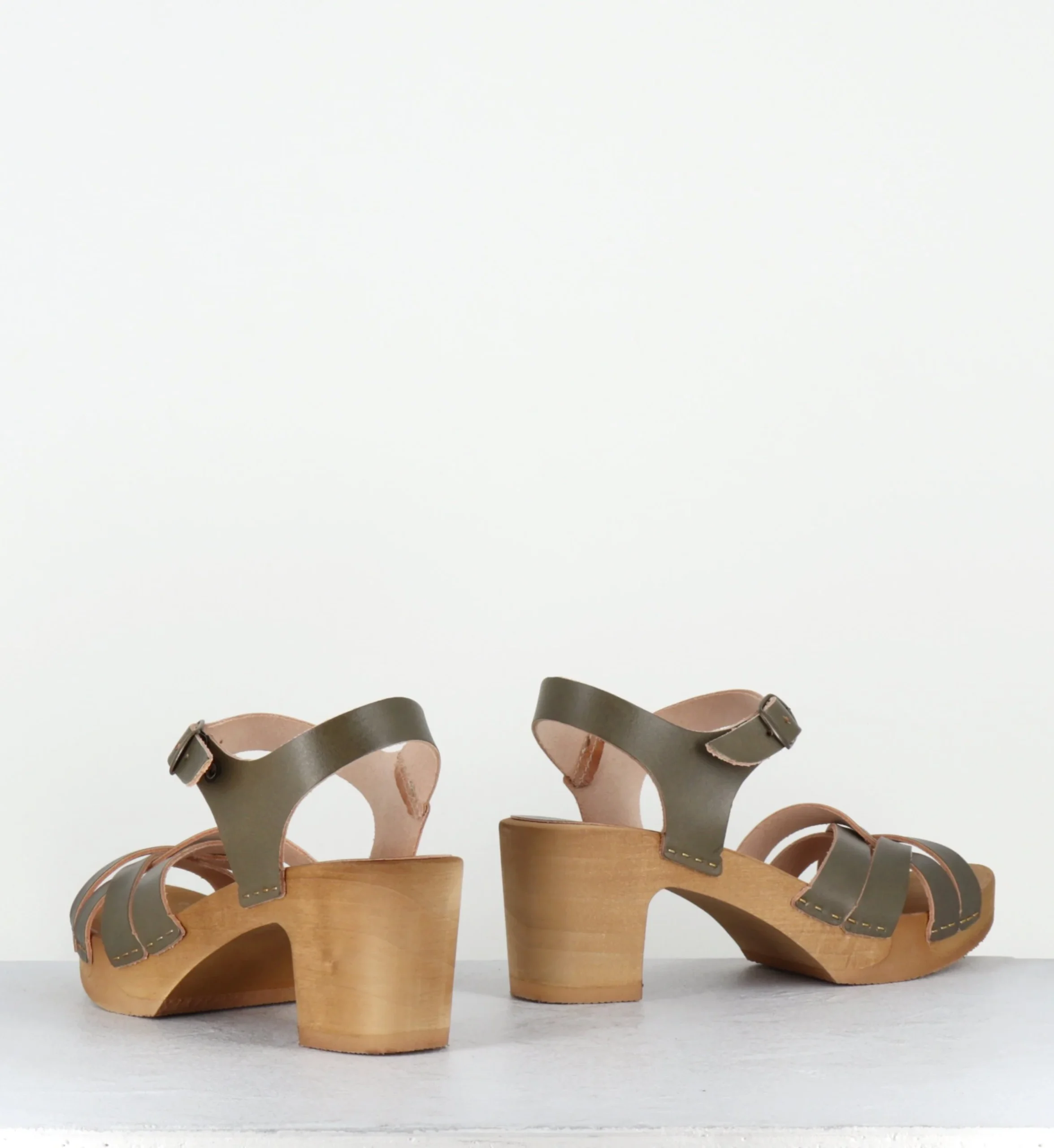 Sandales-sabots multi-brides en cuir vert kaki, montées sur une semelle à talon moyen, réalisée dans un bois naturel ultra léger avec un insert de caoutchouc qui permet une vrai flexibilité ! D’un grand confort