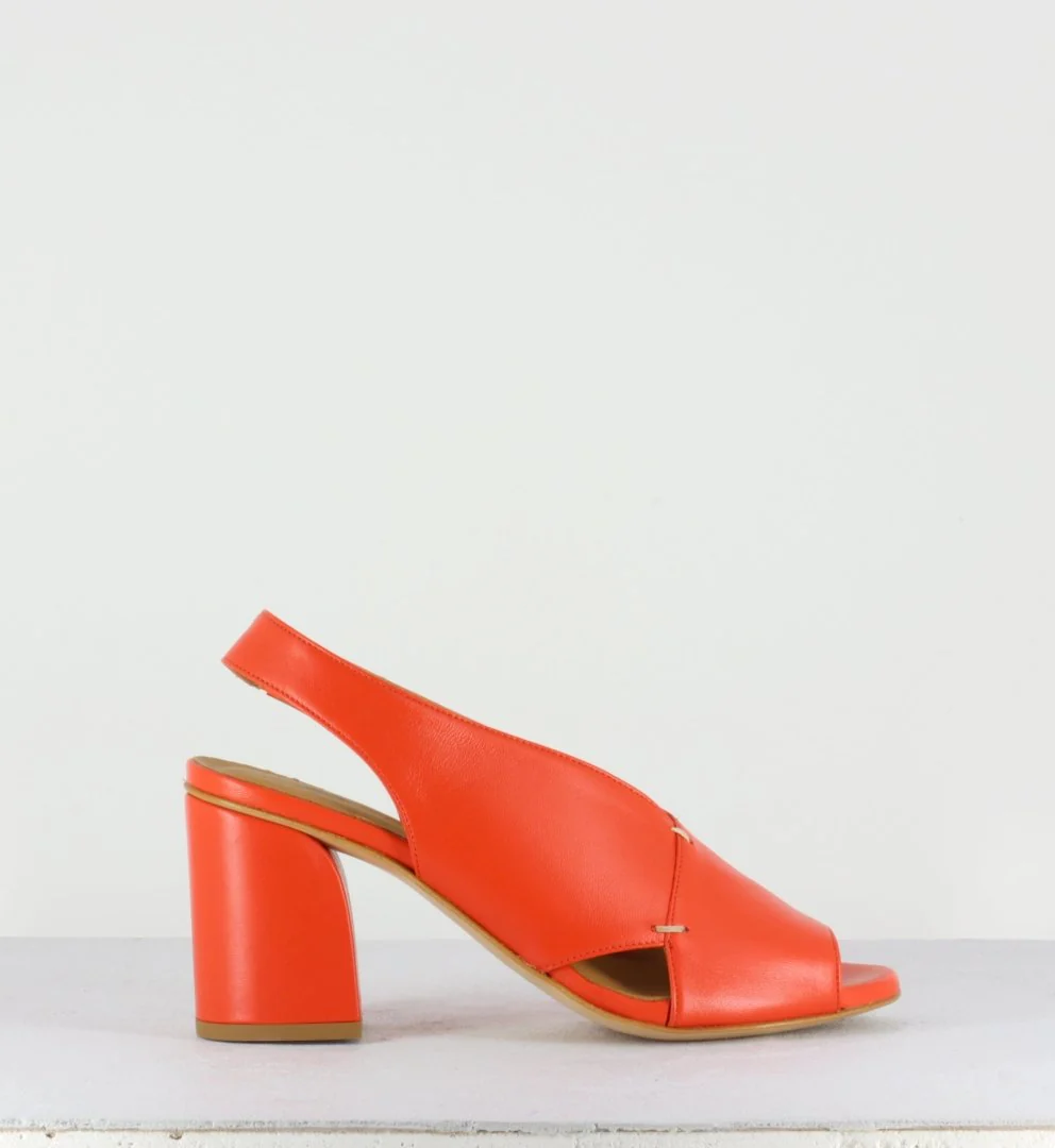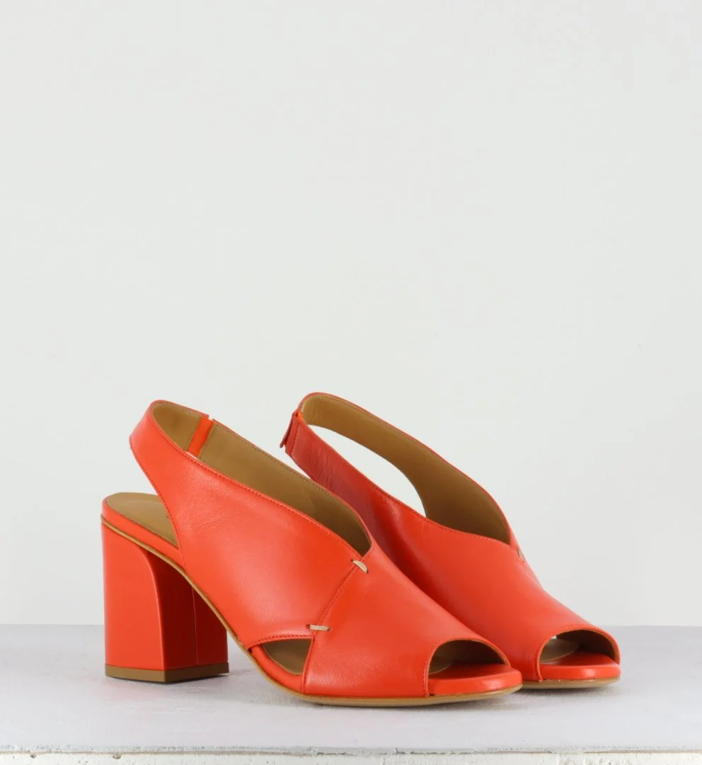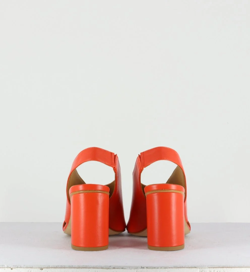 Sandales en cuir orange à talon épais Garrice Lab avec bride arrière élastiquée. Conçues dans les Ateliers Italiens