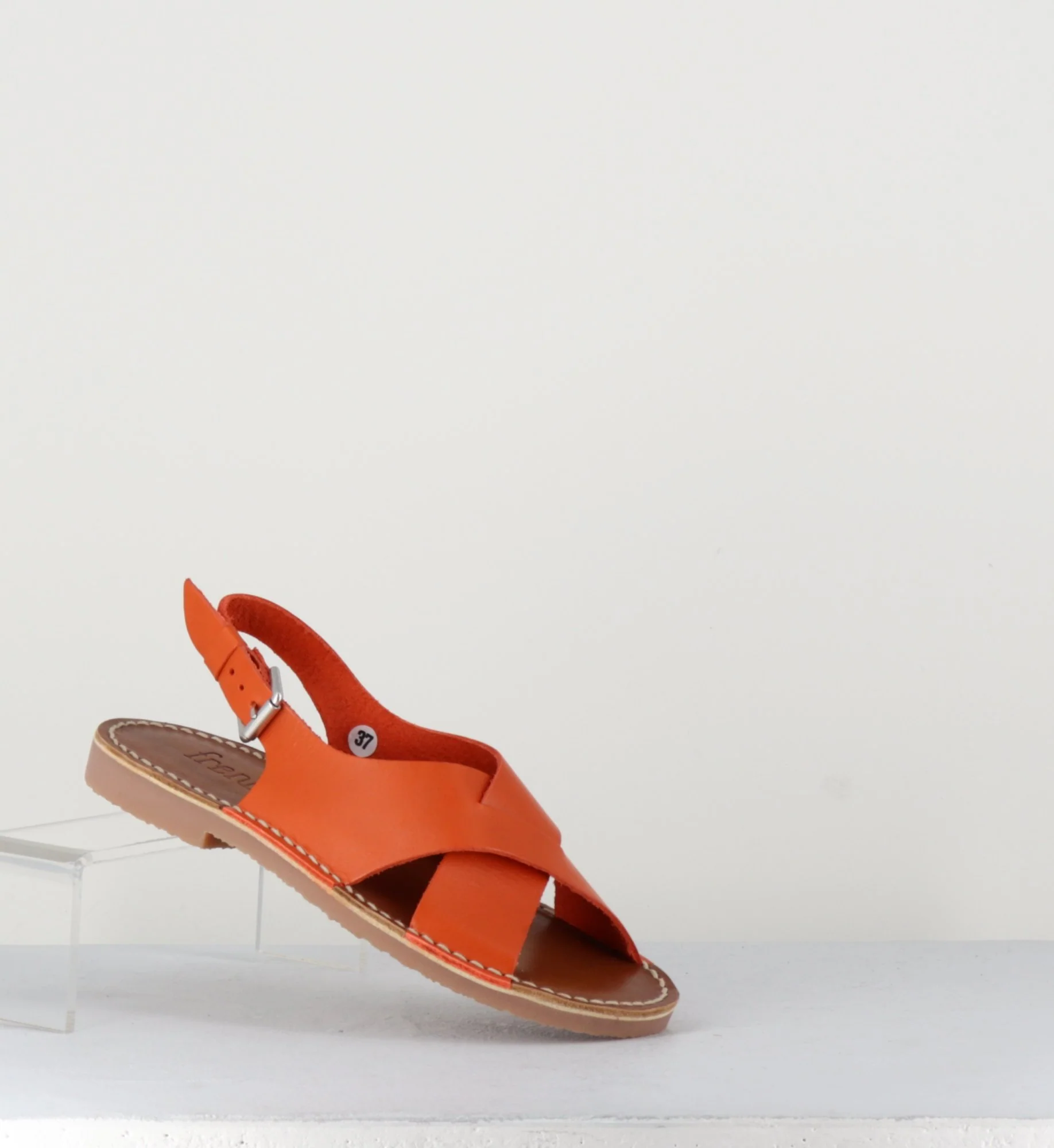 Sandales en cuir orange croisé, bride arrière réglable, monté sur une fine semelle cousue.