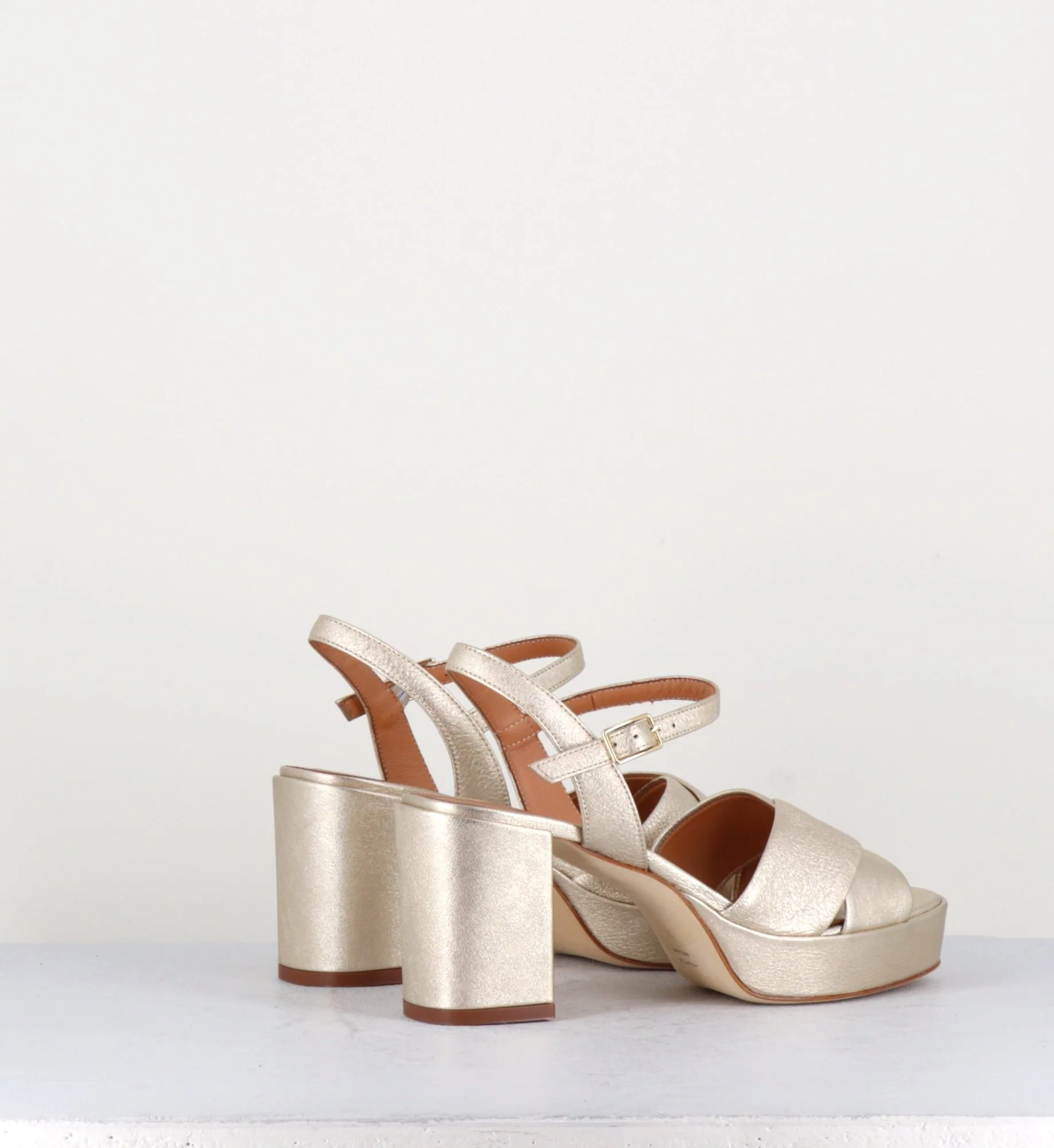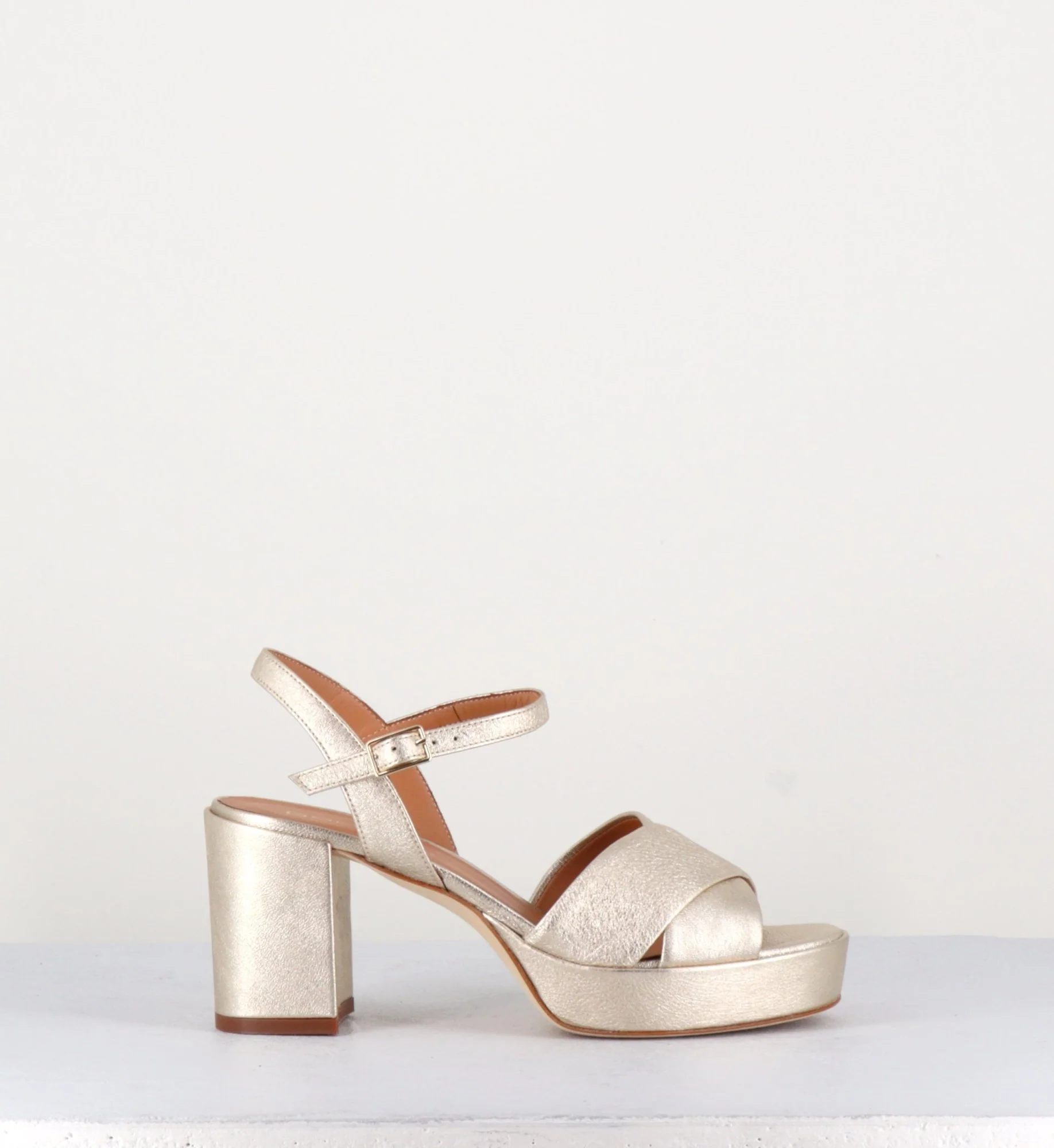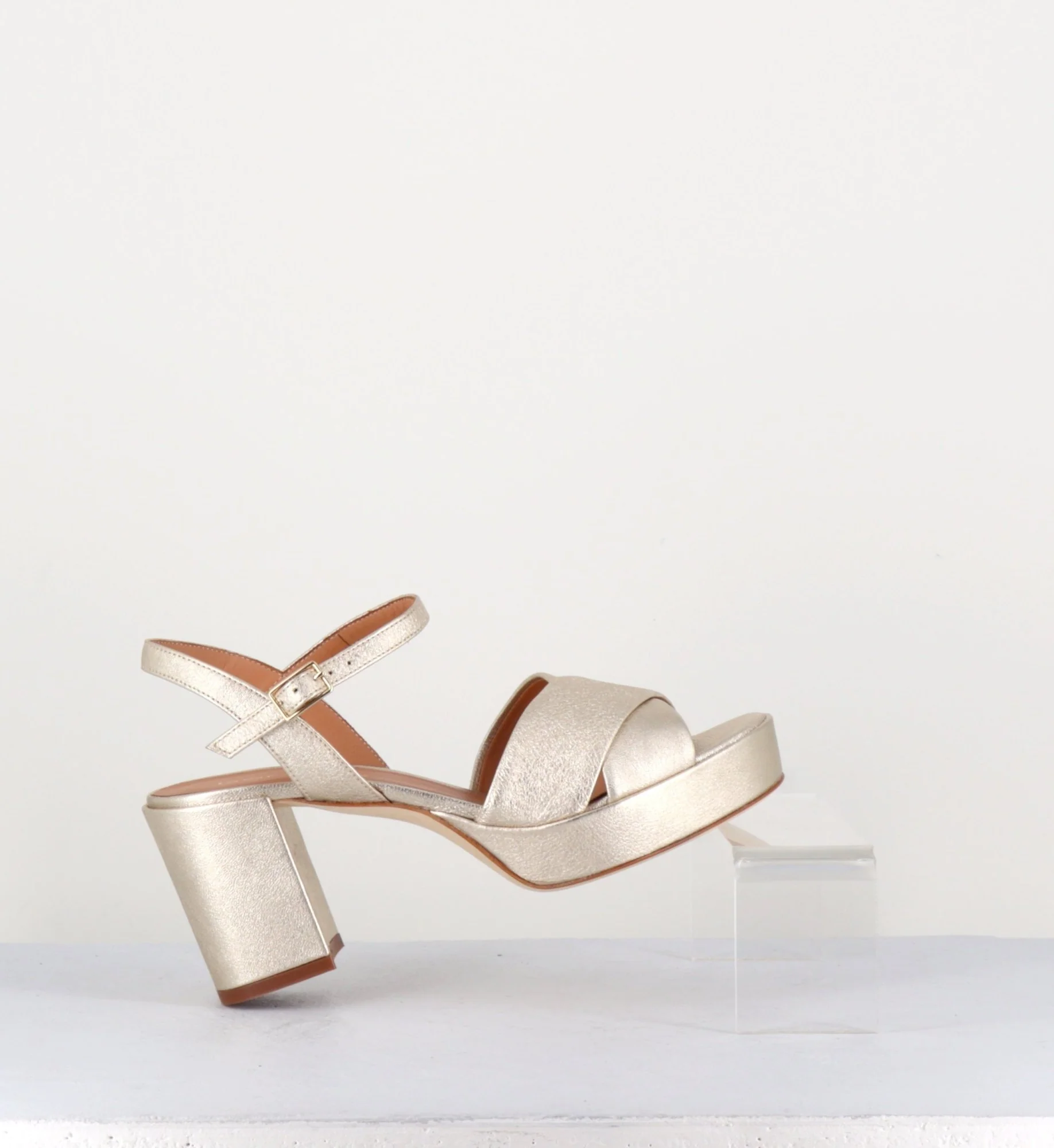 Sandales en cuir souple métallisé champagne, bout carré arrondi, brides croisées, fine bride à boucle réglable sur la cheville, montées sur un talon bloc et une plateforme recouverts. Fabrication Artisanale Italienne – Ateliers GarriceLab Chausse légèrement grand.