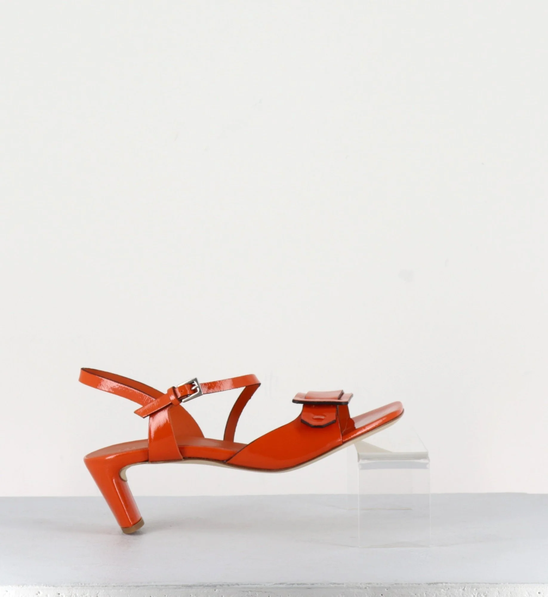 Sandales en cuir vernis souple couleur orange sanguine, bout carré doux, à l’avant faux passant géométrique esprit 70s, élégante bride asymétrique réglable, montées sur un petit talon stylisé confortable Fabrication Artisanale Italienne – Ateliers Del Carlo