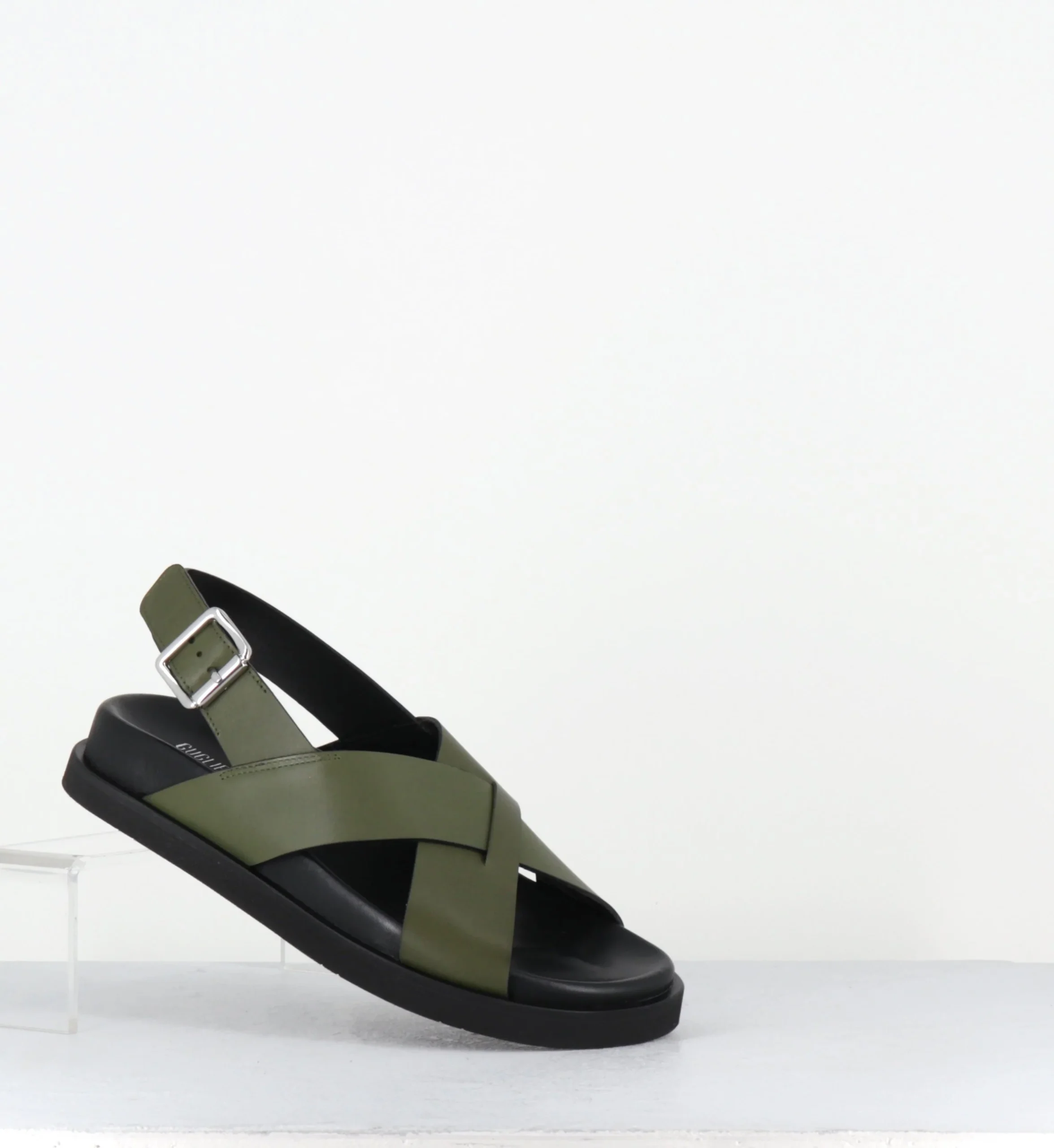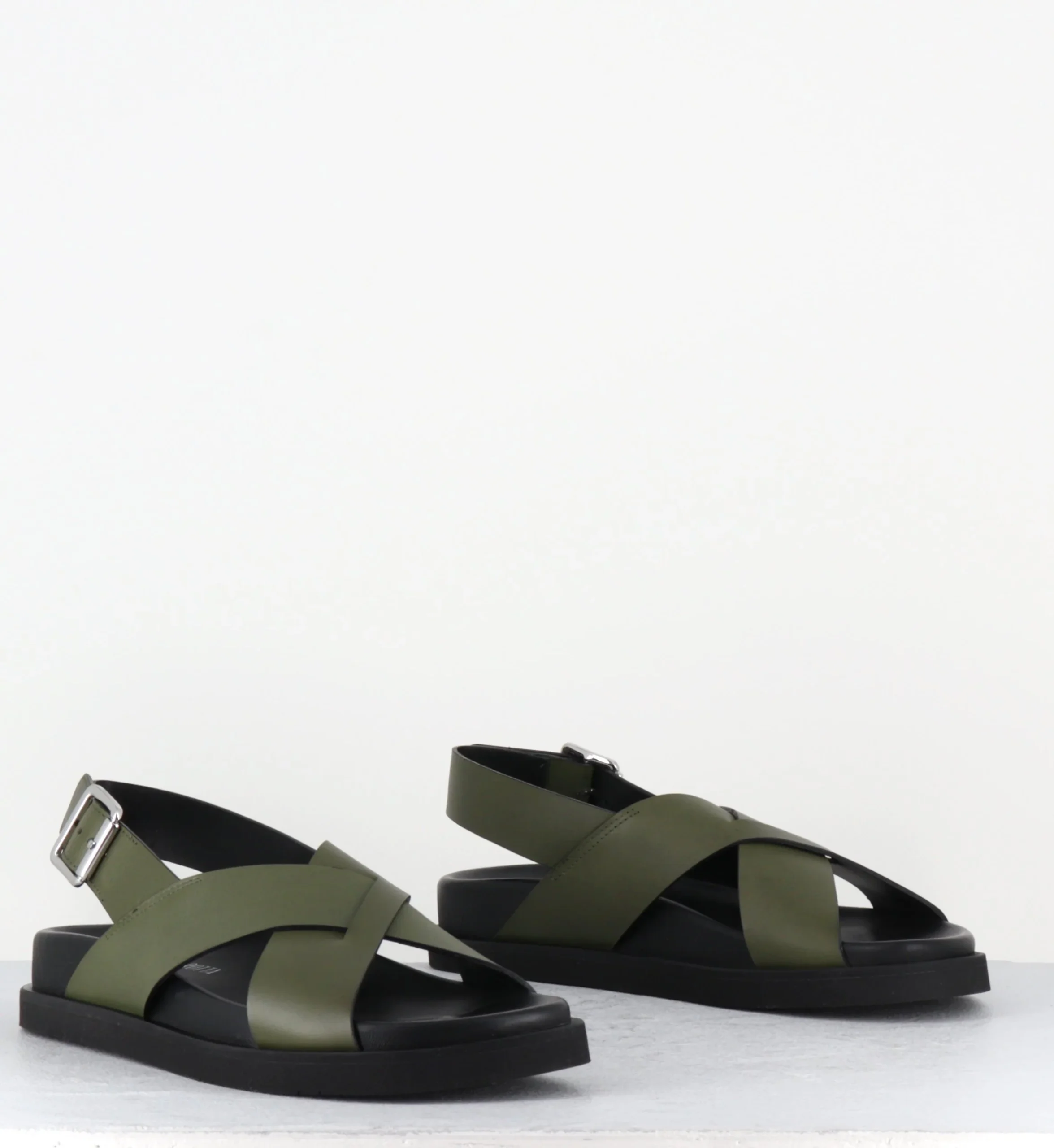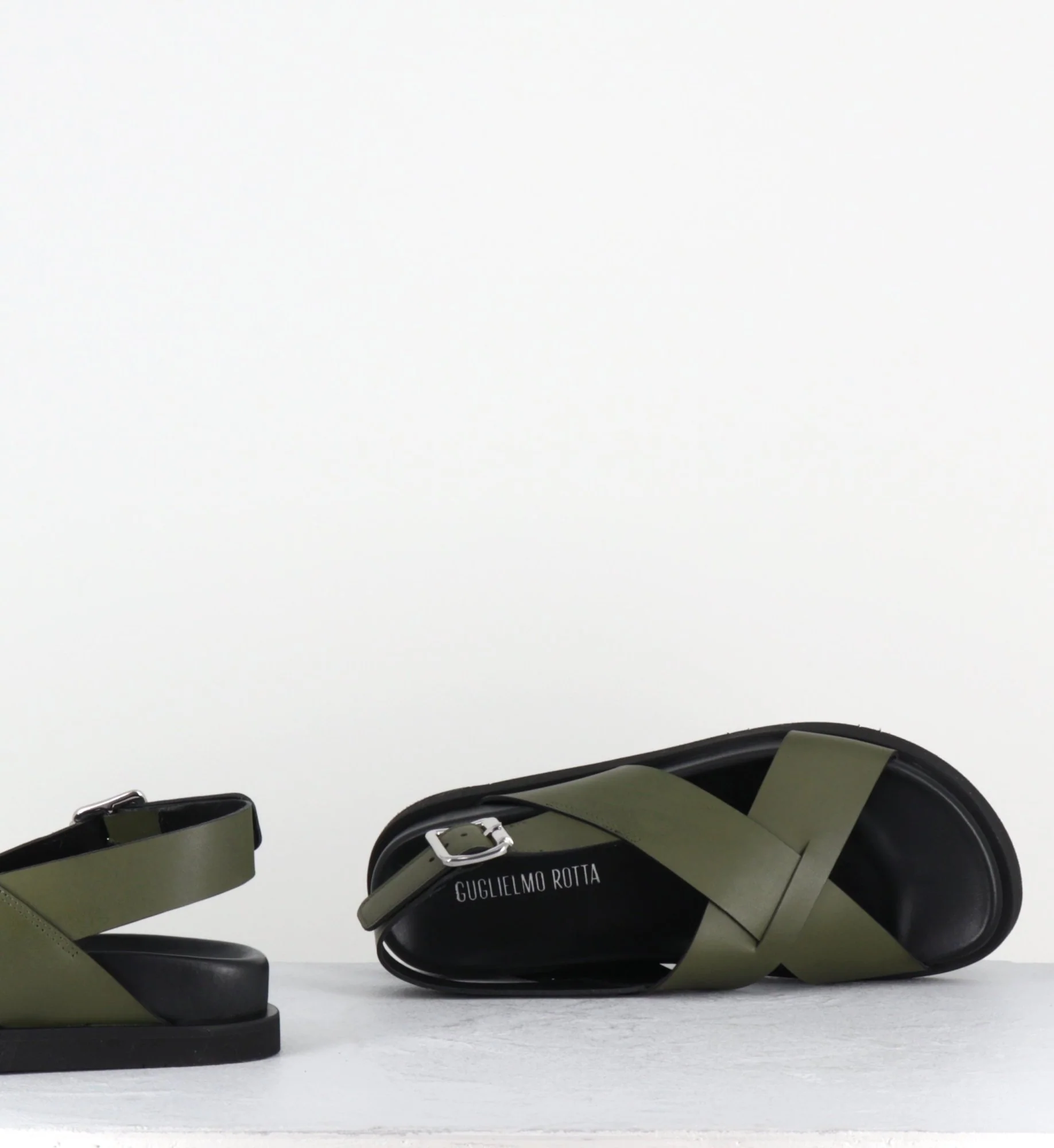 Sandales en cuir vert khaki montées sur une semelle extra light anatomique Fabrication Artisanale Italienne – Ateliers Rotta Chausse légèrement grand