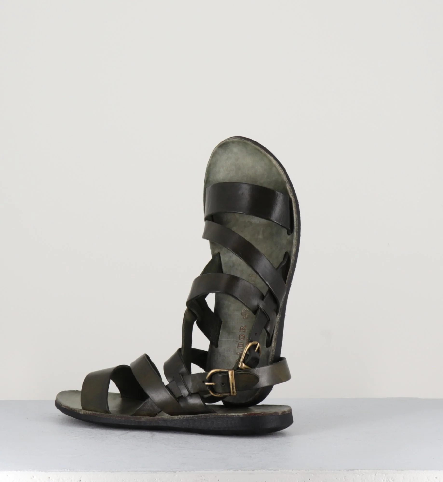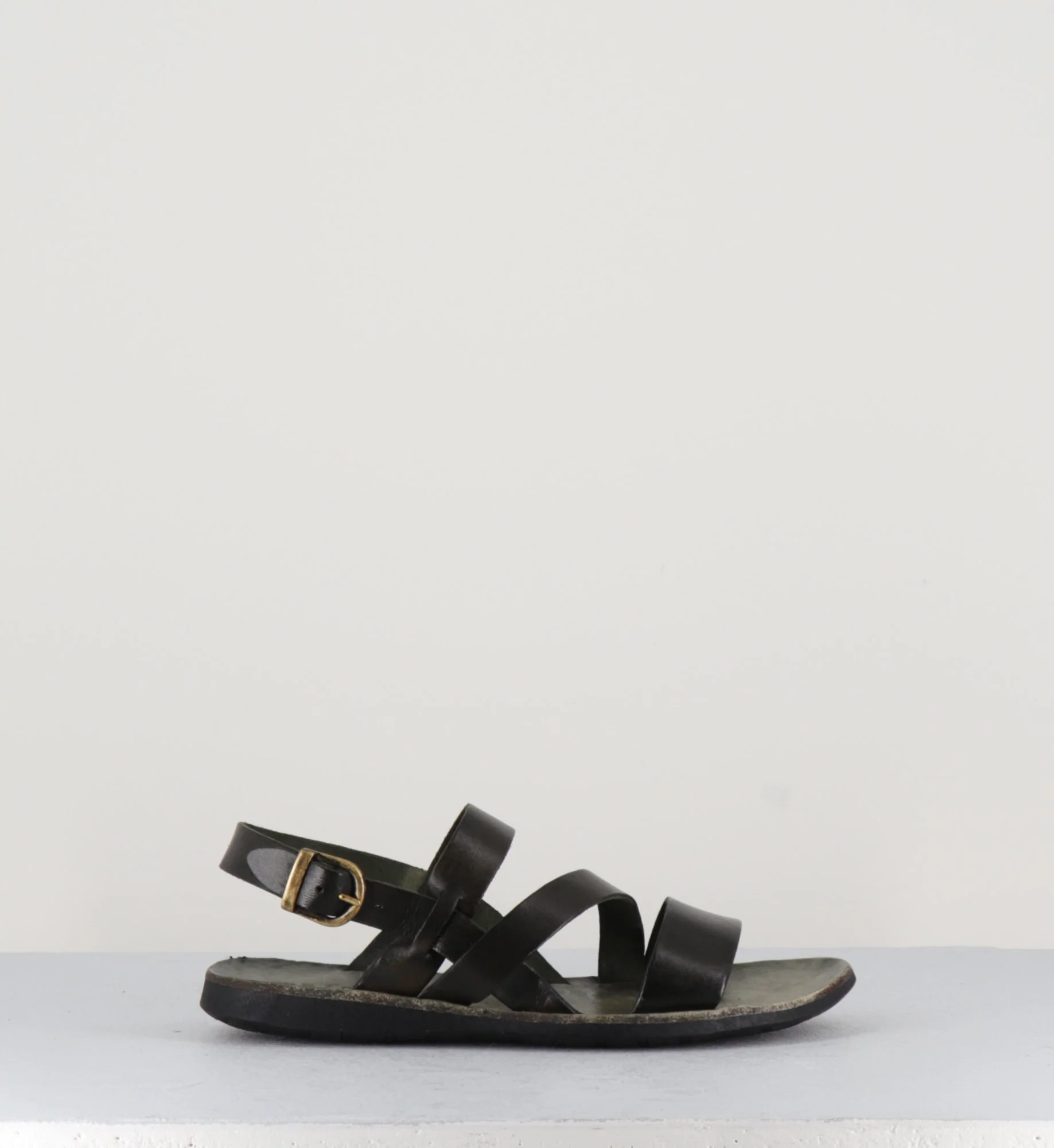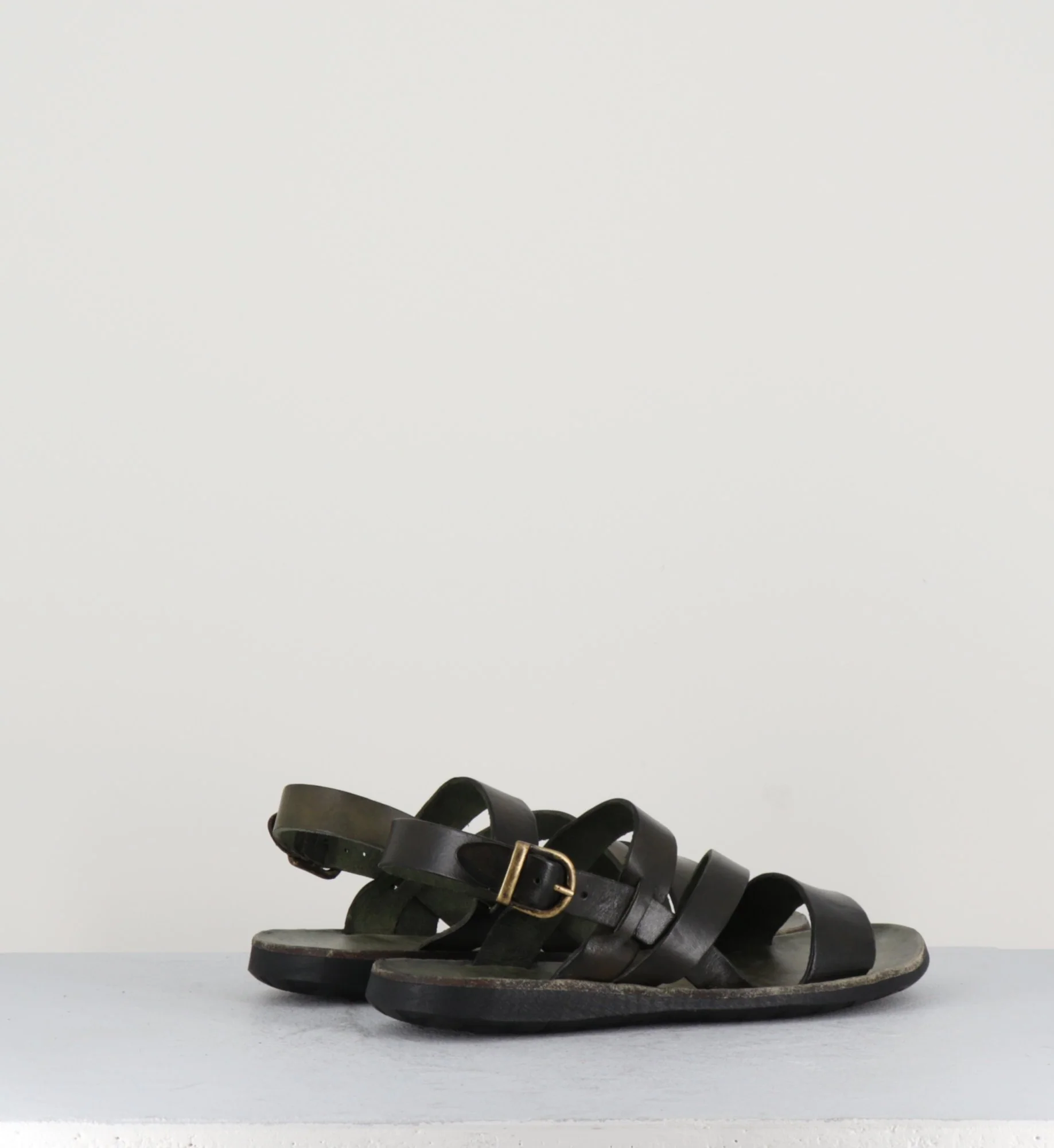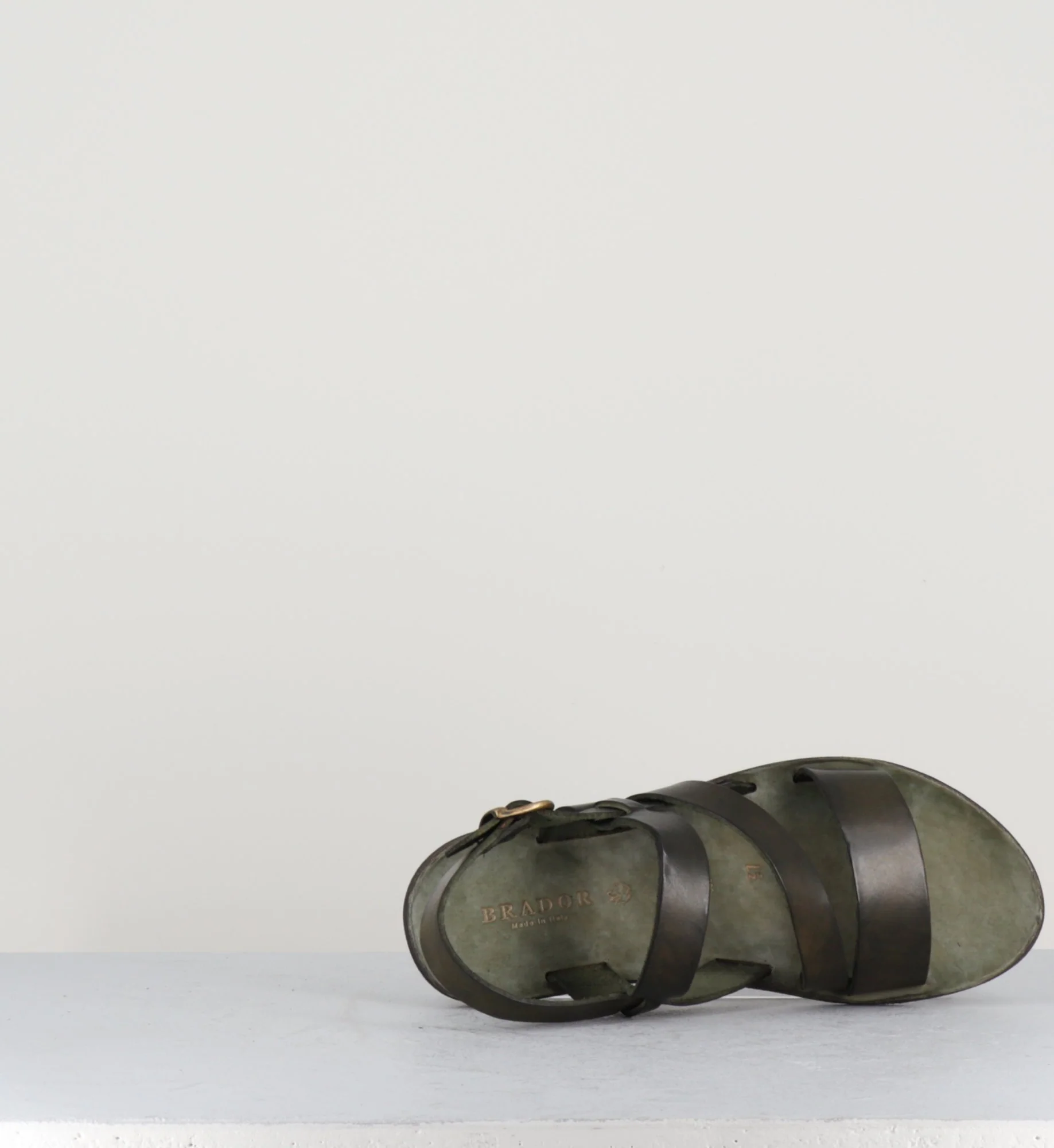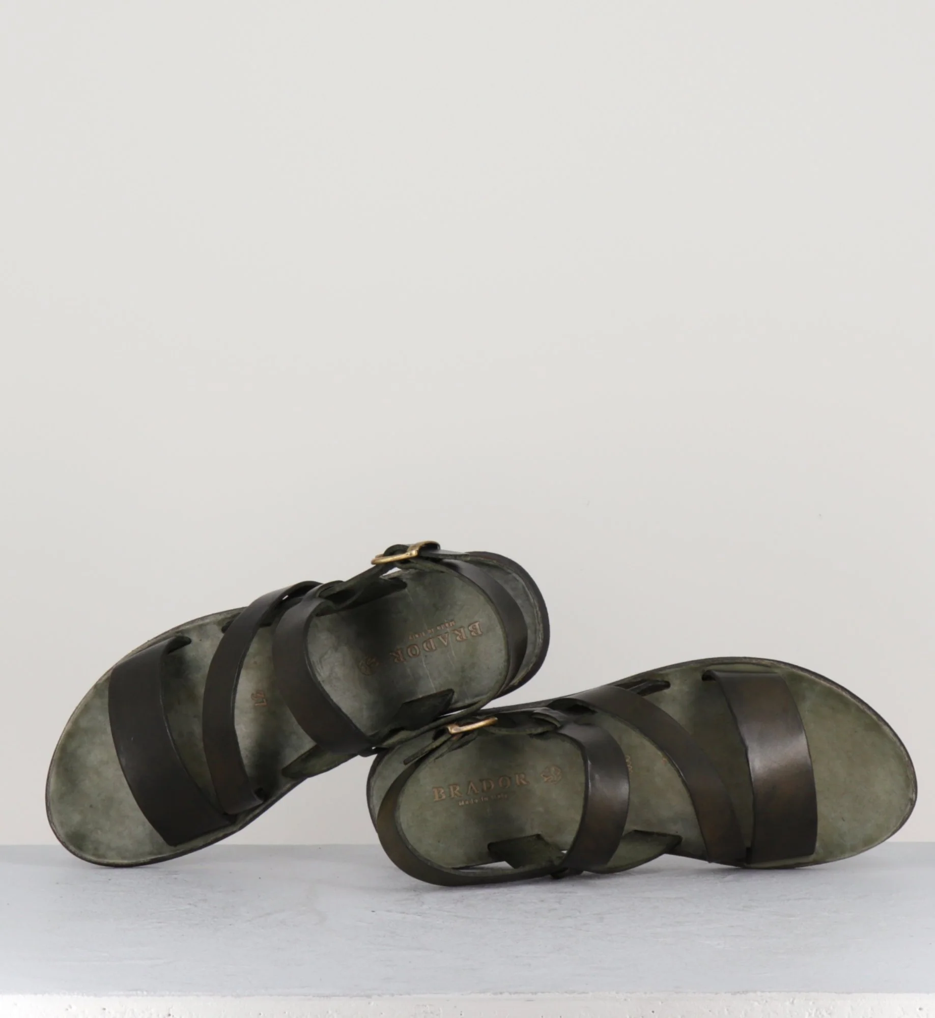 Sandales plates en cuir lavé vert khaki et semelles en cuir et caoutchouc des designers Italien Brador Shoes.