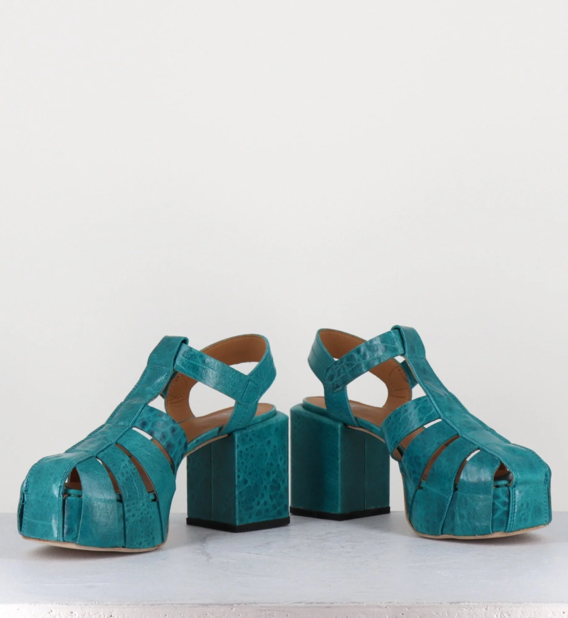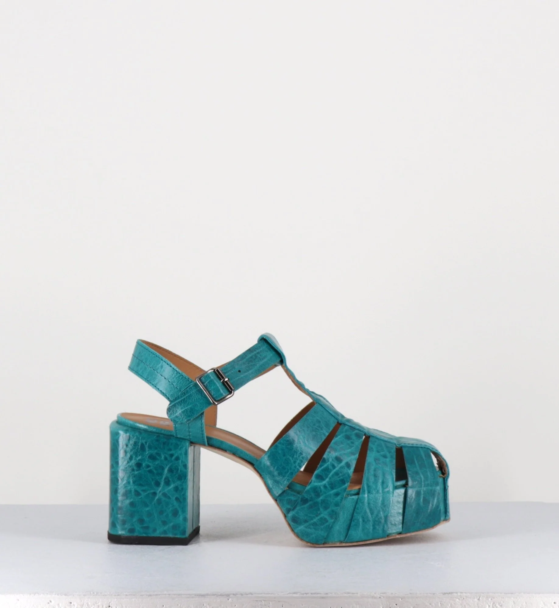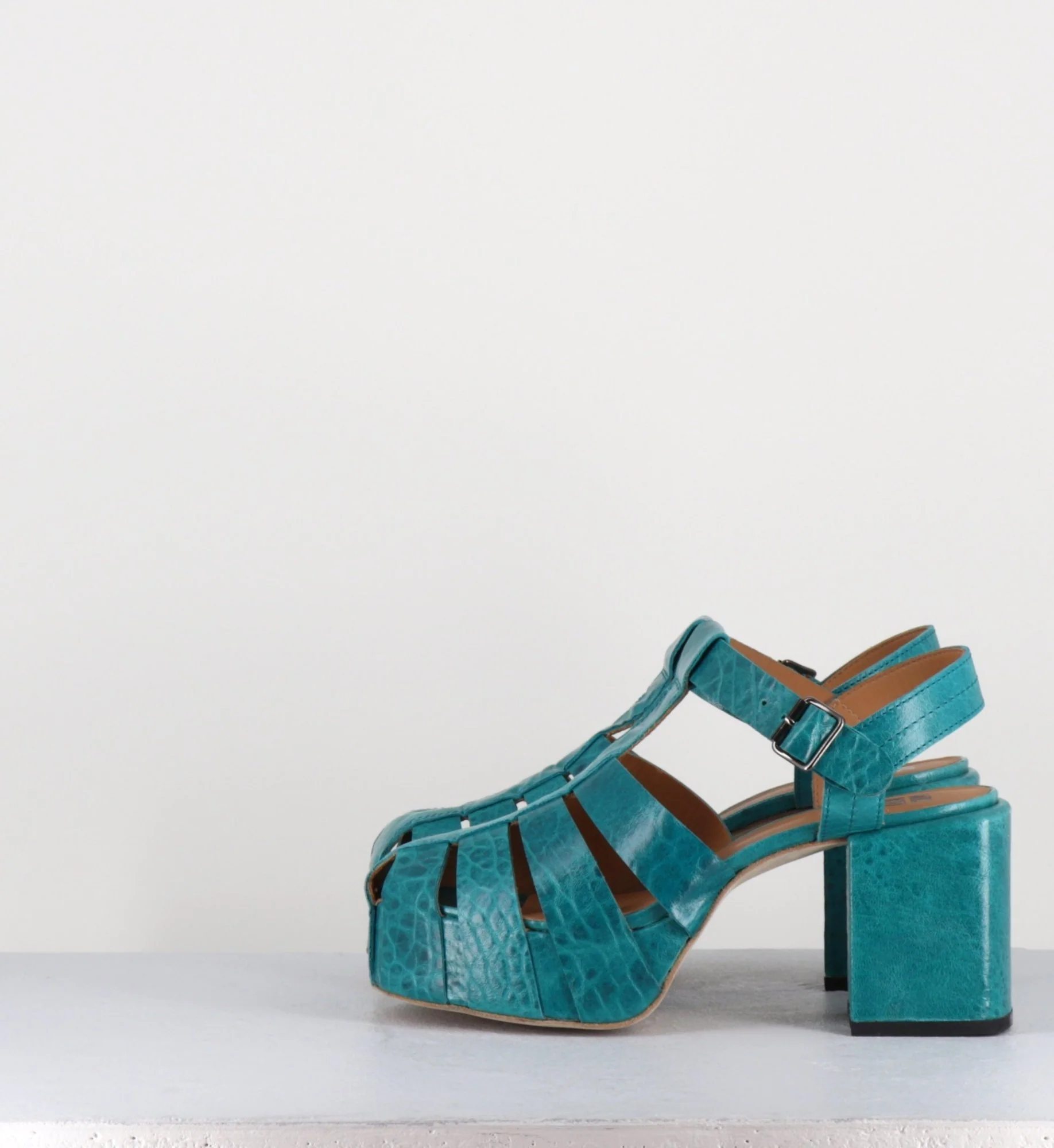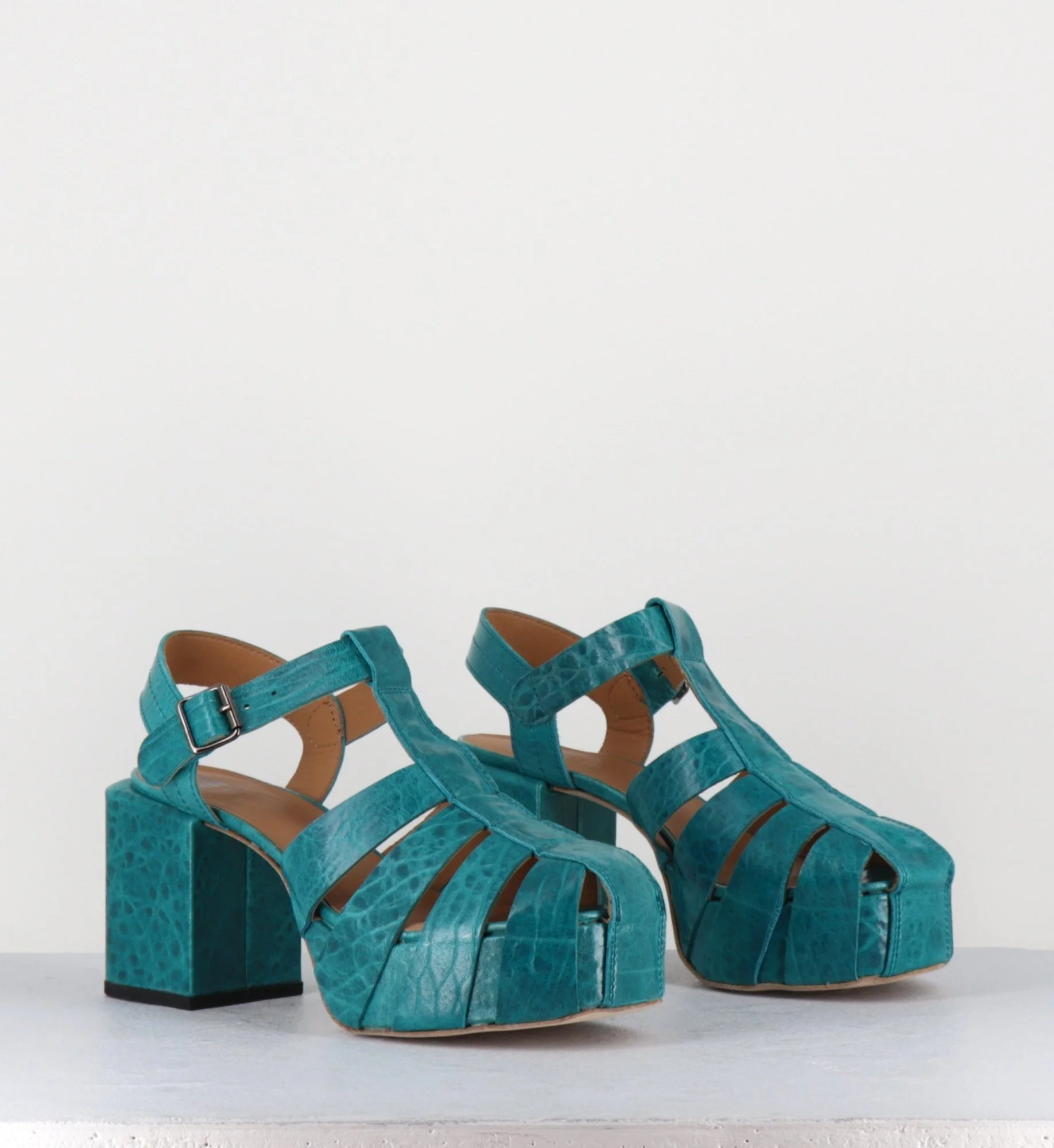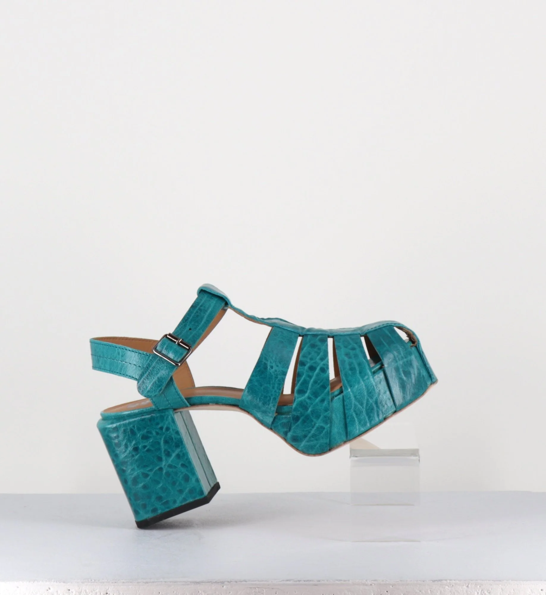 Chaussures – design méduse en cuir gaufré bleu, ligne pure inspirée des années 70, montées sur un talon bloc rectangulaire & une plateforme structurée. D’un grand confort Fabrication Artisanale Italienne – Ateliers Moma Chausse grand