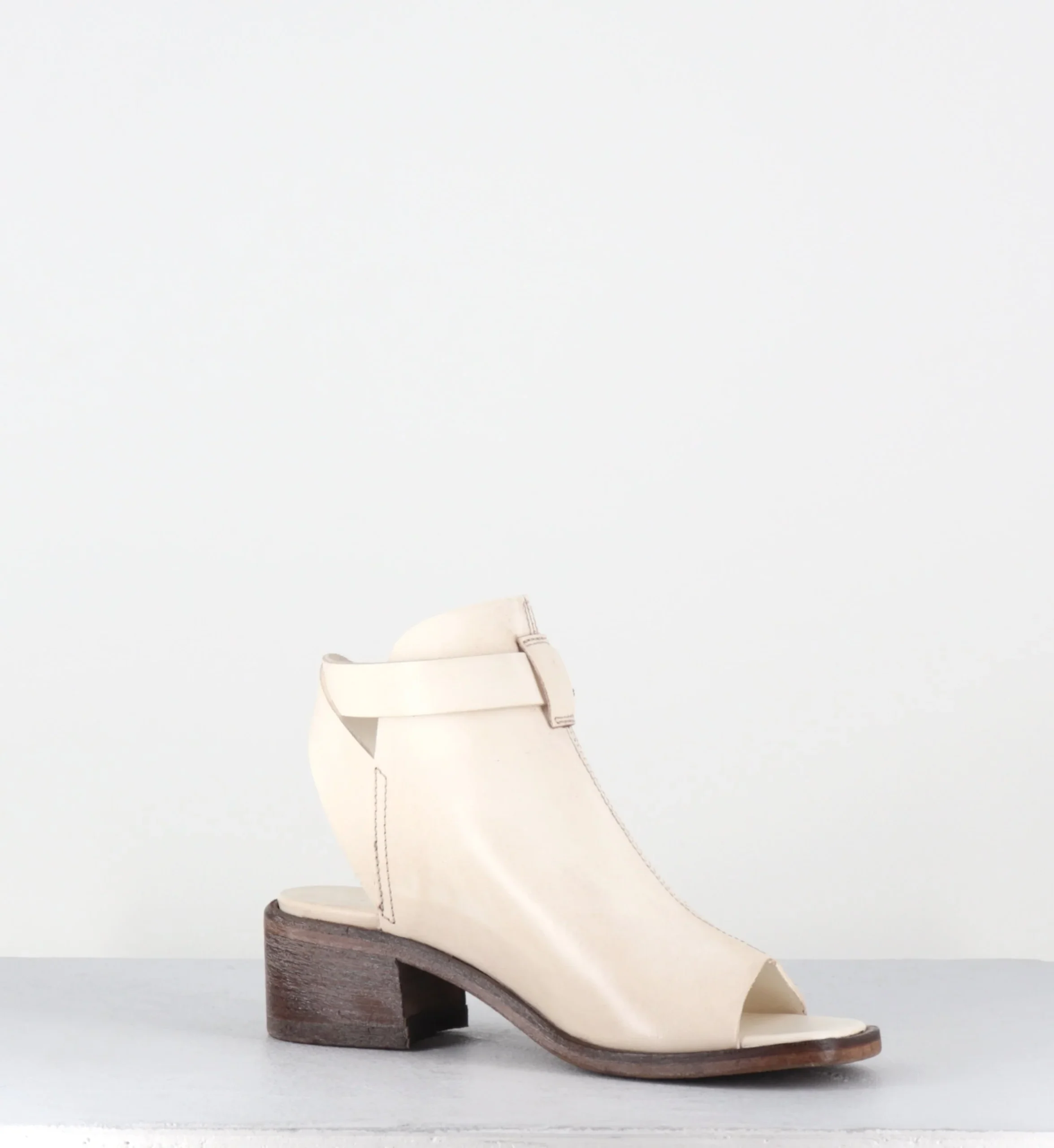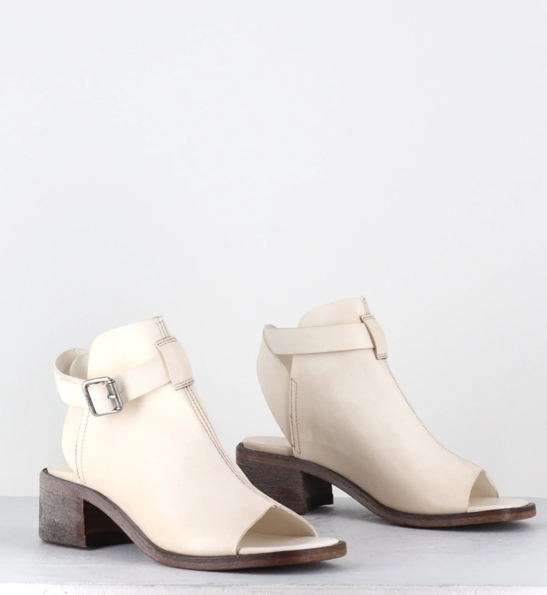 Sandales ‘open-boots’ en cuir blanc, découpe minimaliste à bords francs, bride cheville réglable, bout carré, montées sur un talon bloc confortable