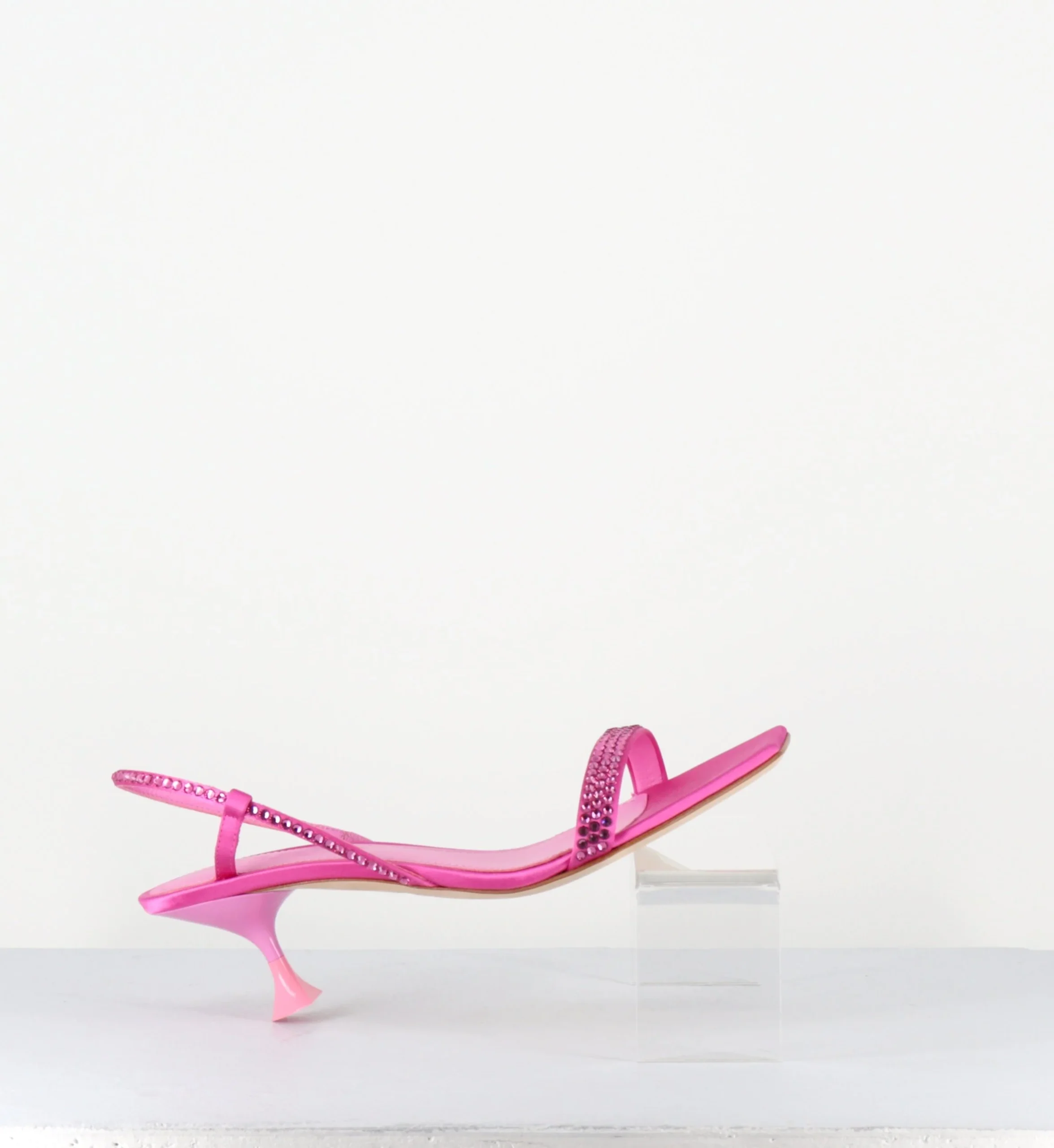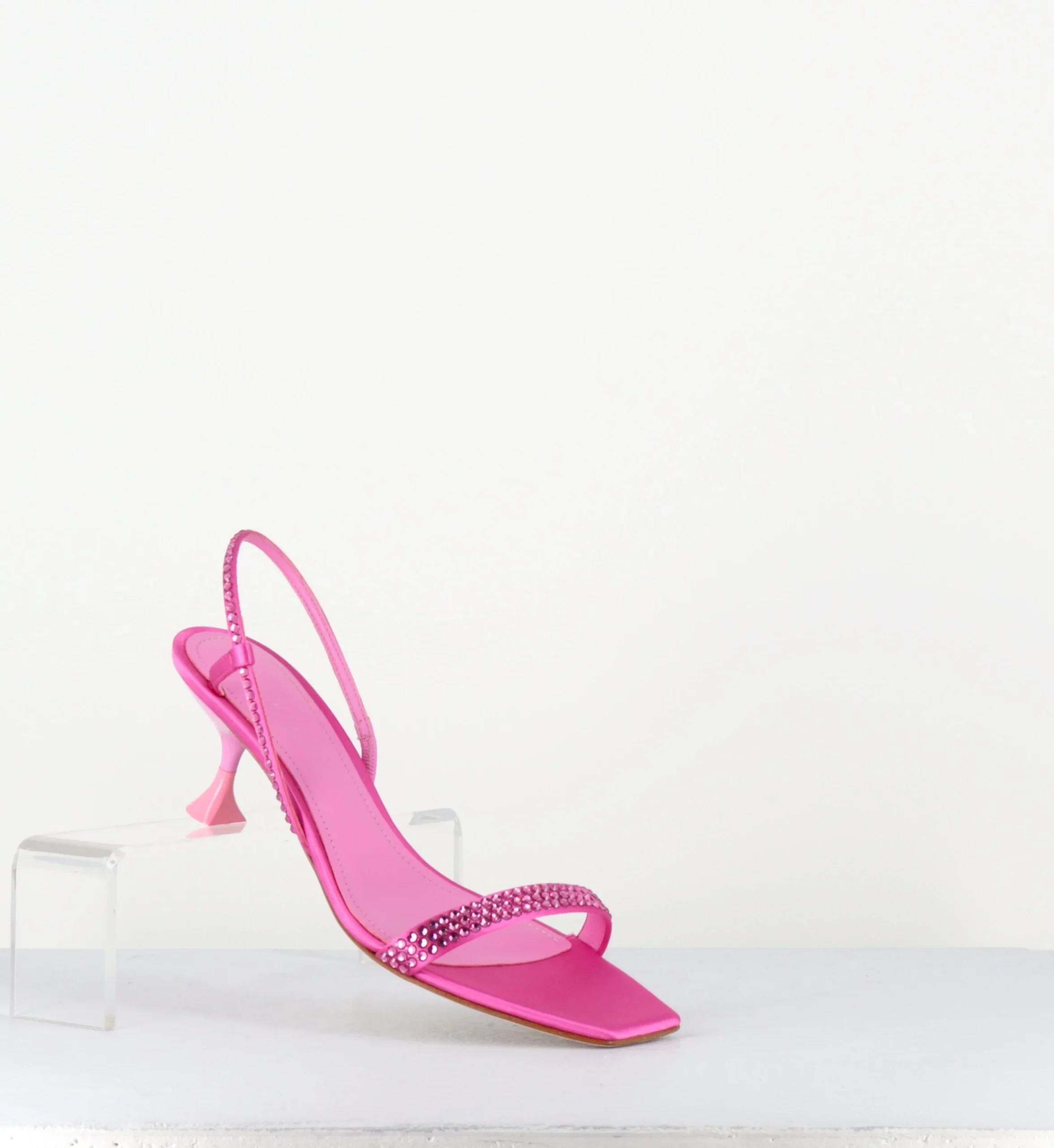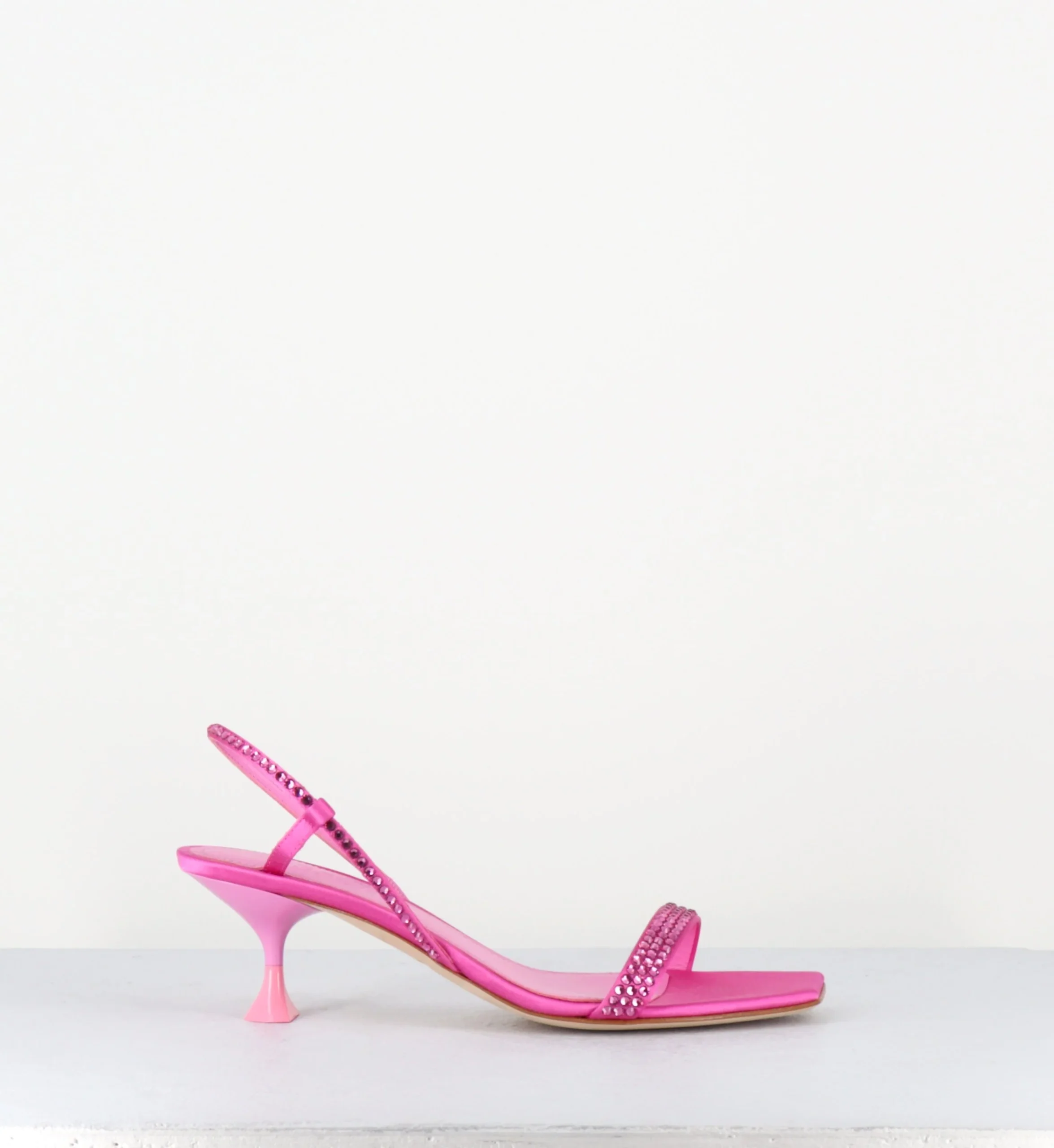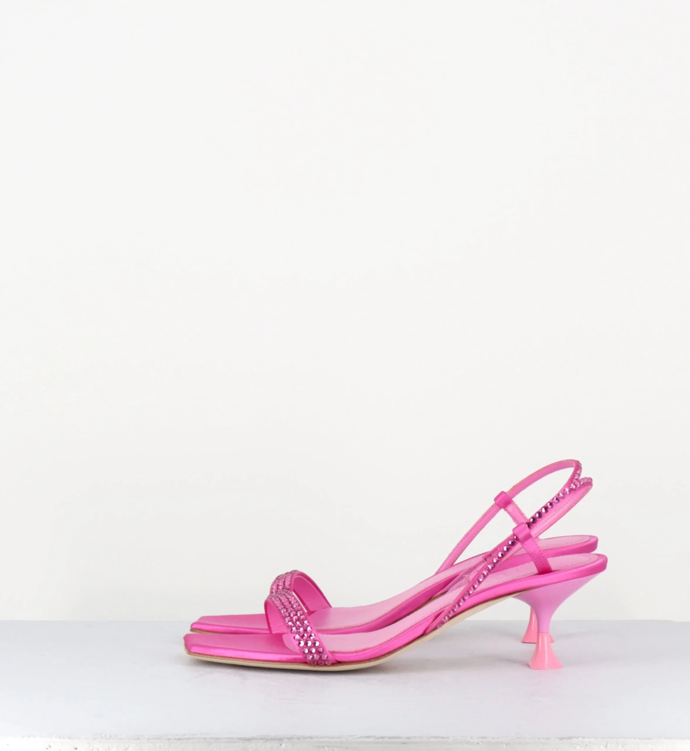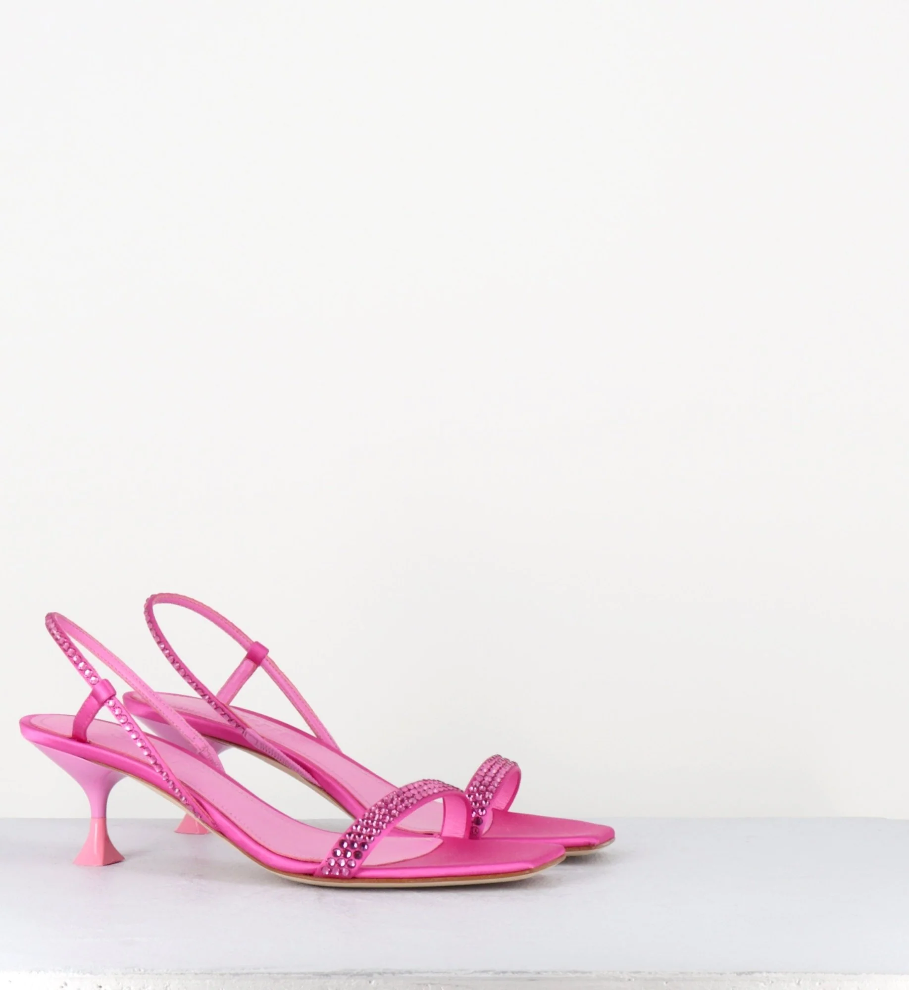 Sandales en satin rose fuchsia, élégante bride arrière slingback, ornées de petits strass ton sur ton, bout carré doux, montées sur un petit talon stylisé légèrement incurvé avec détail finition PVC crème