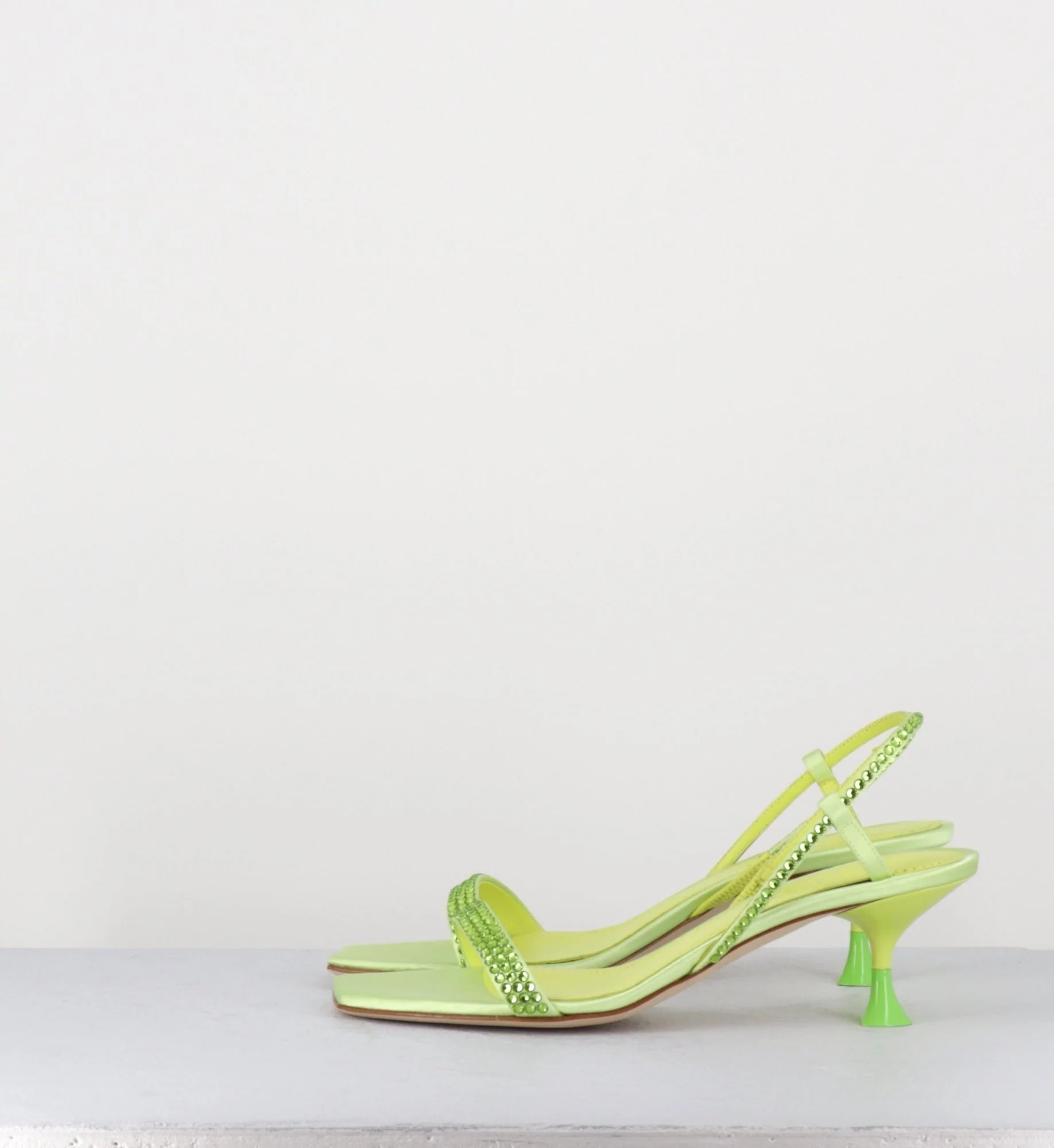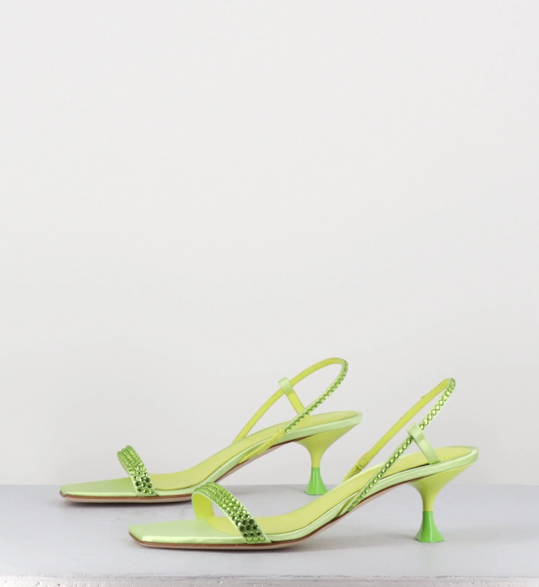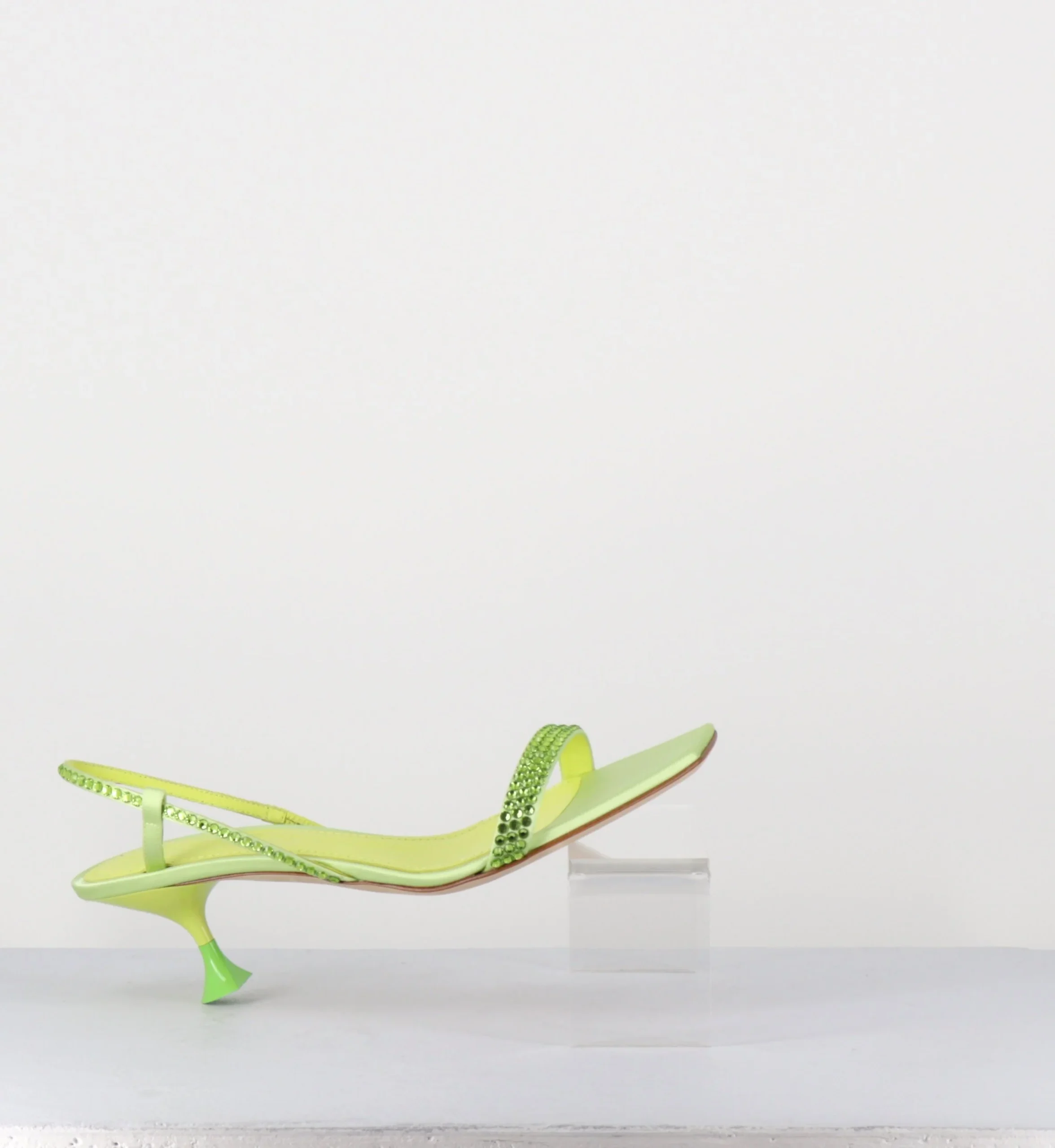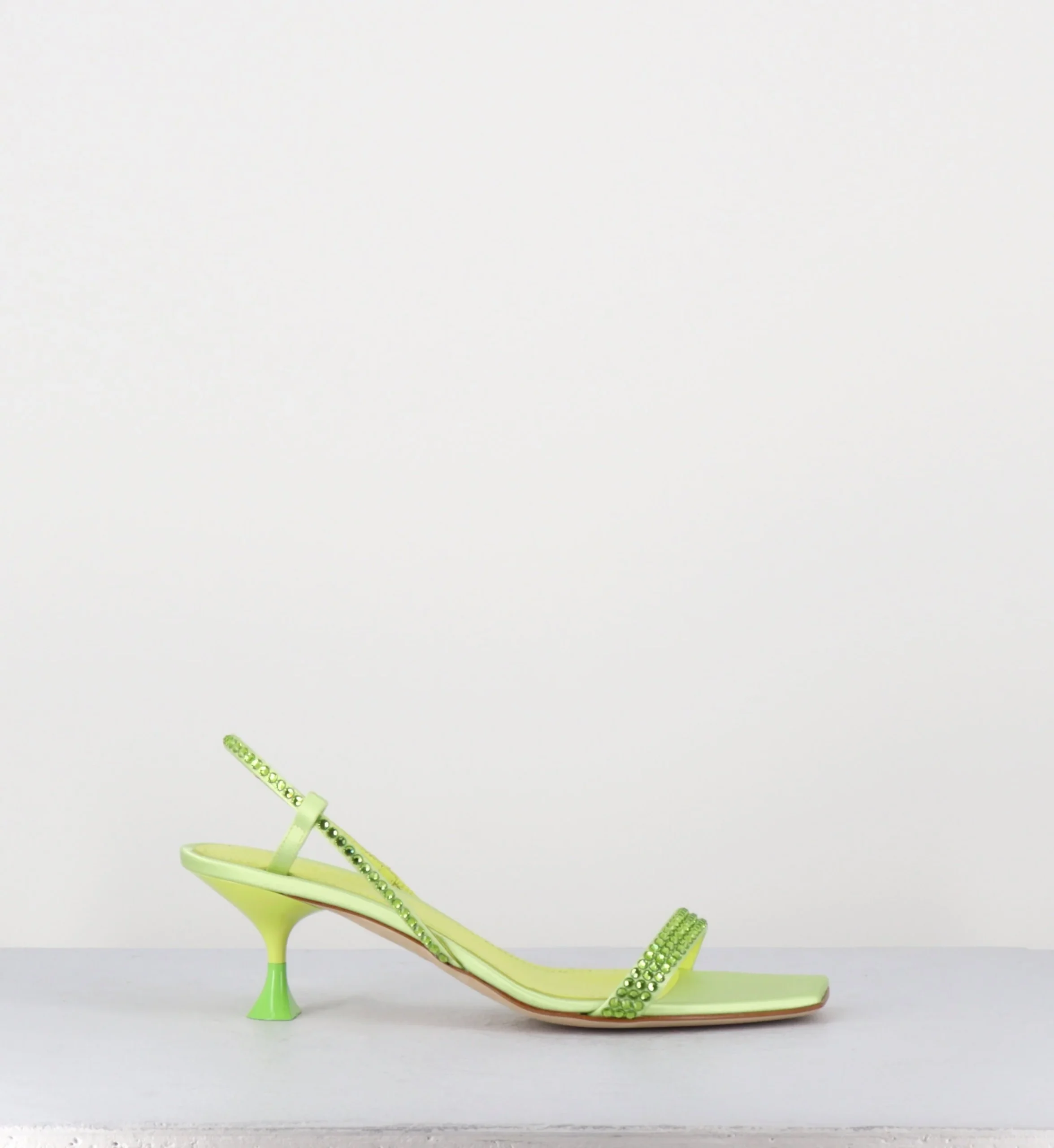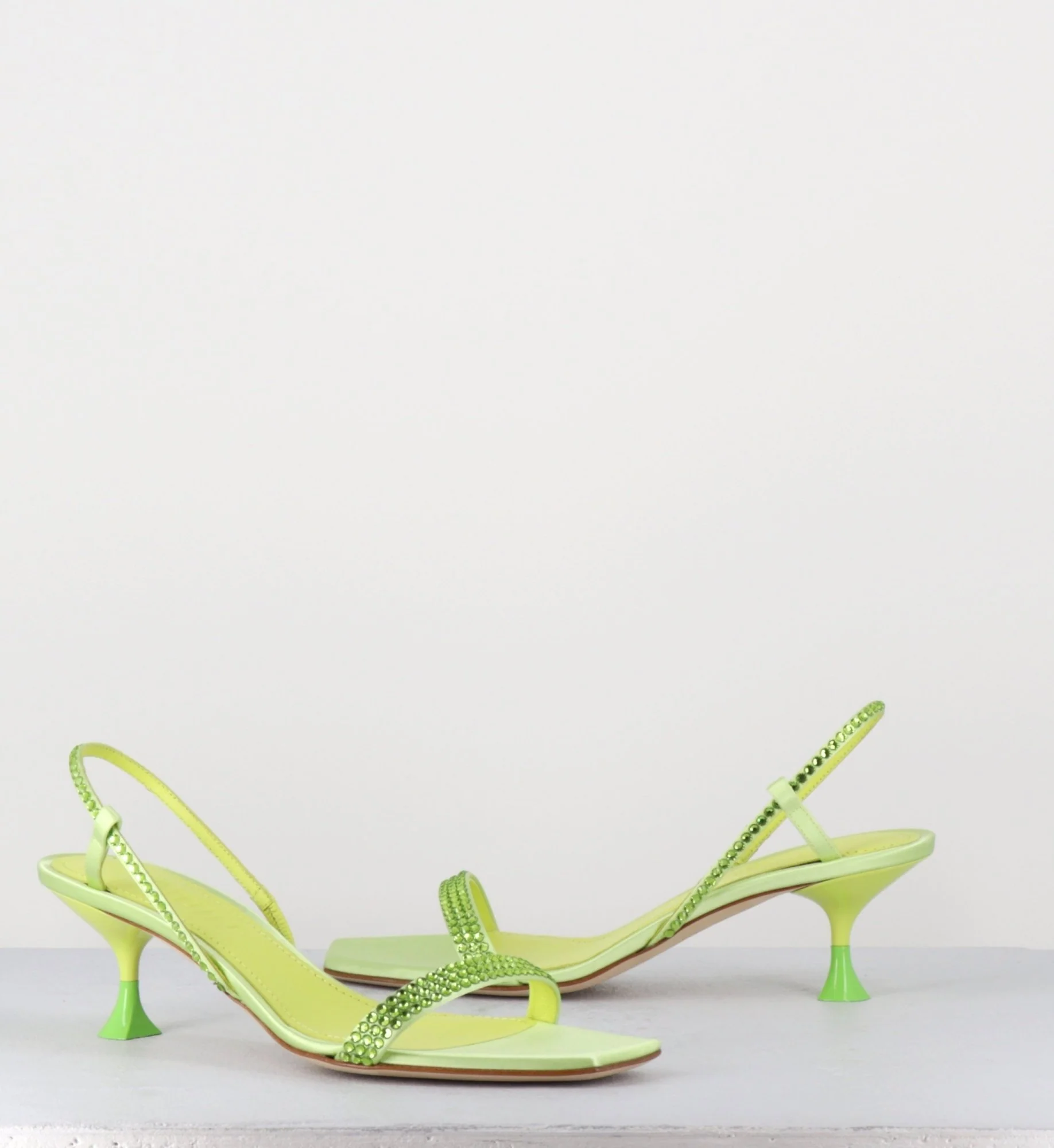 Sandales en satin vert clair, élégante bride arrière slingback, ornées de petits strass ton sur ton, bout carré doux, montées sur un petit talon stylisé légèrement incurvé avec détail finition PVC vert pomme Fabrication Artisanale Italienne – Ateliers 3JUIN Chausse normalement
