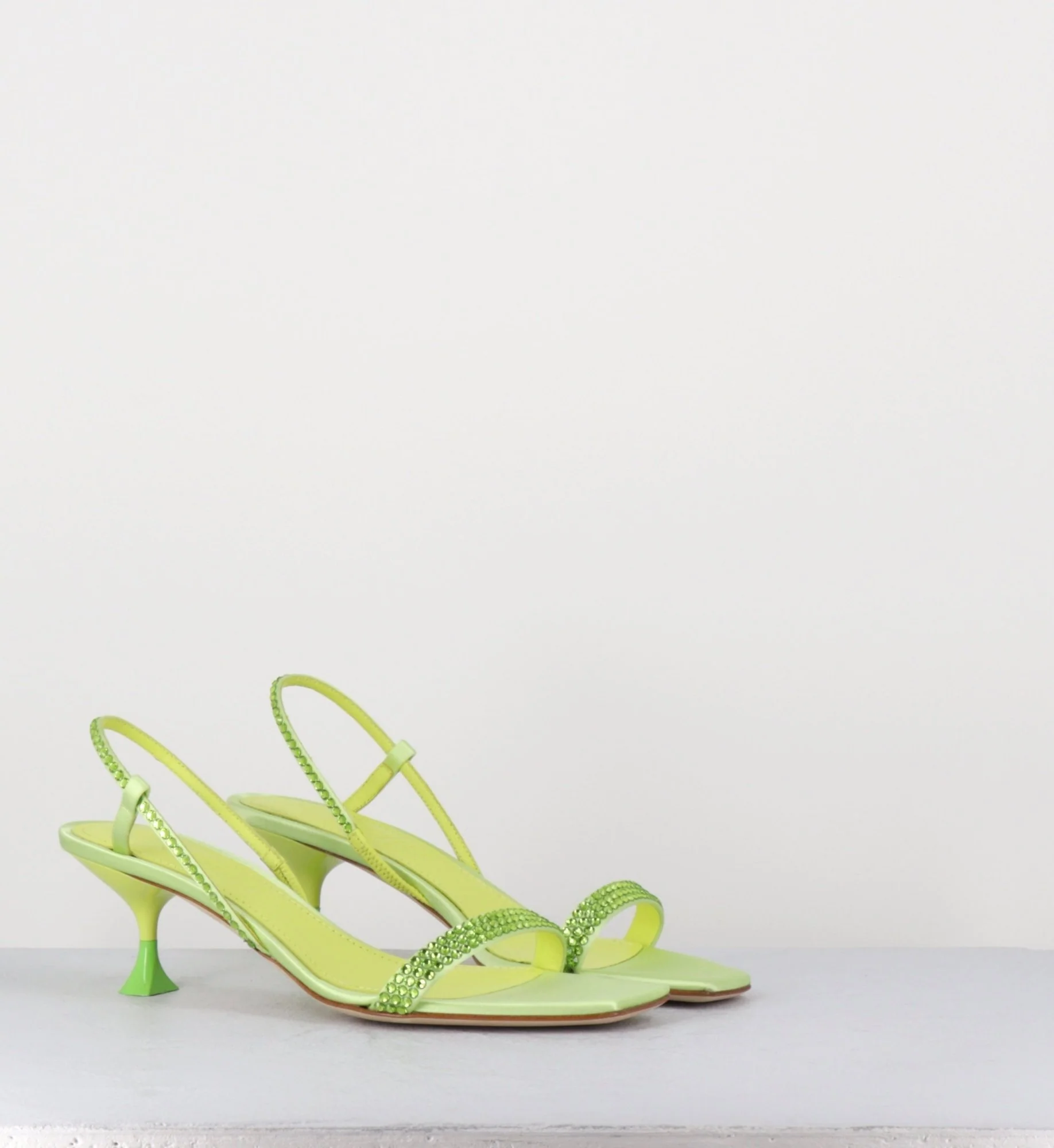 Sandales en satin vert clair, élégante bride arrière slingback, ornées de petits strass ton sur ton, bout carré doux, montées sur un petit talon stylisé légèrement incurvé avec détail finition PVC vert pomme