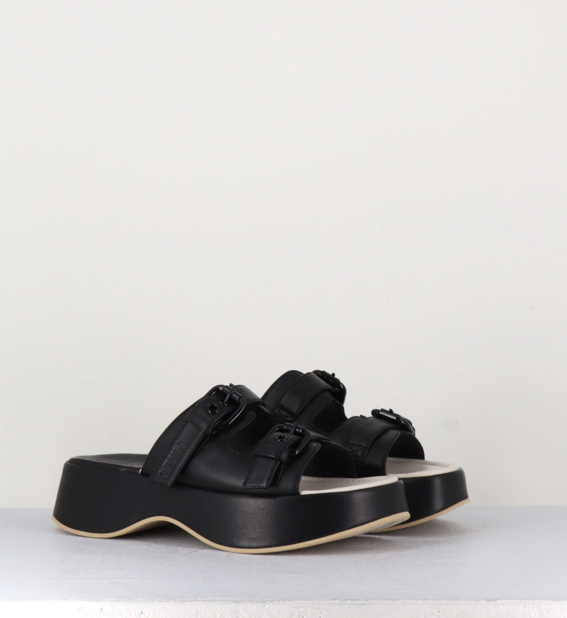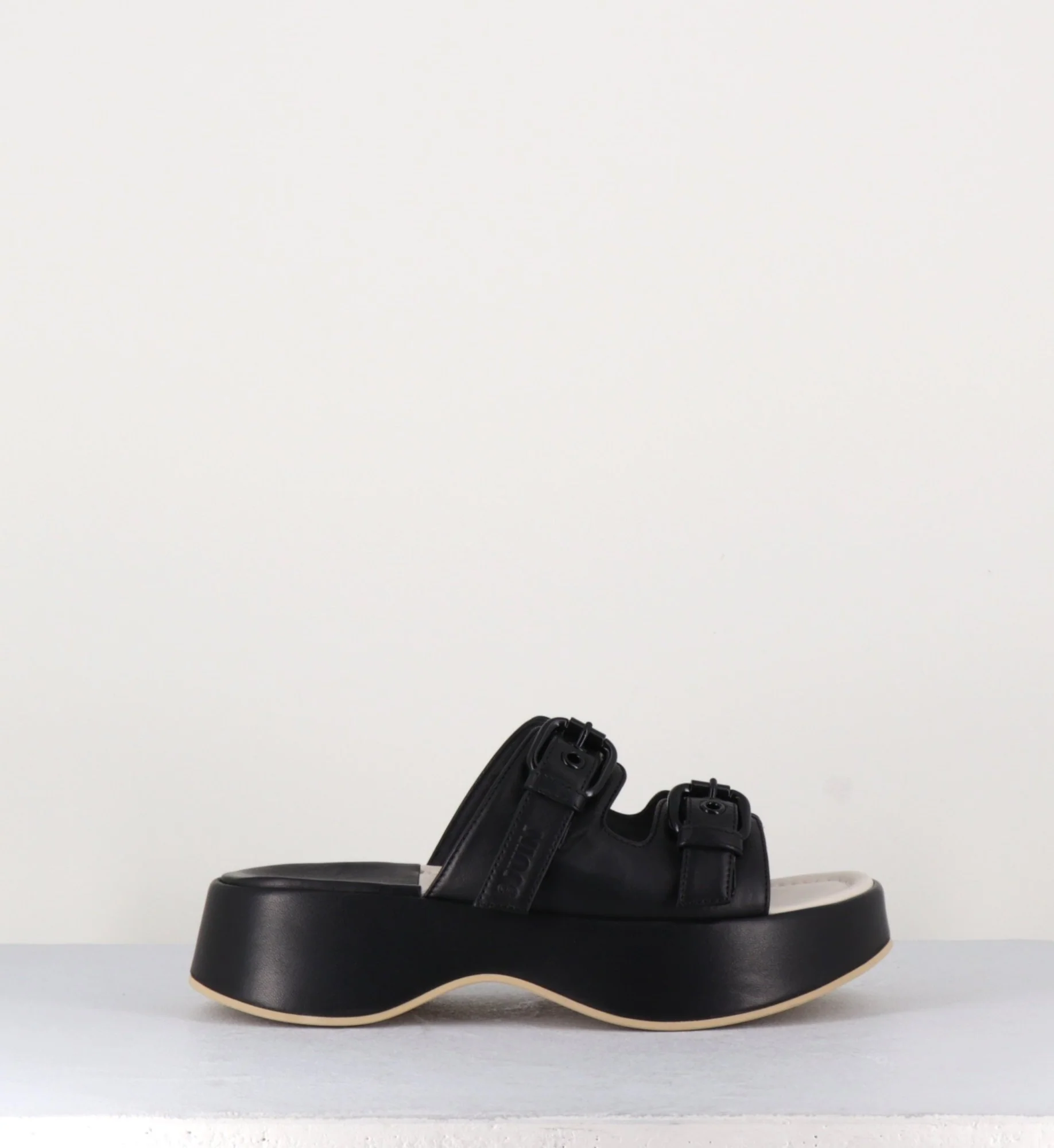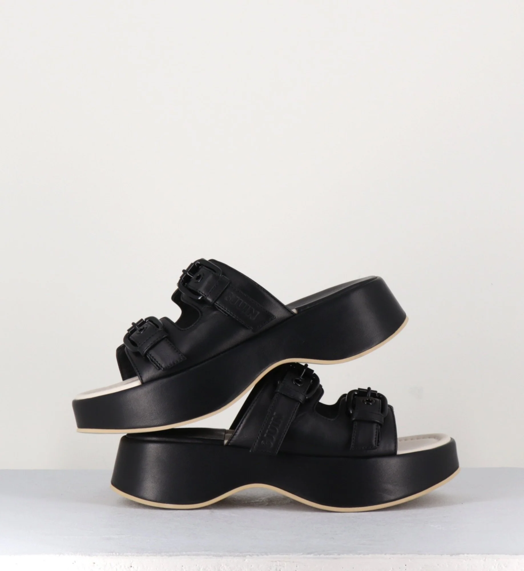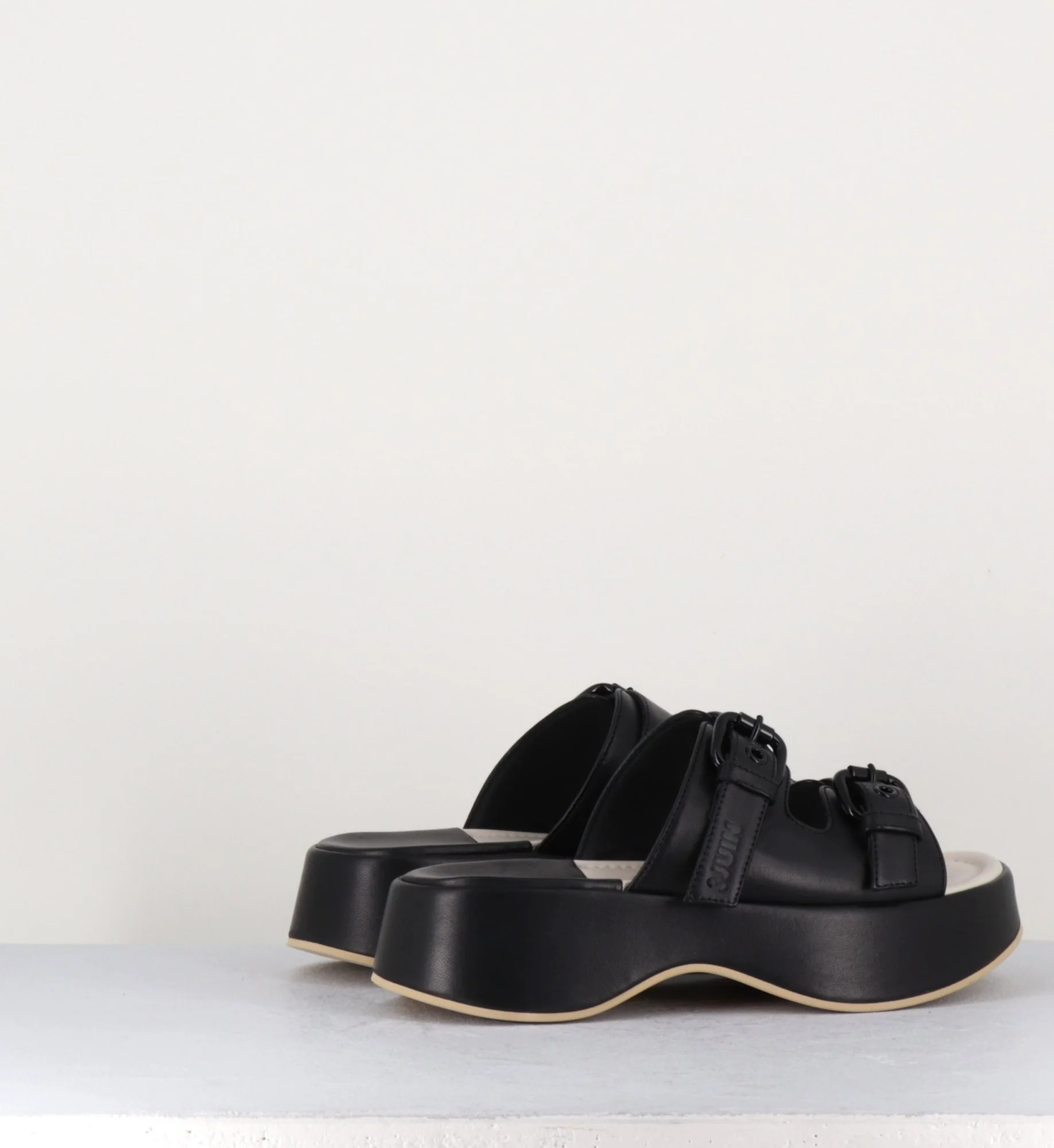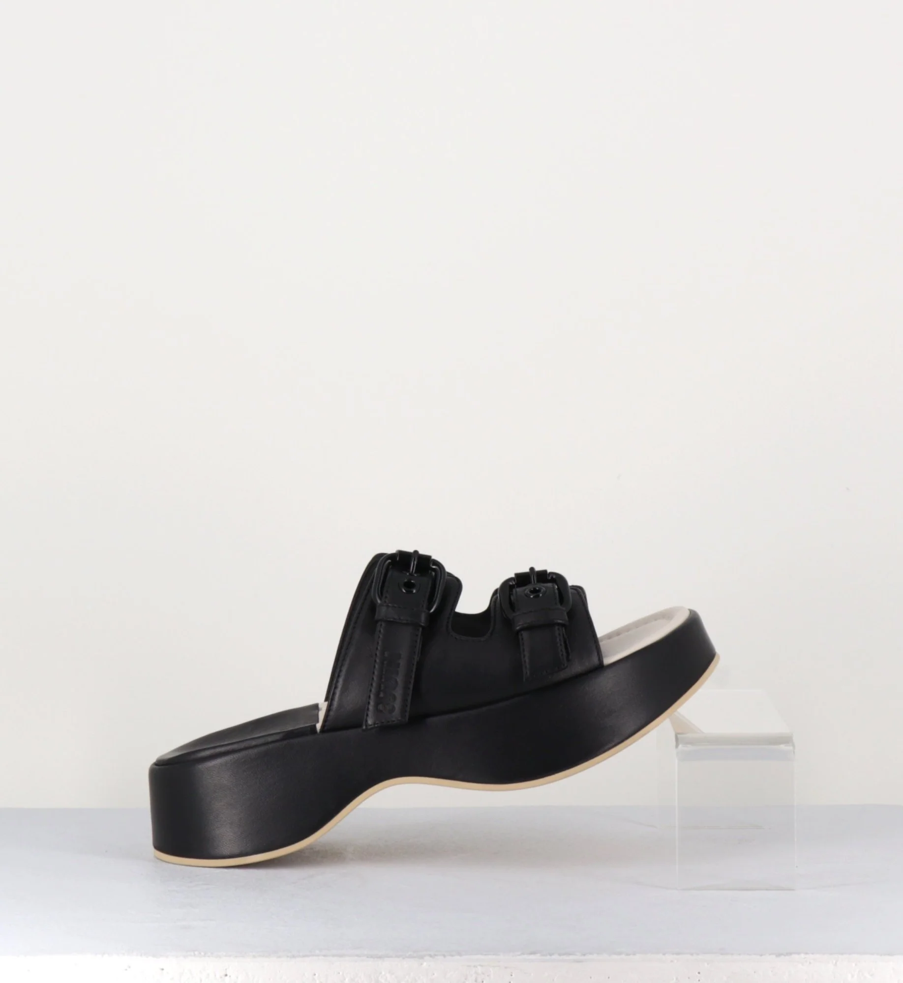 Sandales mules en cuir noir à boucles, montées sur une semelle plateforme incurvée. Fabrication Artisanale Italienne – Ateliers 3Juin Chausse légèrement grand.