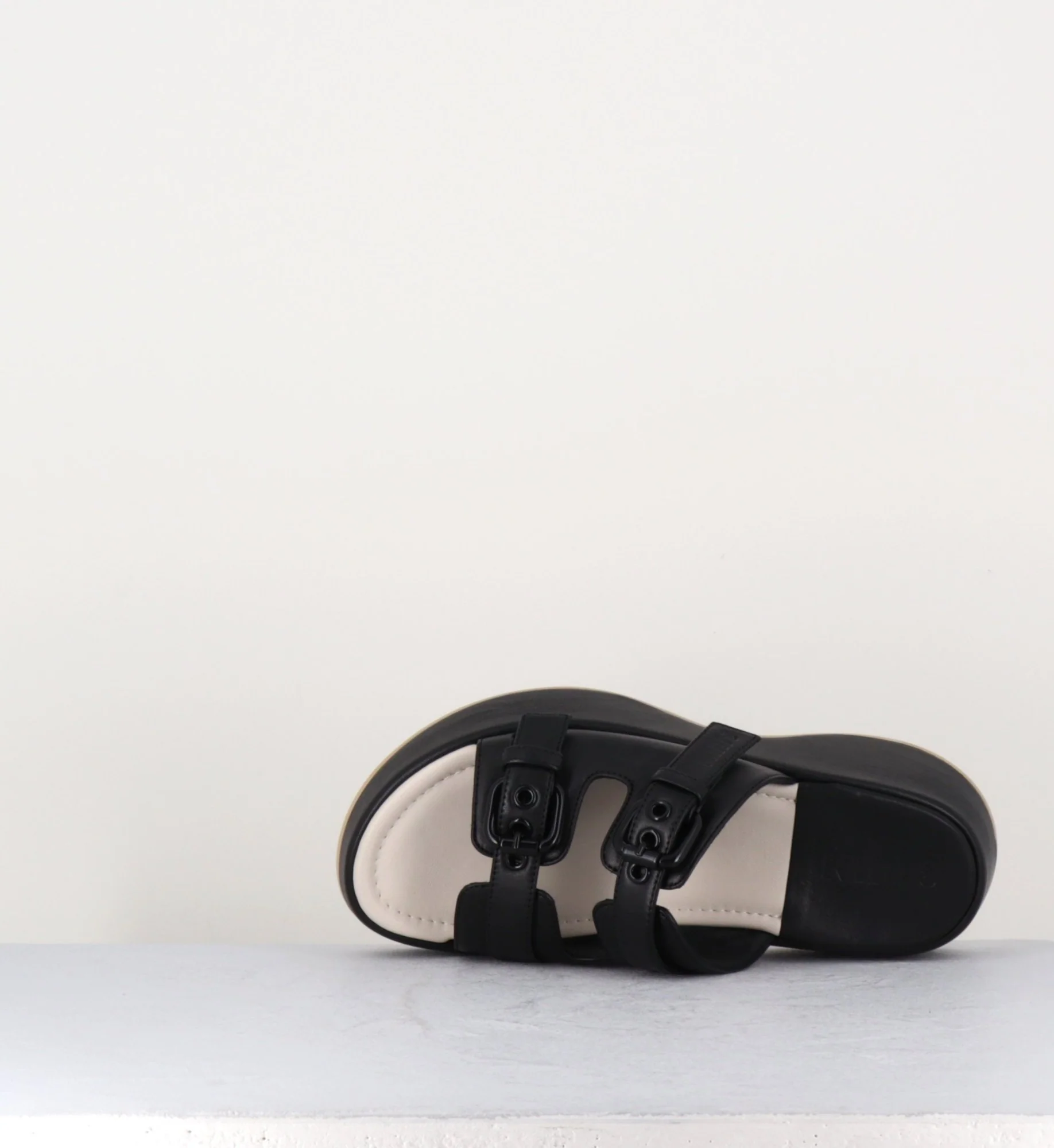 Sandales mules en cuir noir à boucles, montées sur une semelle plateforme incurvée.