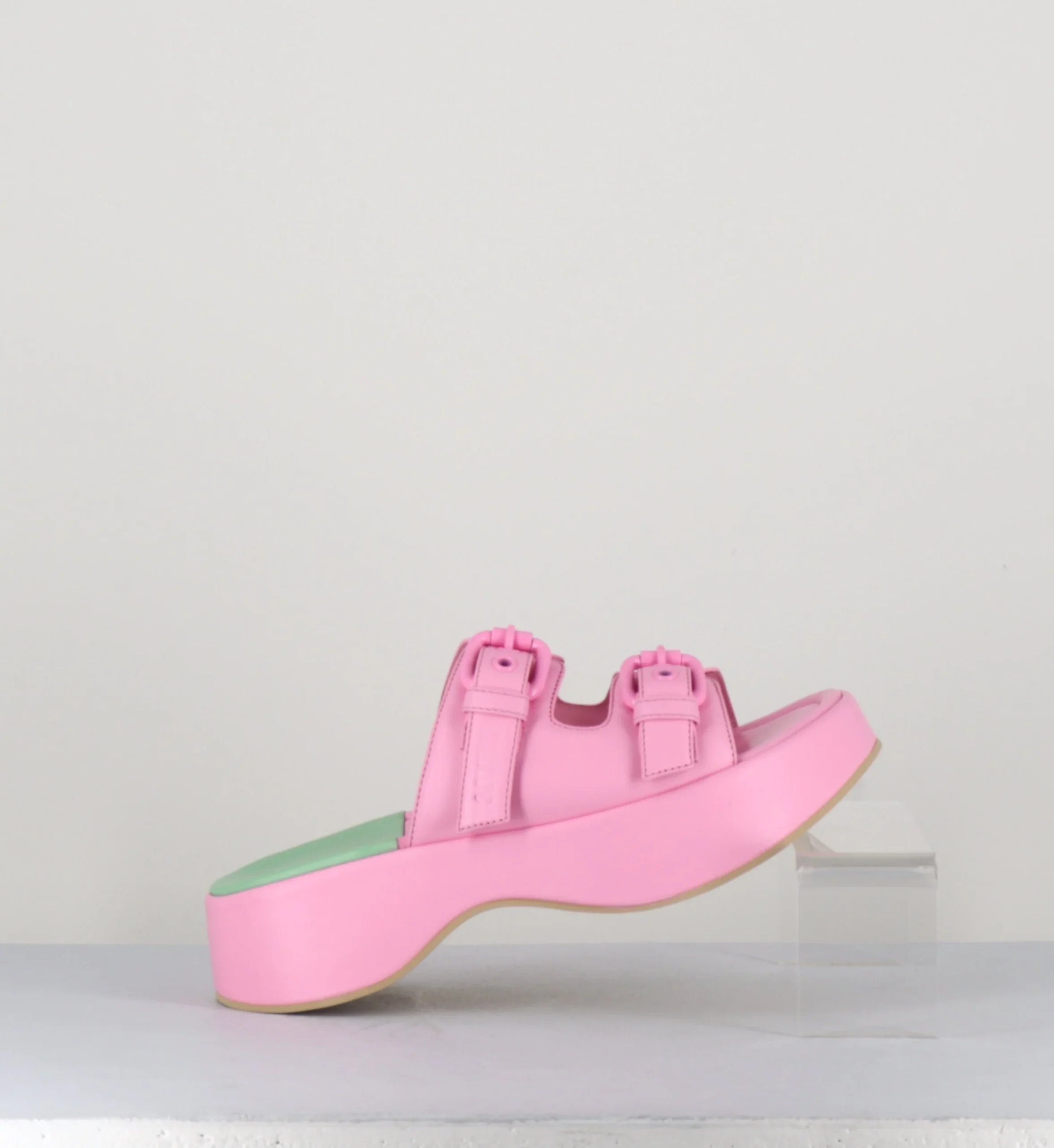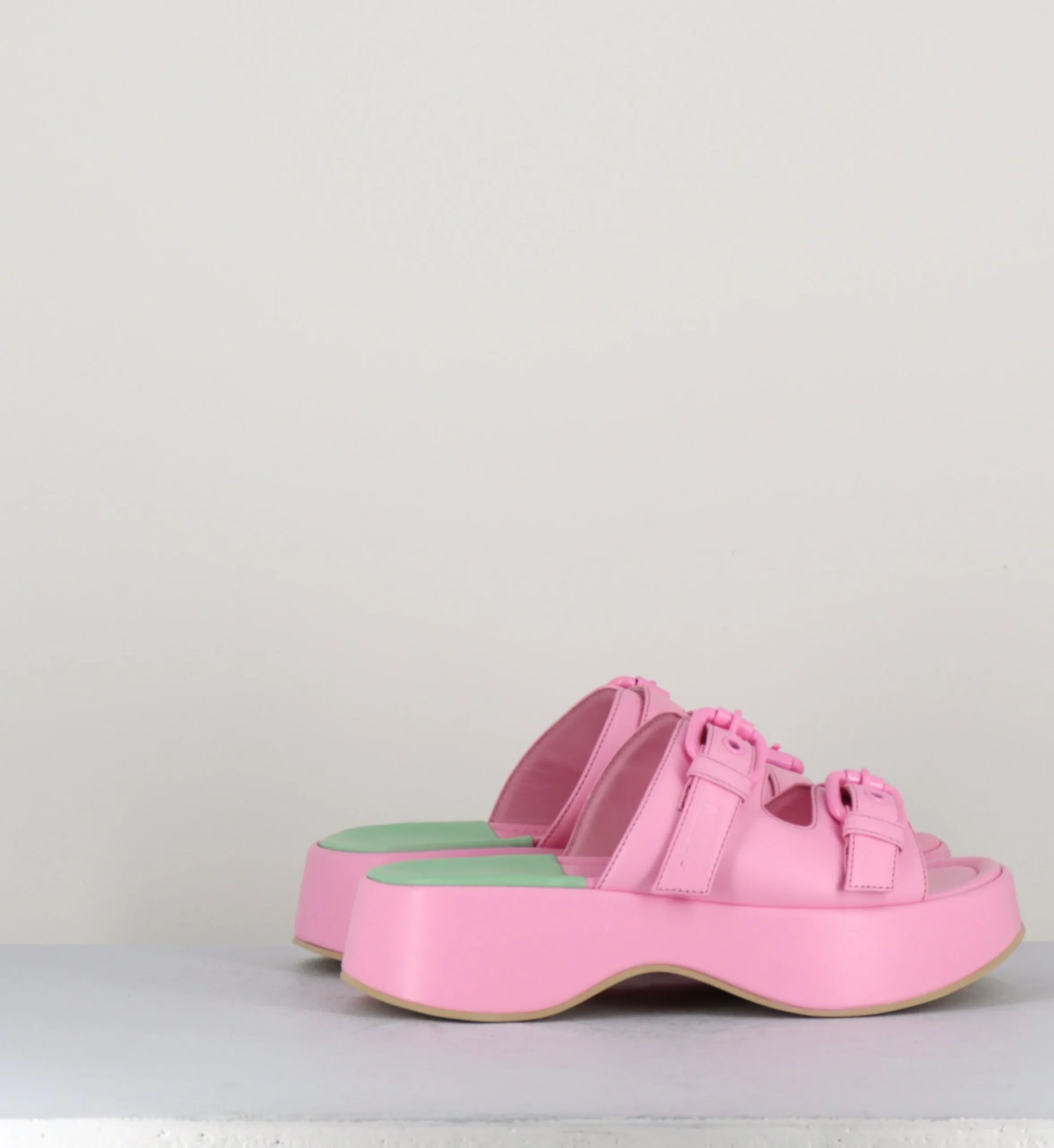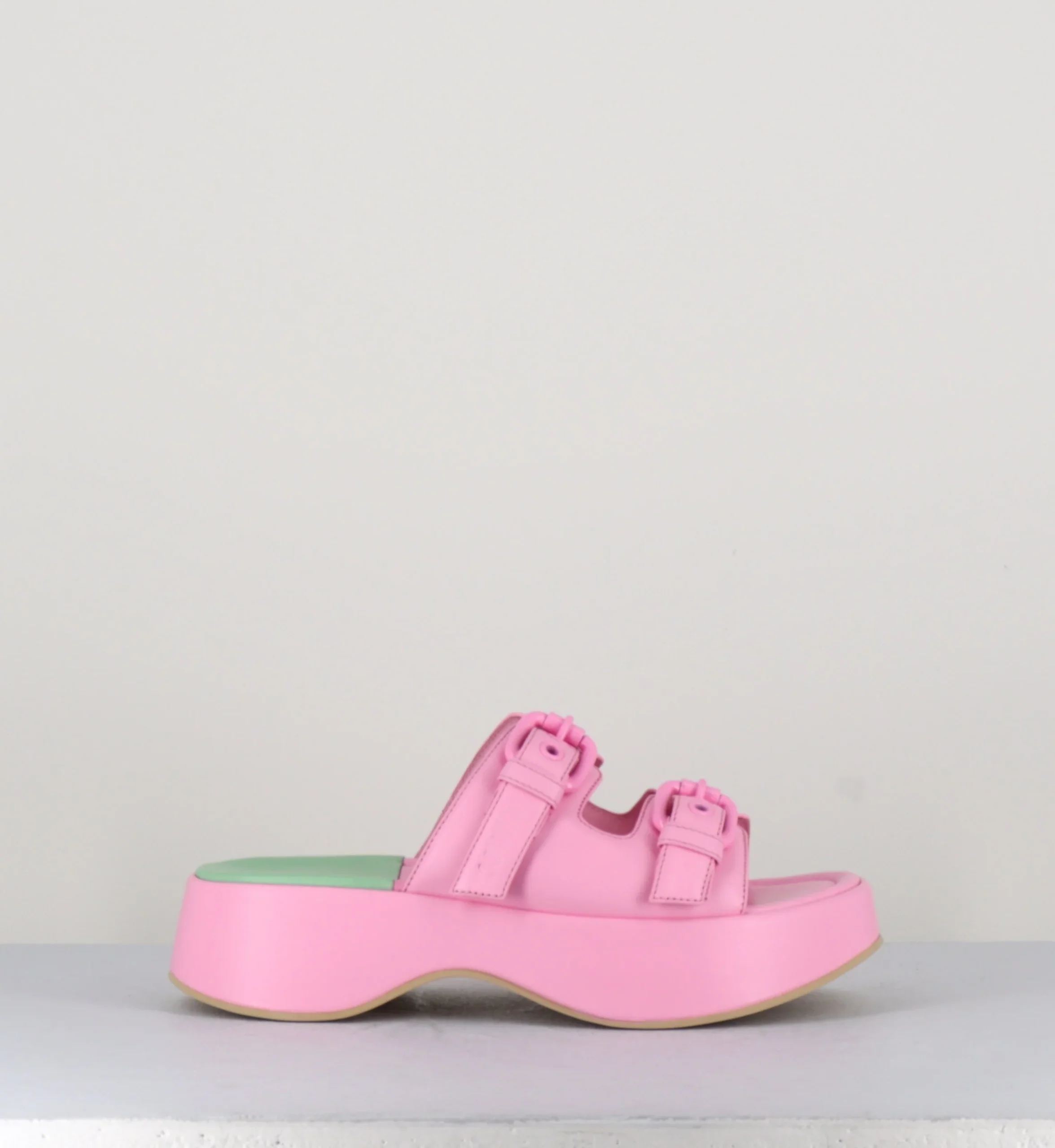 Sandales mules en cuir rose à boucles, montées sur une semelle plateforme incurvée. Fabrication Artisanale Italienne – Ateliers 3Juin Chausse légèrement grand.