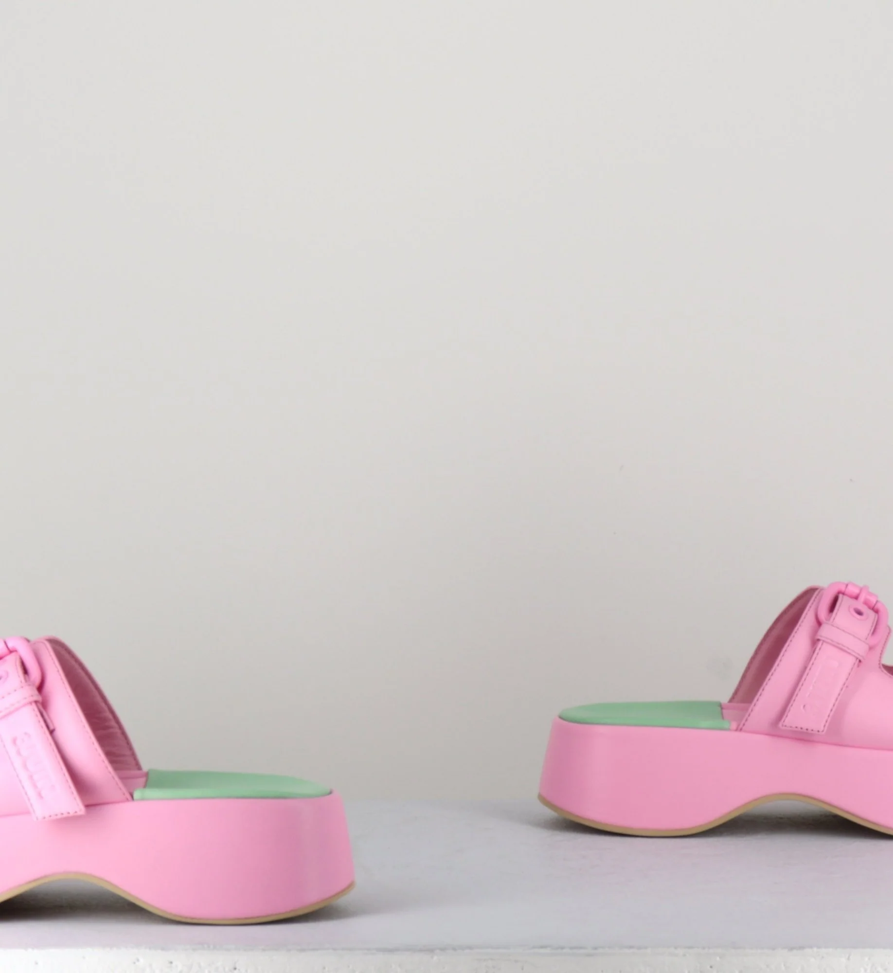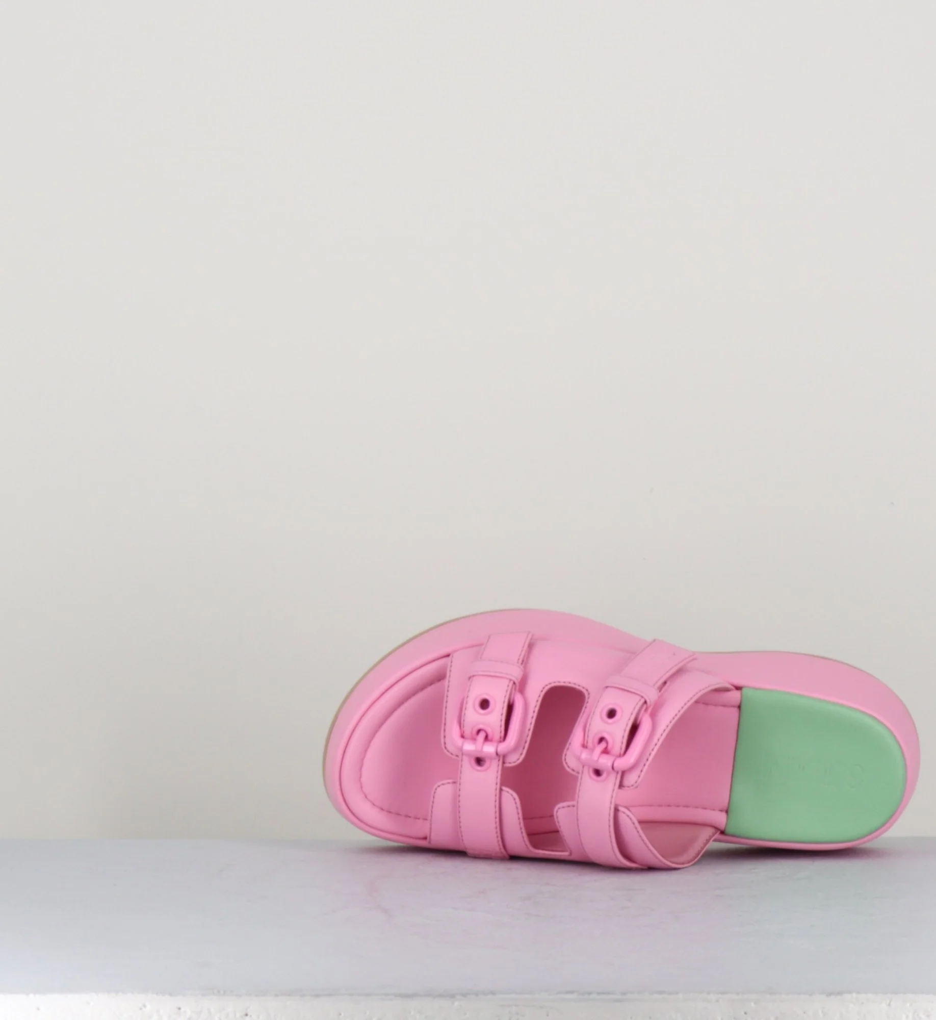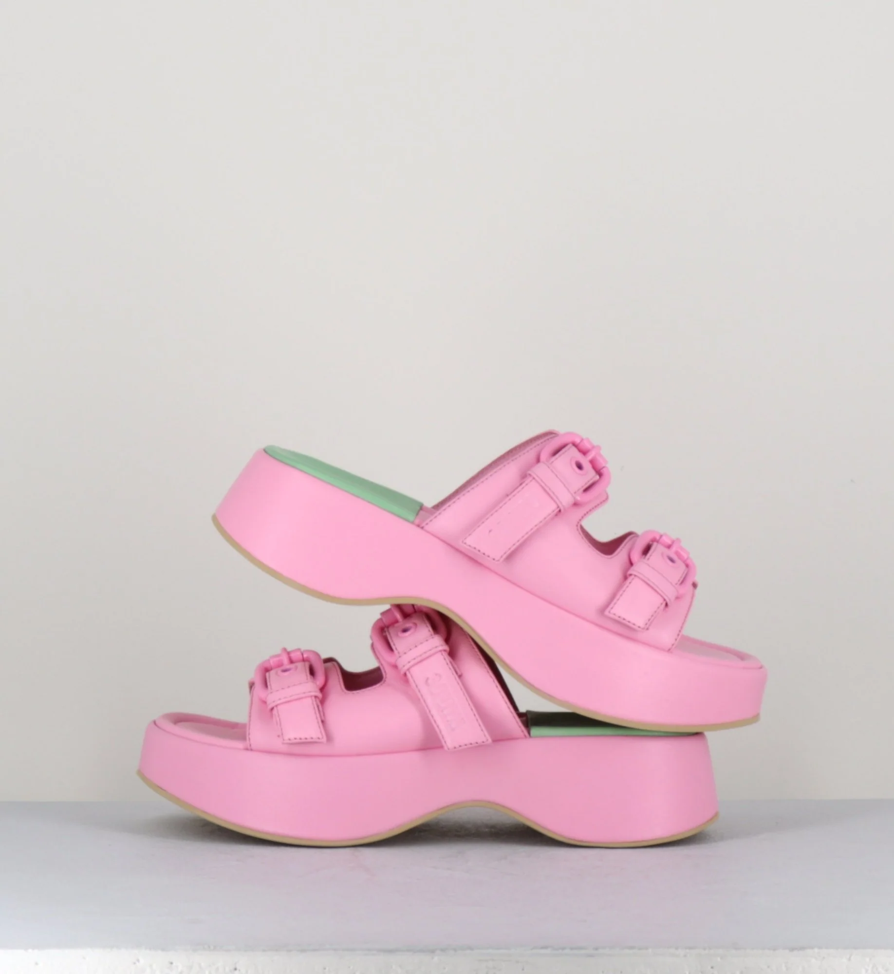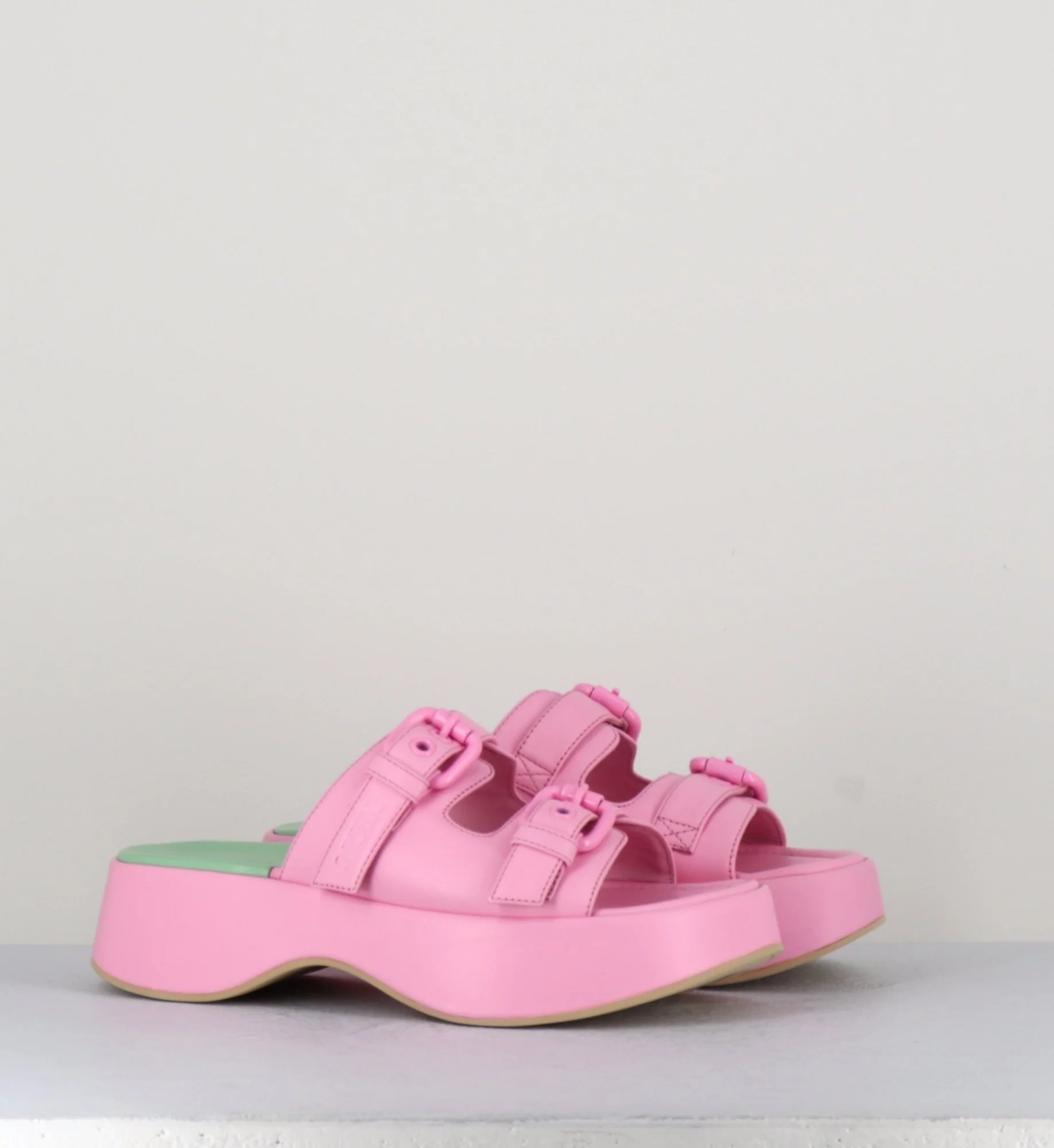 Sandales mules en cuir rose à boucles, montées sur une semelle plateforme incurvée. Fabrication Artisanale Italienne – Ateliers 3Juin Chausse légèrement grand.