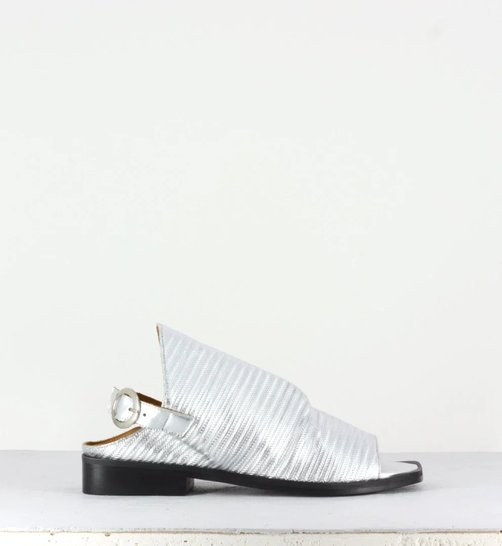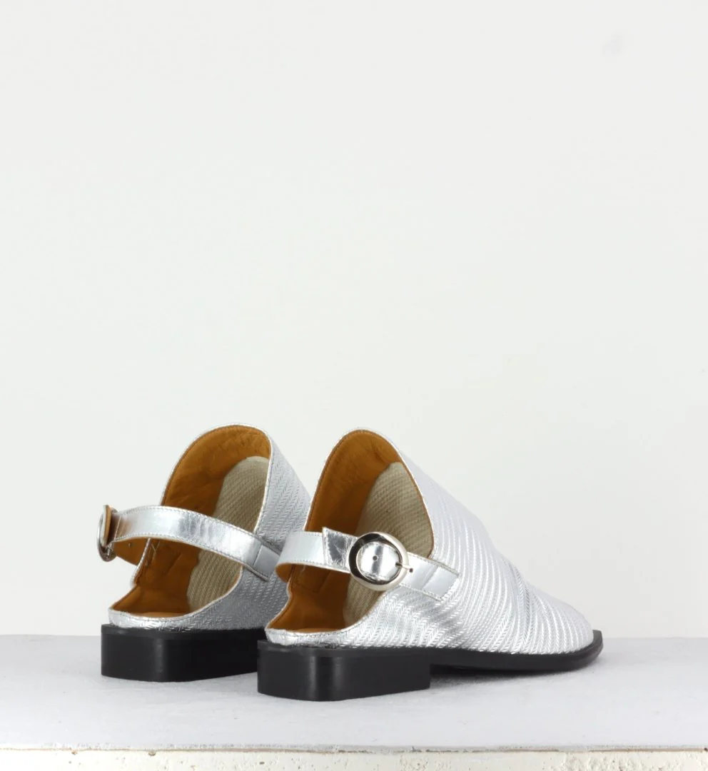 Sandales plates argentées Sandales en cuir non doublé gaufré argent montées sur une semelle à talonnette carrée en cuir noir. Conçues dans les Ateliers Italiens. Chausse normalement.