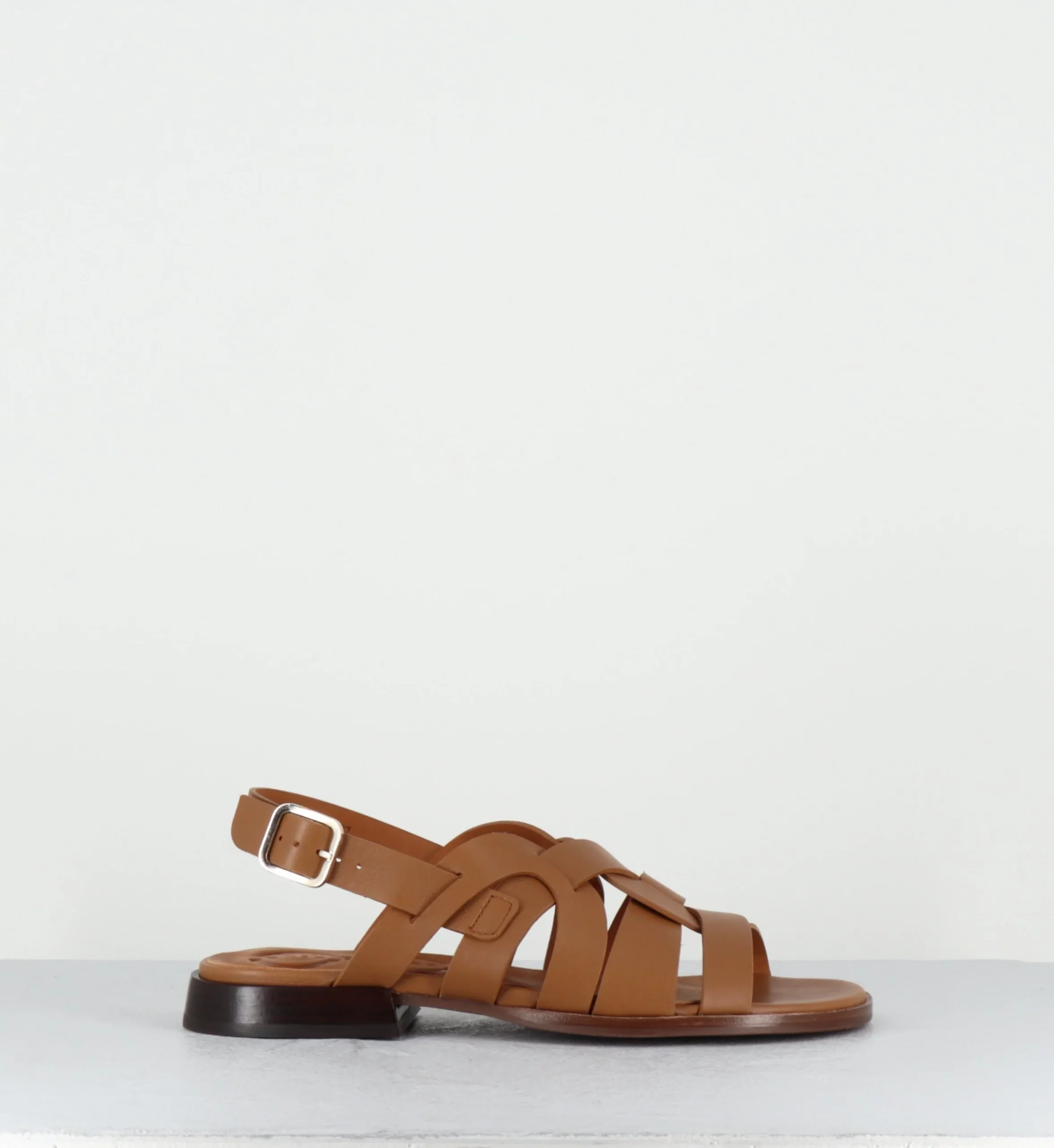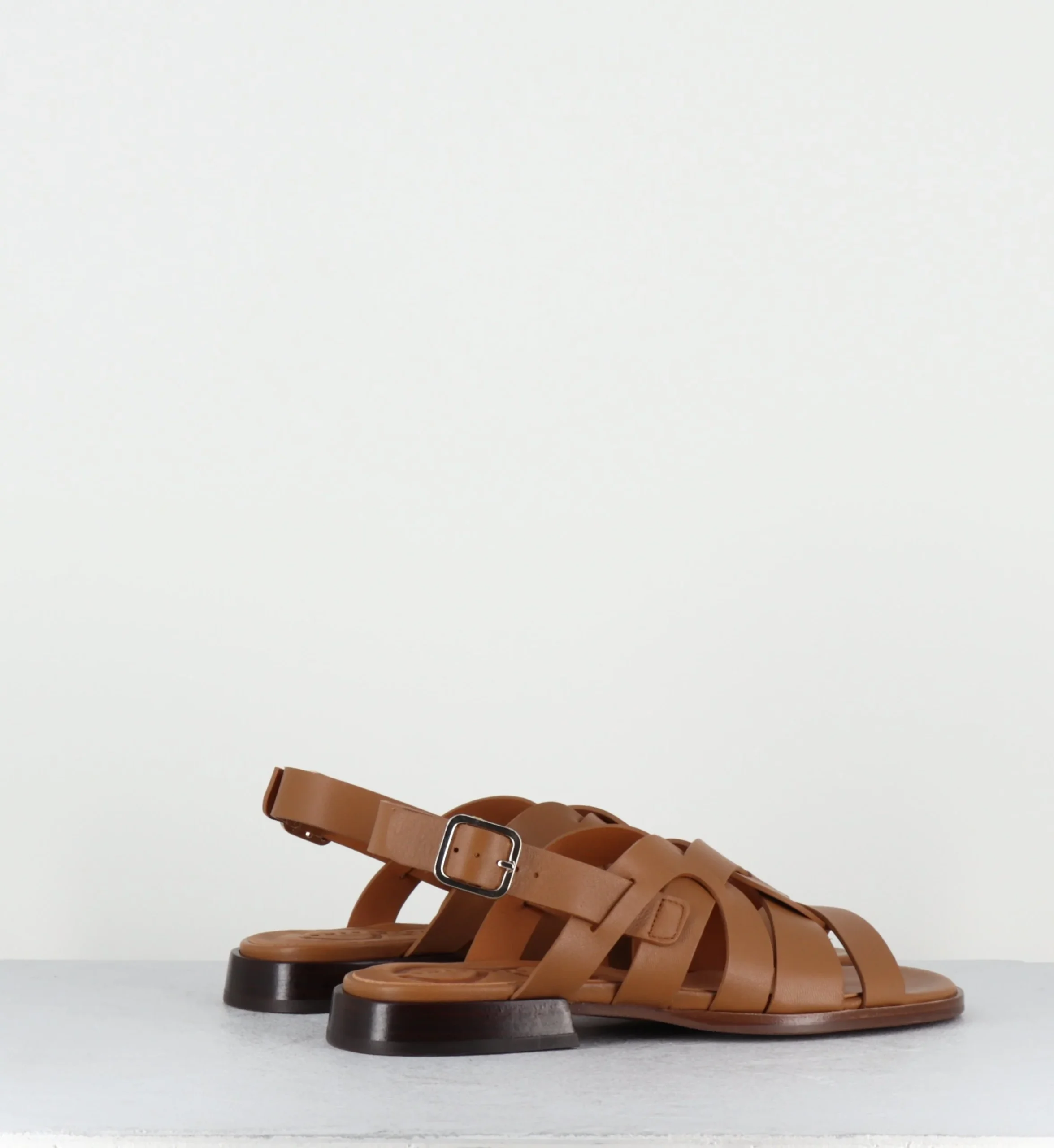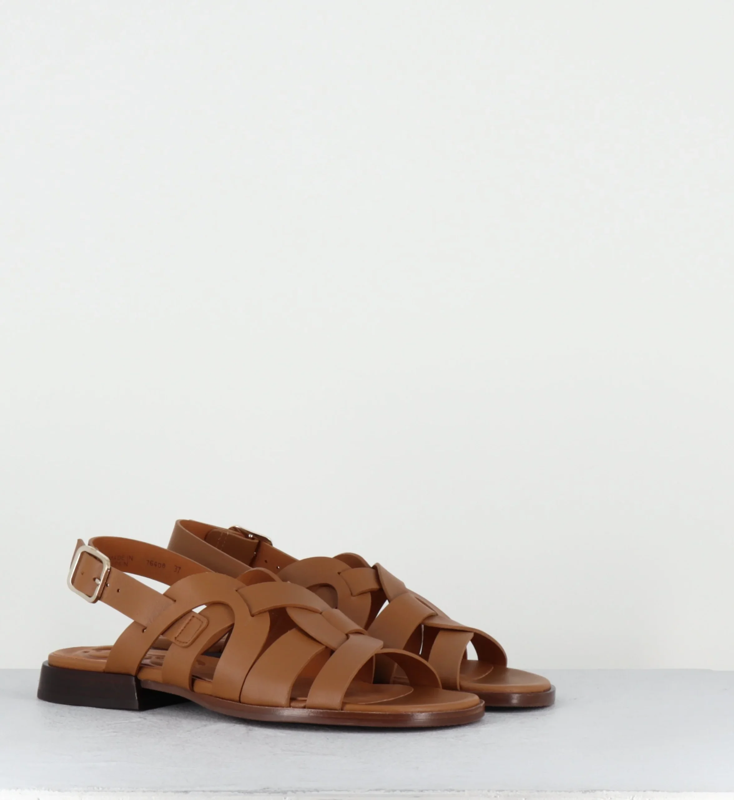 Sandales plates en cuir camel, multi-brides entrelacées avec lanière ajustable, montées sur un petit talon effet bois