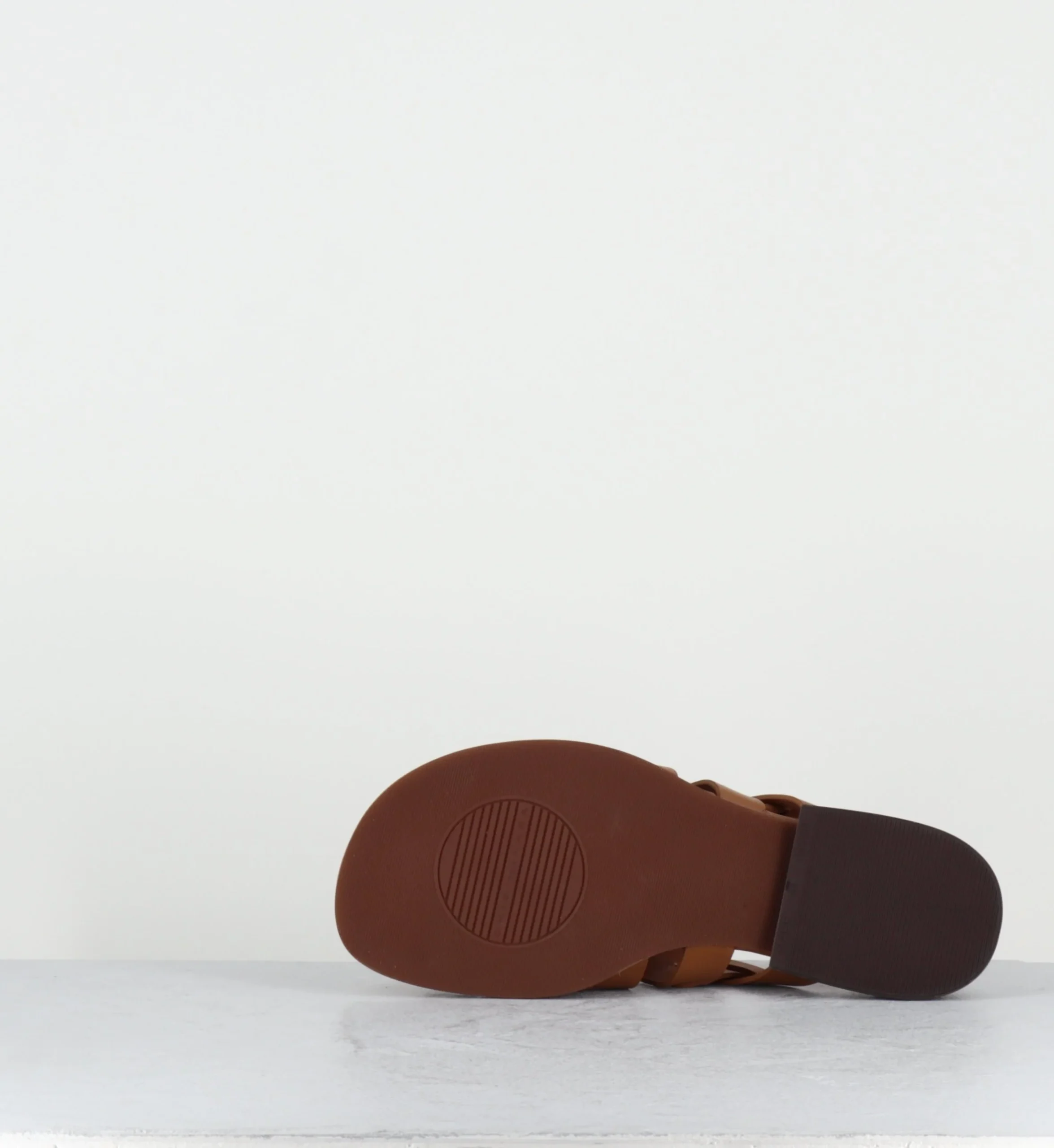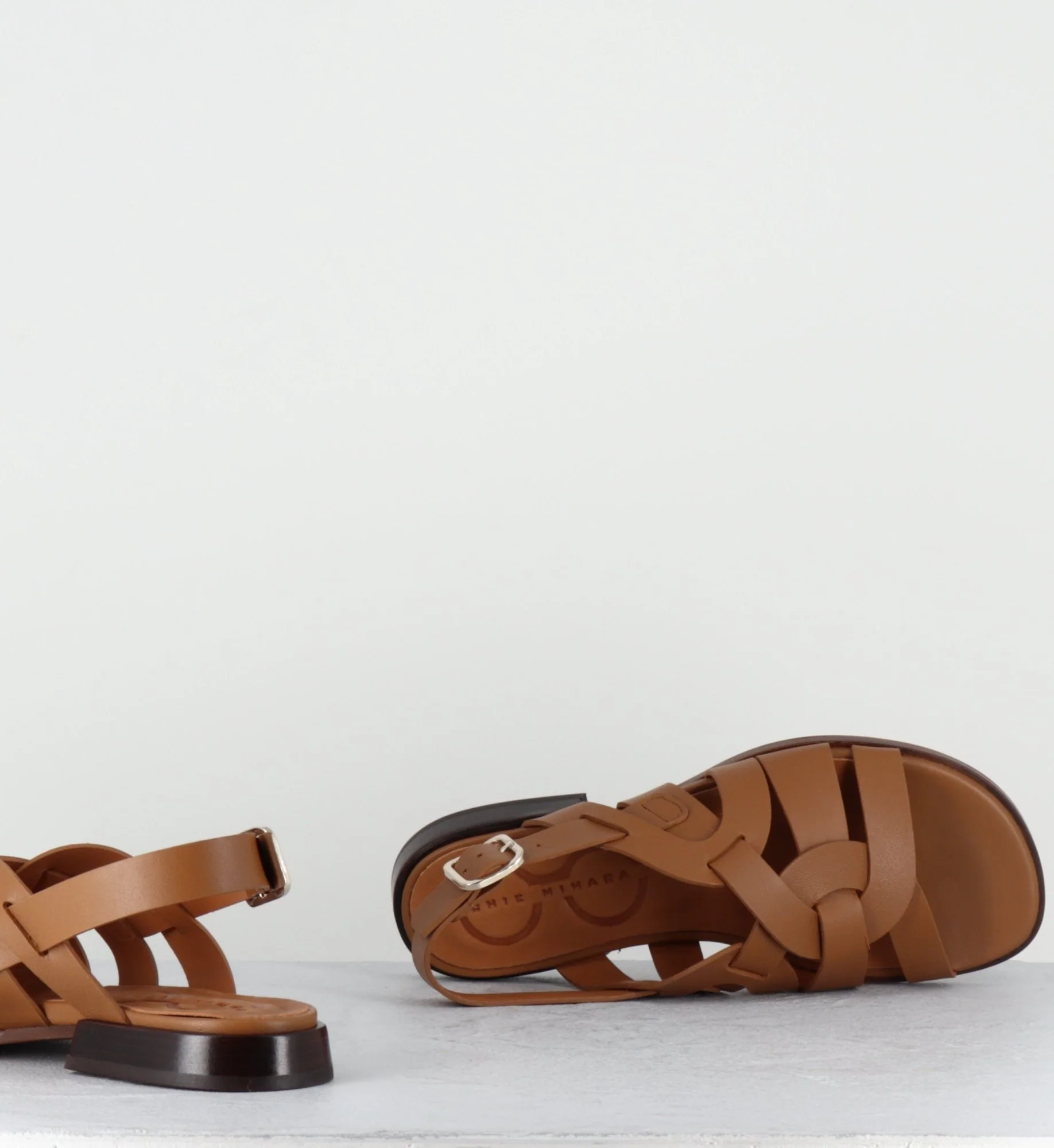 Sandales plates en cuir camel, multi-brides entrelacées avec lanière ajustable, montées sur un petit talon effet bois Fabrication Artisanale Espagnole – Ateliers Chie Mihara Chausse légèrement grand.