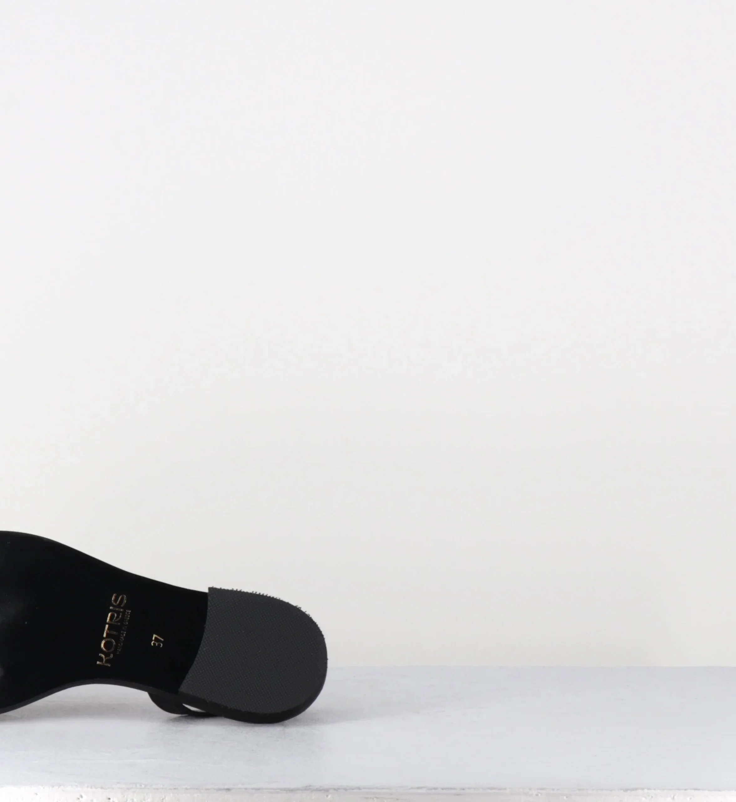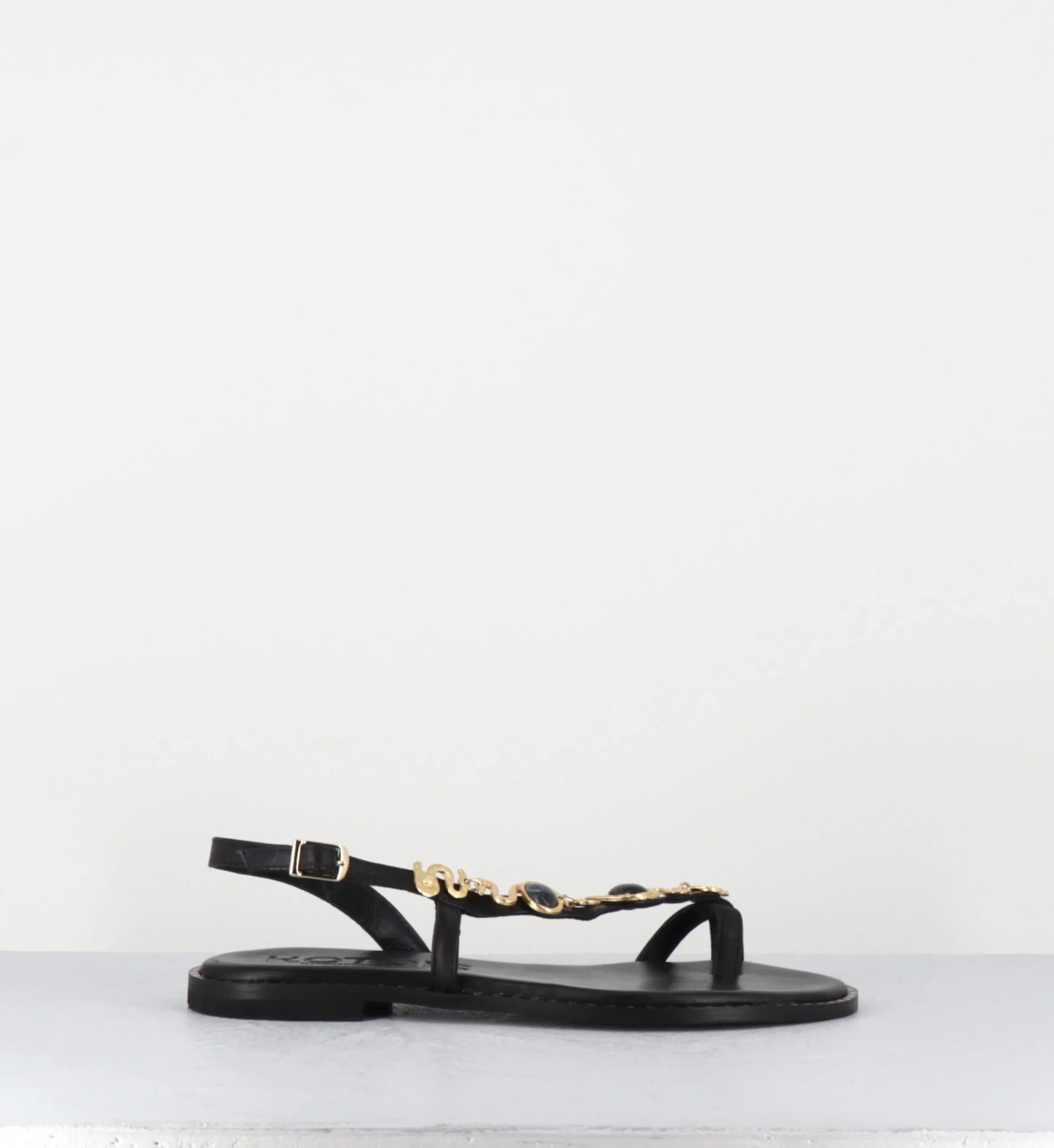 Sandales plates en cuir noir avec bride diagonale ornée d’un bijou doré et de pierres noires, forme tong ‘bague’, montées sur une semelle légère en cuir Fabriqué à la main en Grèce – Ateliers Kotris Chausse normalement
