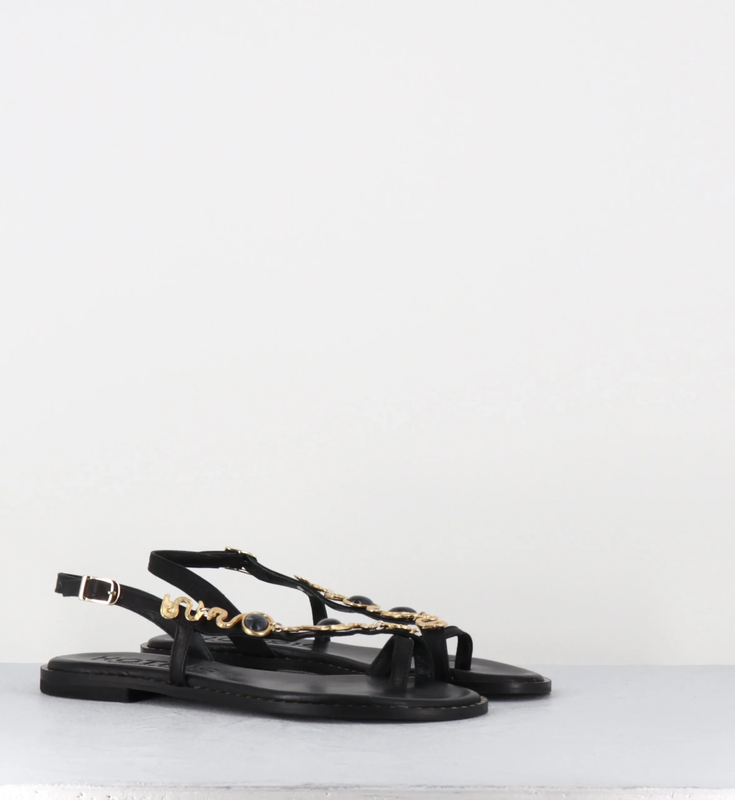 Sandales plates en cuir noir bride bijoux dorés & pierres noires – K817 BLACK