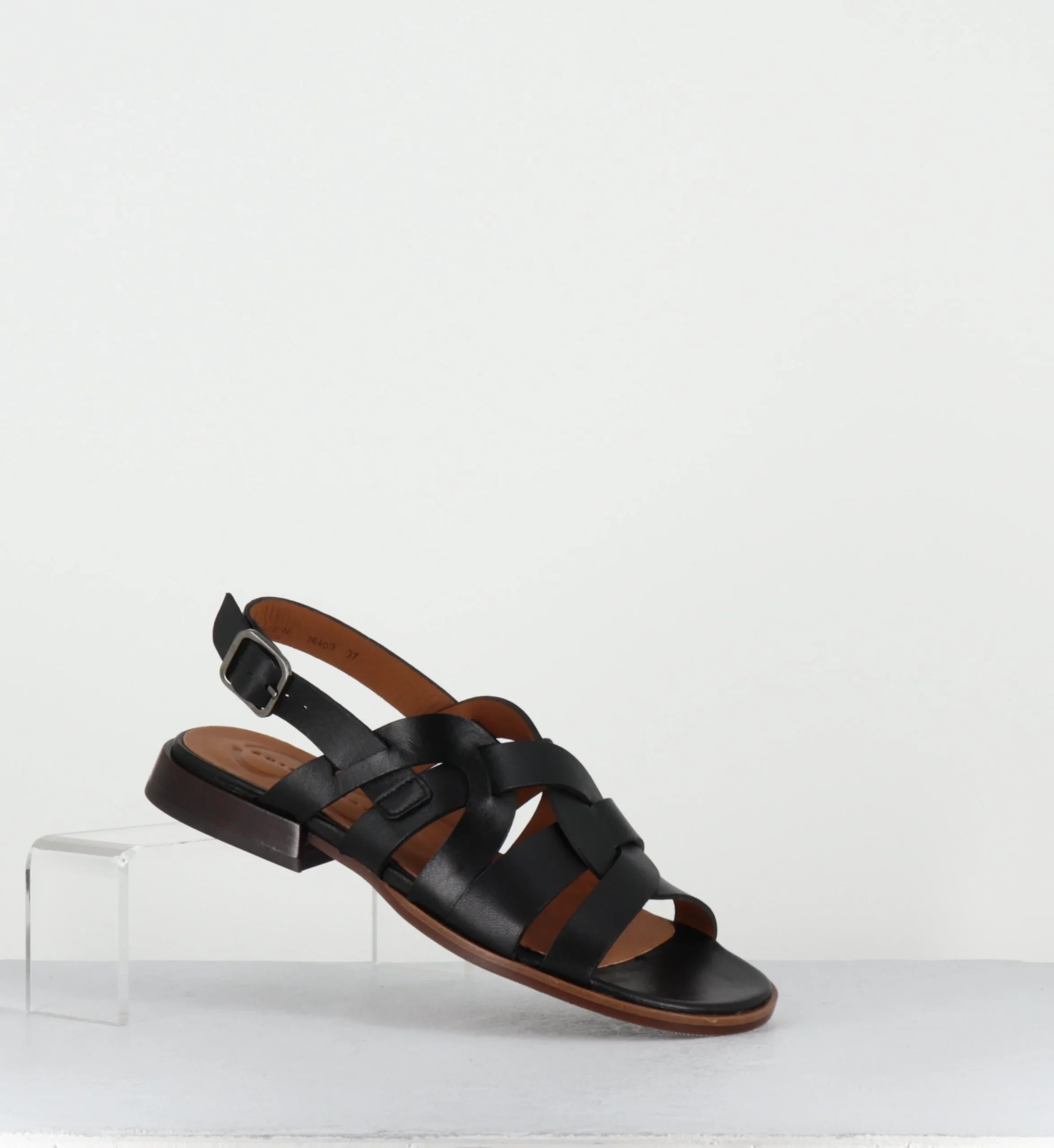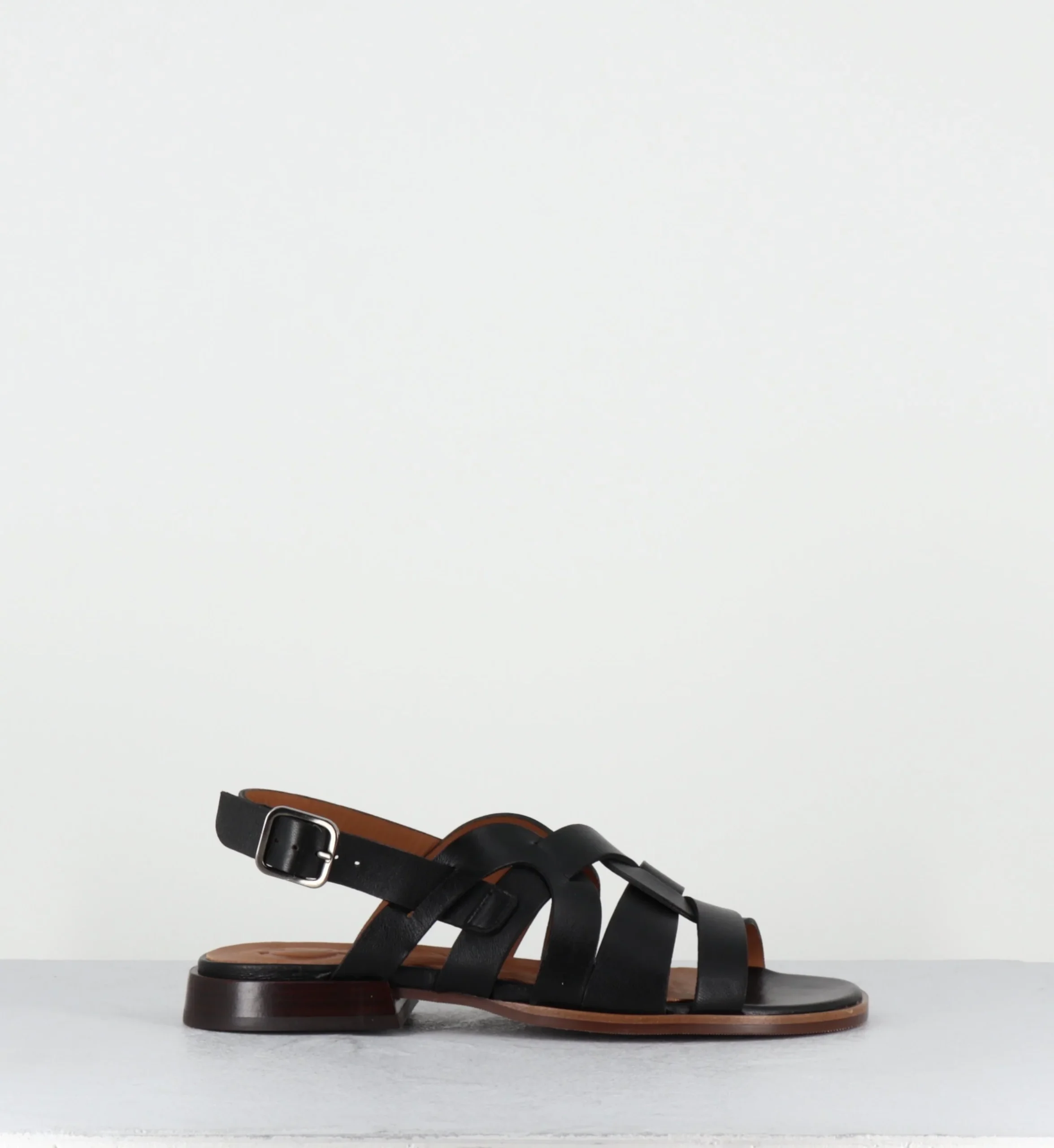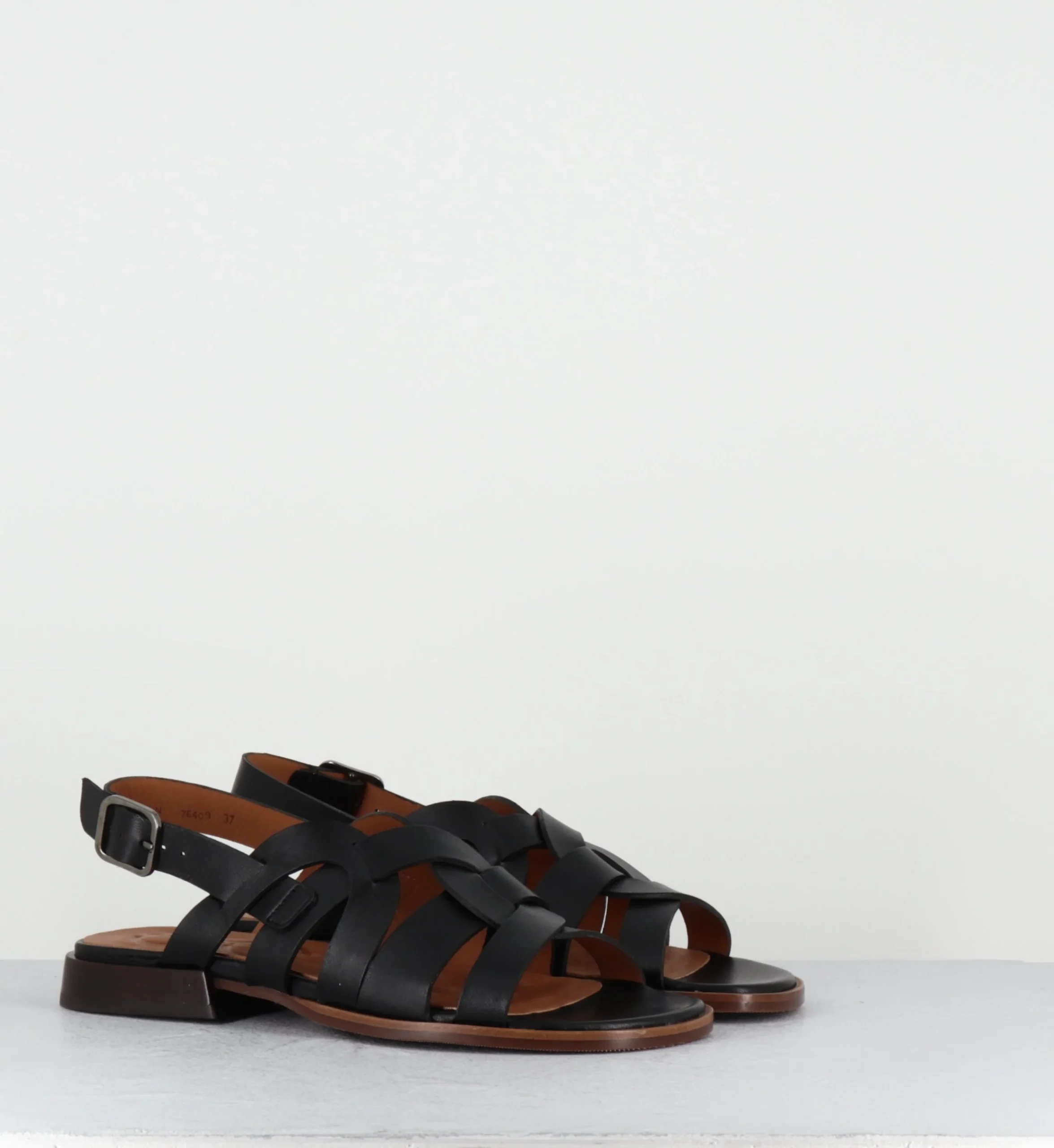 Sandales plates en cuir noir, multi-brides entrelacées avec lanière ajustable, montées sur un petit talon effet bois