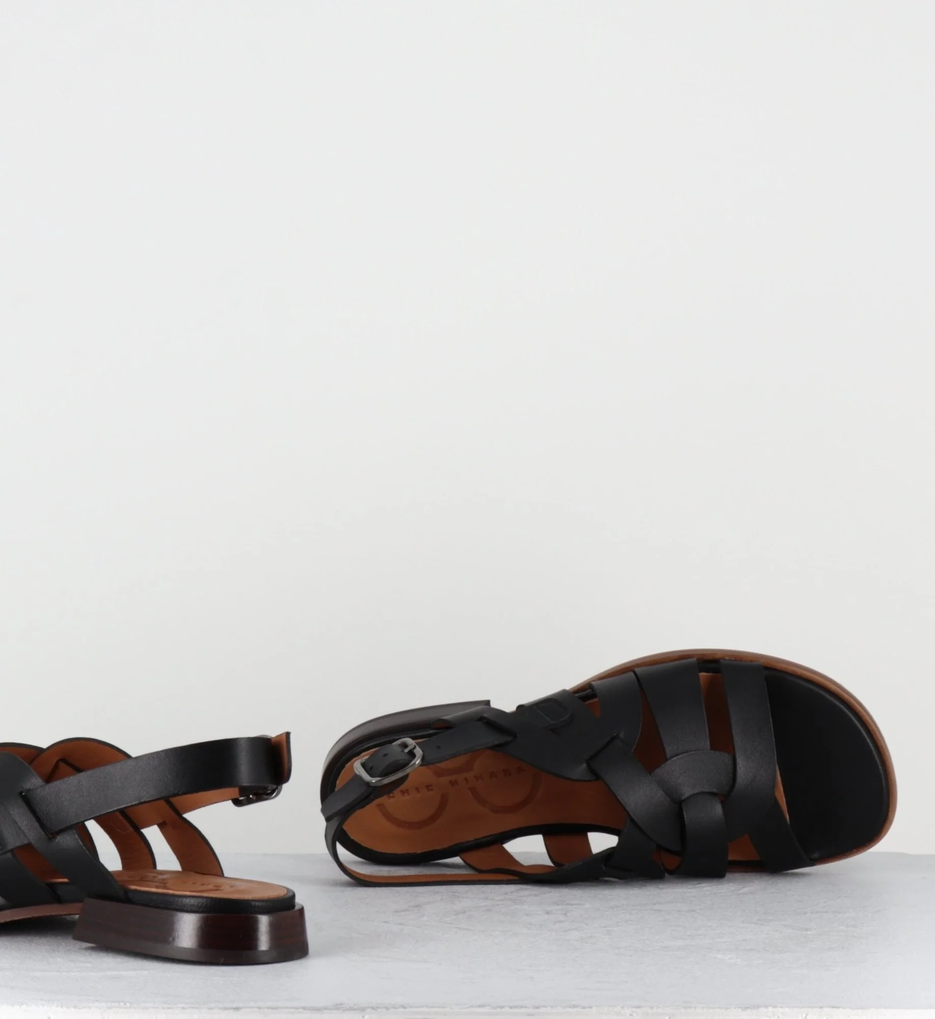 Sandales plates en cuir noir, multi-brides entrelacées avec lanière ajustable, montées sur un petit talon effet bois Fabrication Artisanale Espagnole – Ateliers Chie Mihara Chausse légèrement grand.