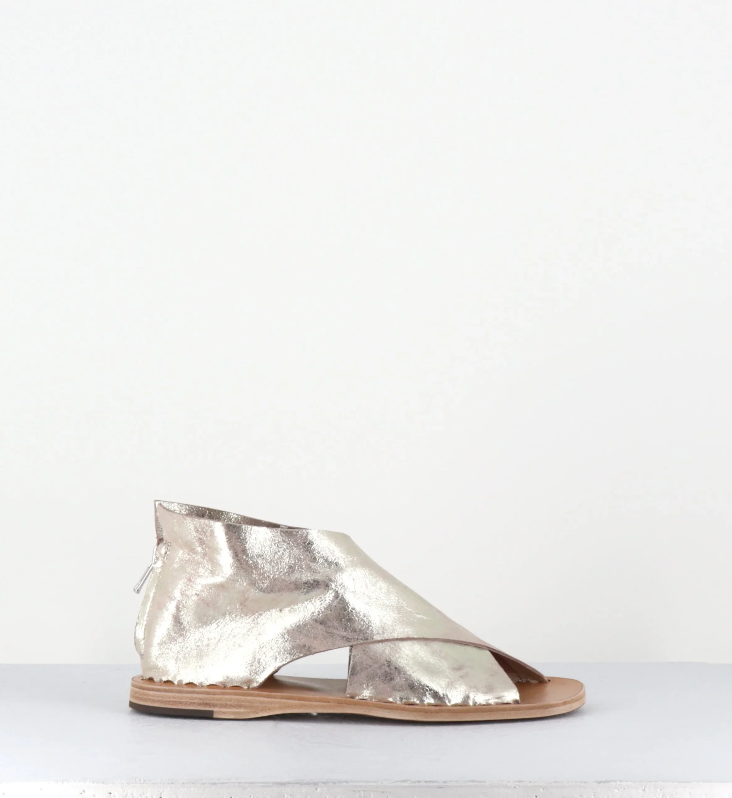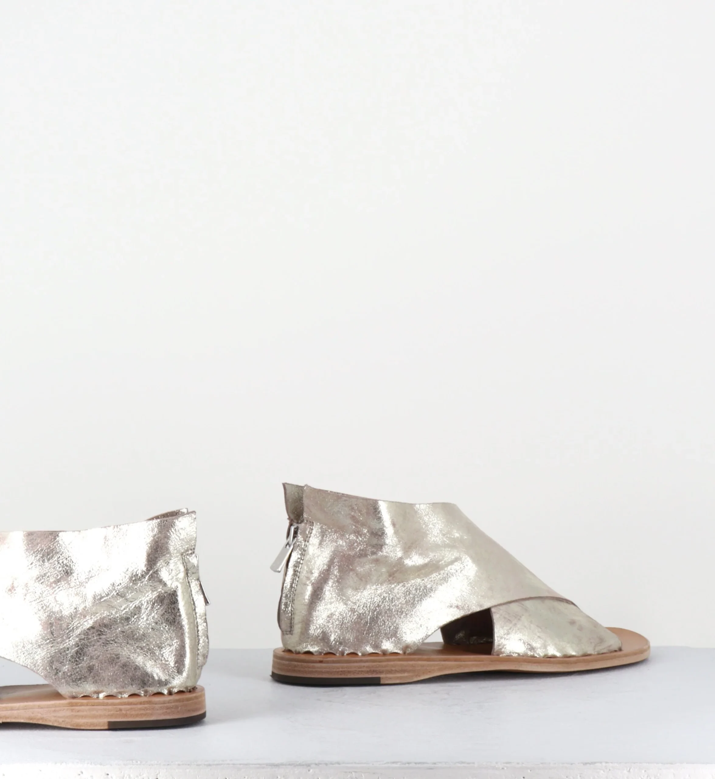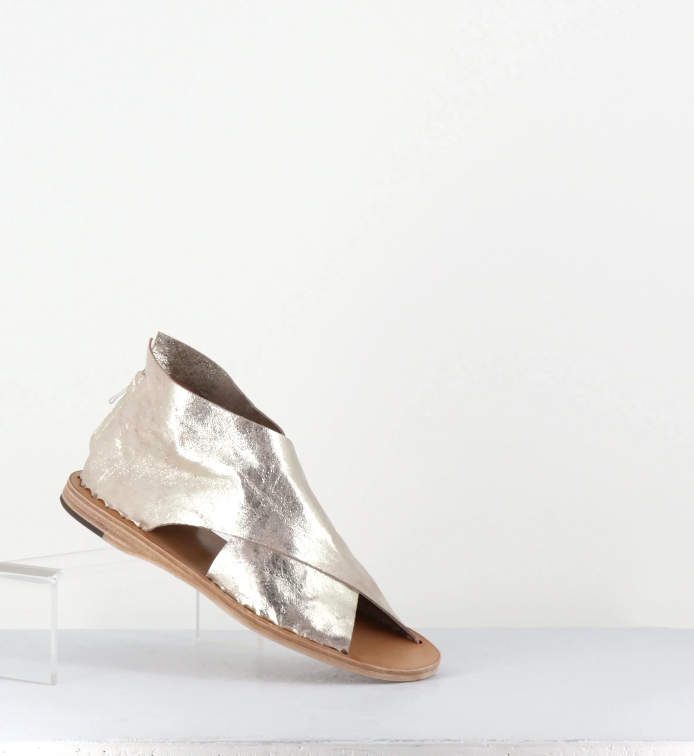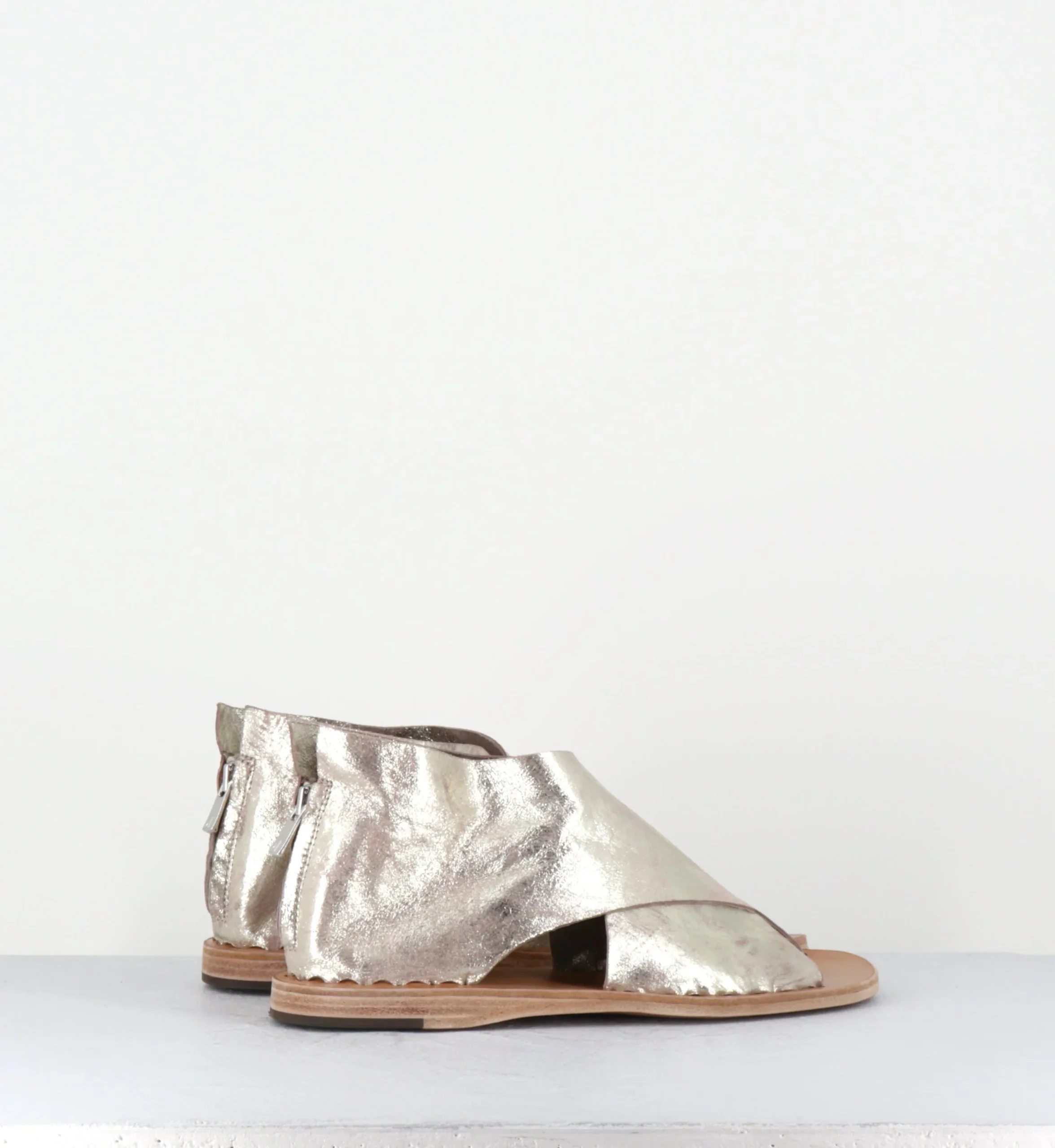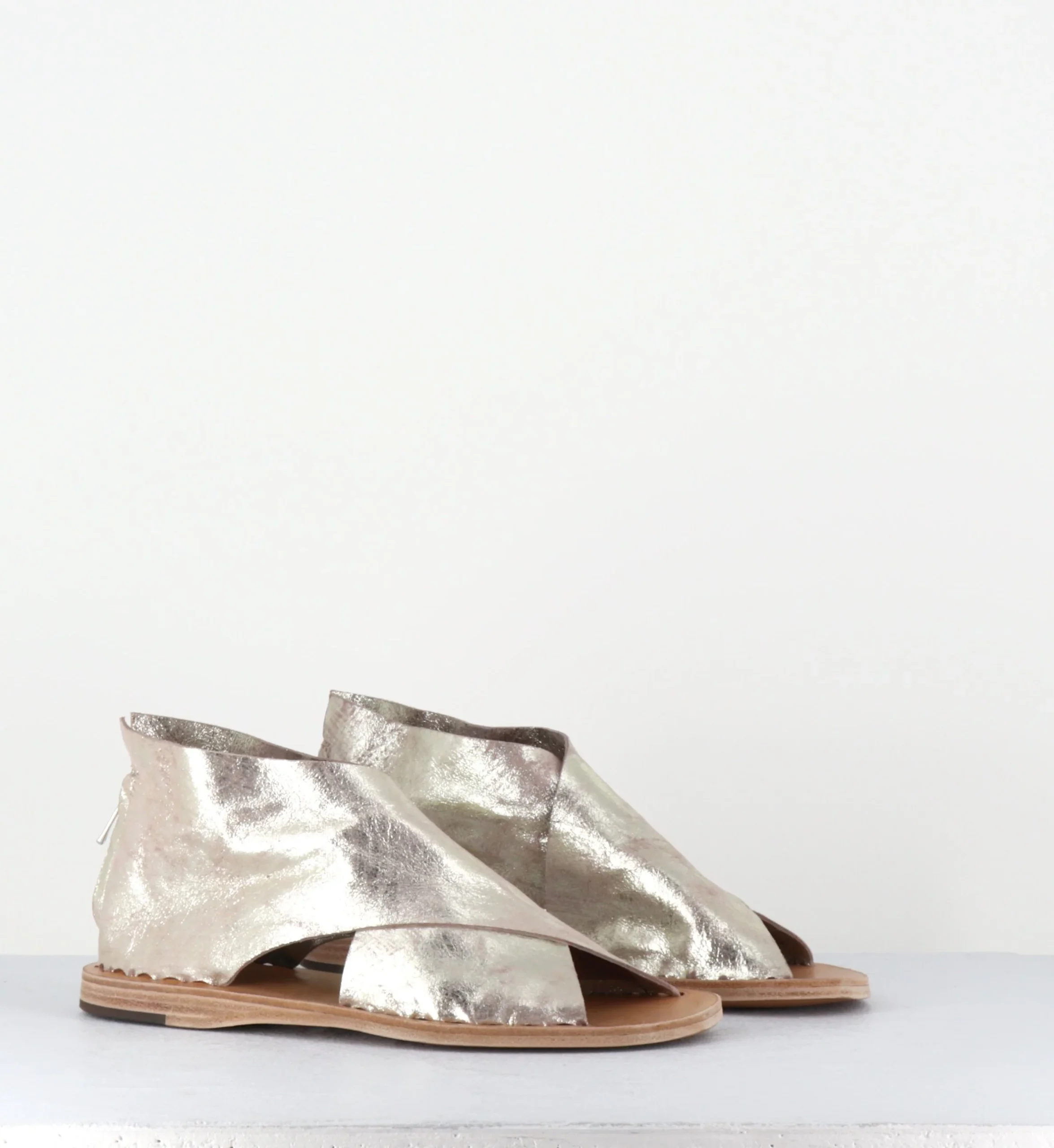 Sandales en cuir souple métallisé mélange de doré clair & d’argent « platine » non doublé avec découpe croisée, ligne minimaliste, montées sur une semelle cuir cousue main extrêmement souple.