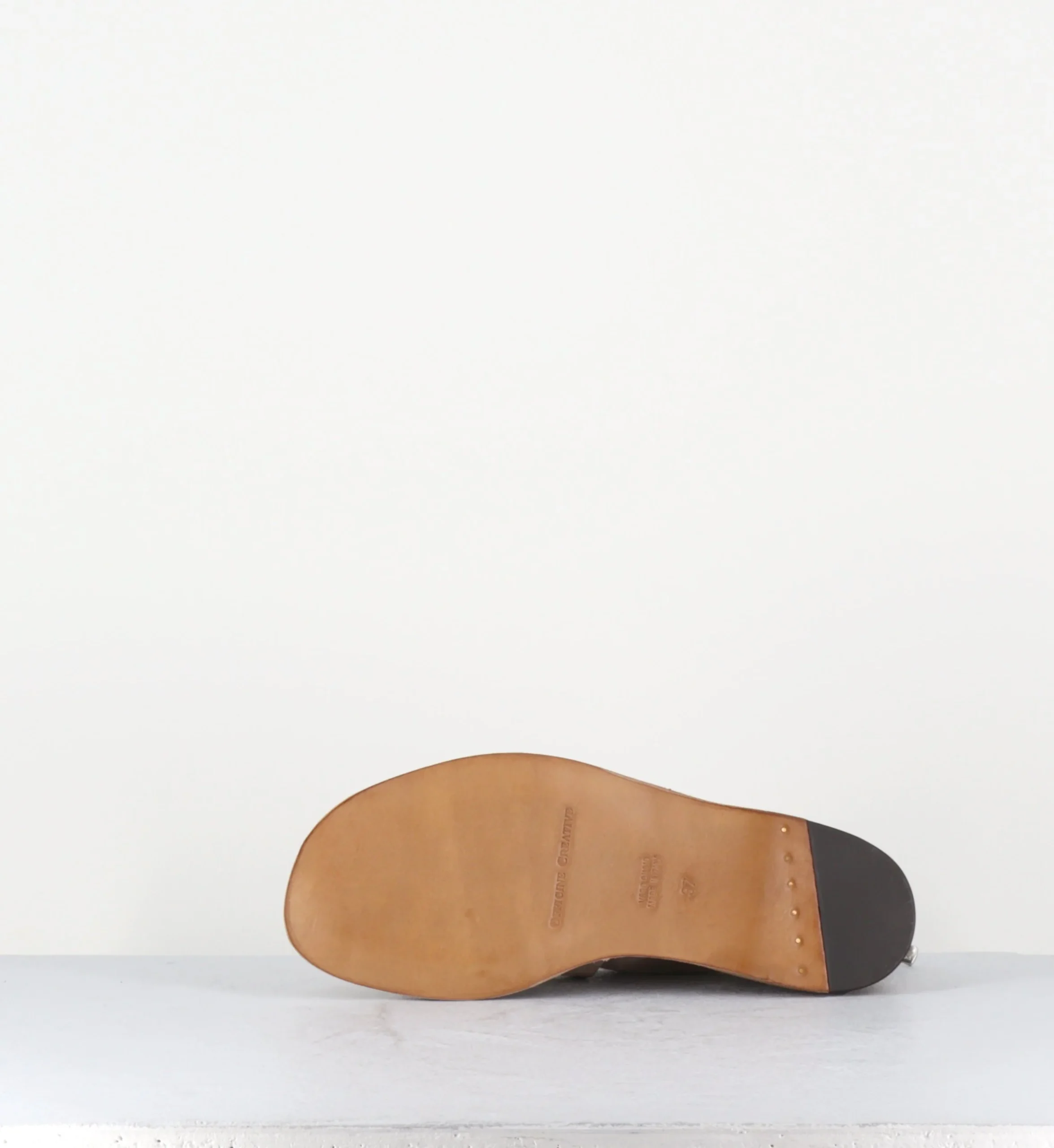 Sandales en cuir souple métallisé mélange de doré clair & d’argent « platine » non doublé avec découpe croisée, ligne minimaliste, montées sur une semelle cuir cousue main extrêmement souple. Fabrication Artisanale Italienne – Ateliers Officine Creative Chausse légèrement grand