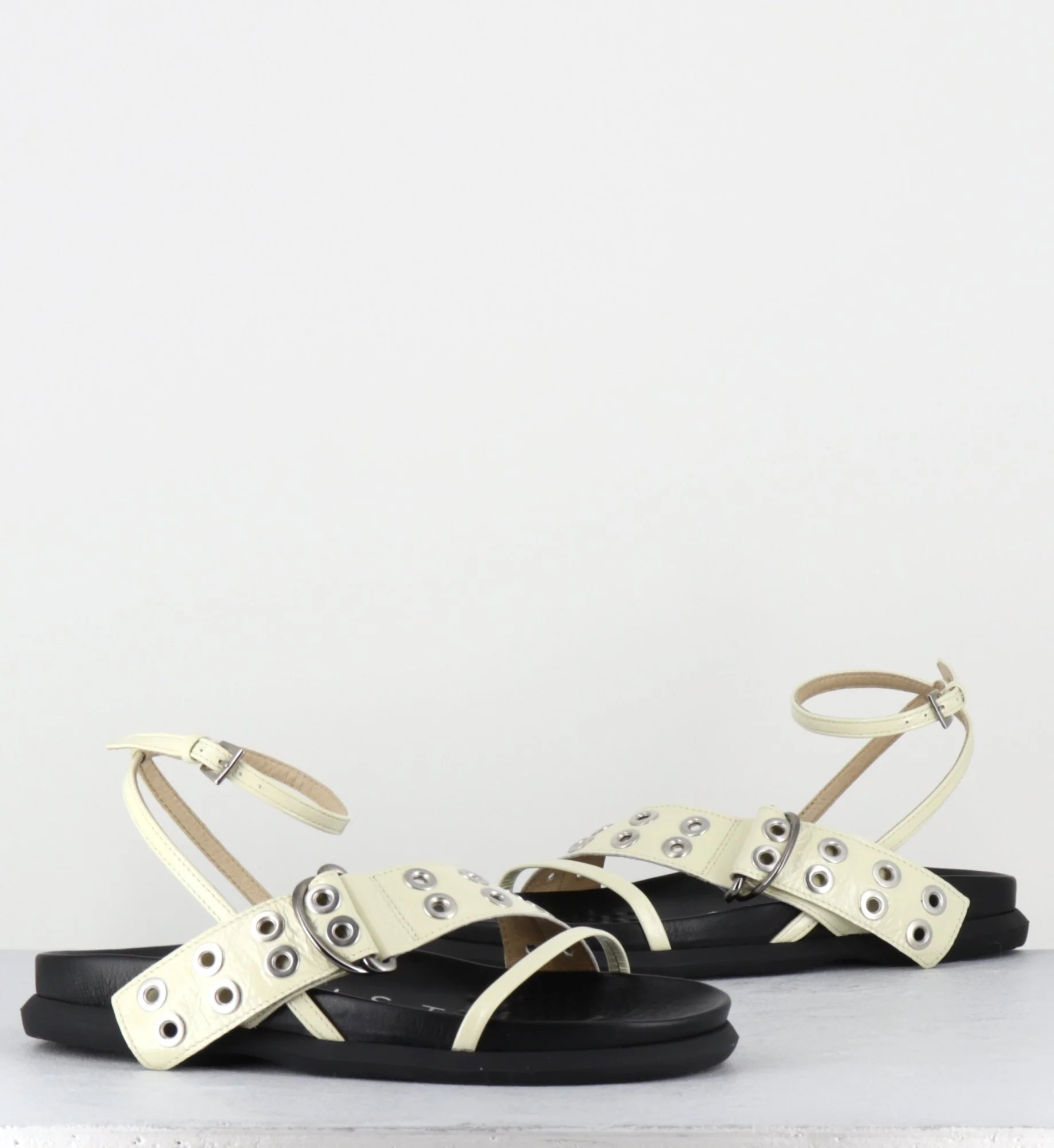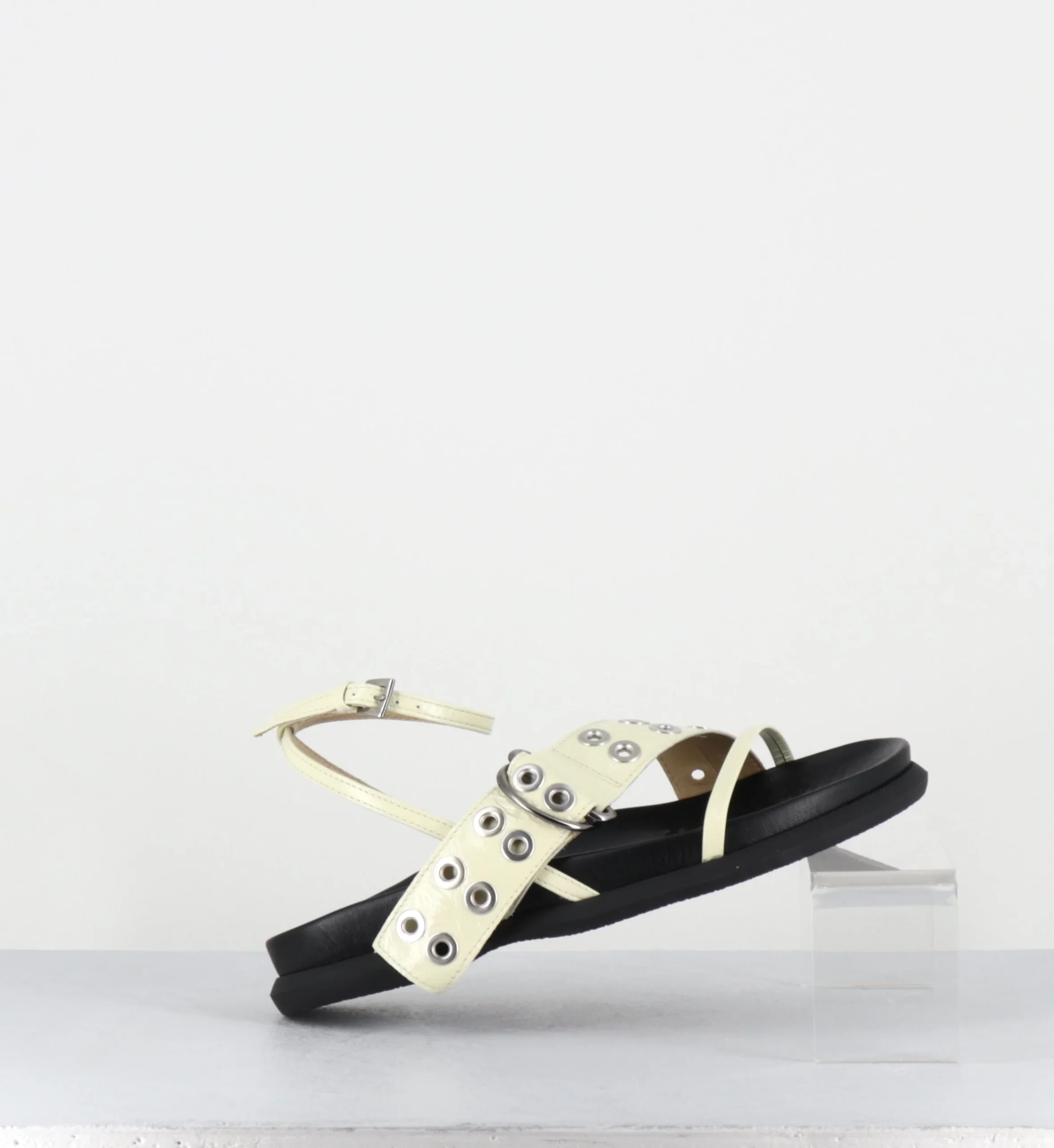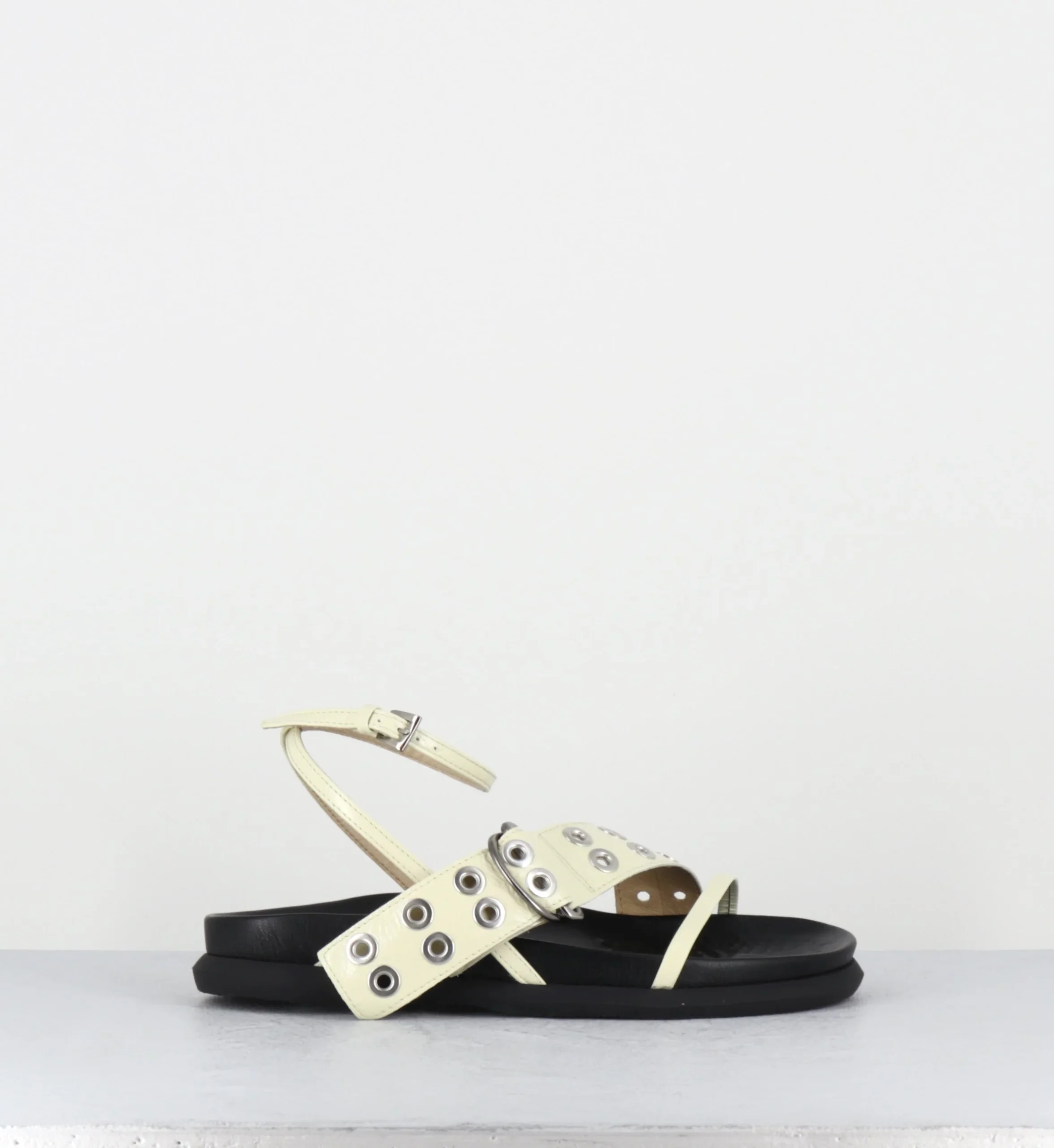 Sandales plates en cuir vernis crème, large bride ceinture à oeillets, montées sur une semelle anatomique confortable